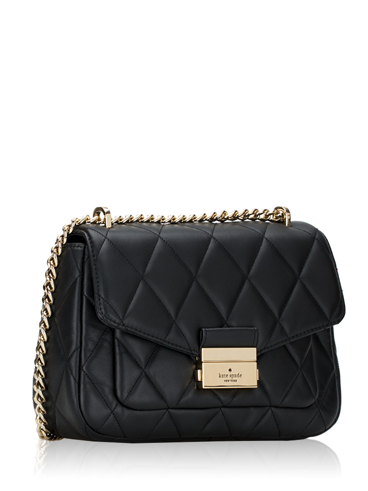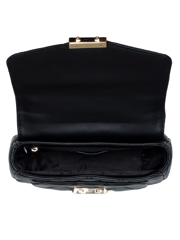 Made of quilted smooth leather with signature two way spade jacquard lining. It features an open push lock closure, gold tone hardware, 1 zip pocket, 1 front slip pocket, and 1 rear eksterior slip pocket.