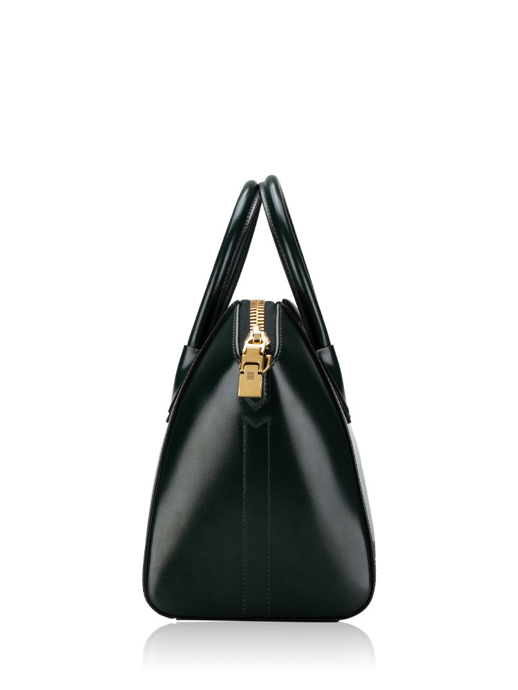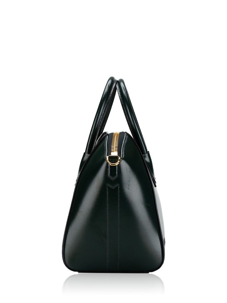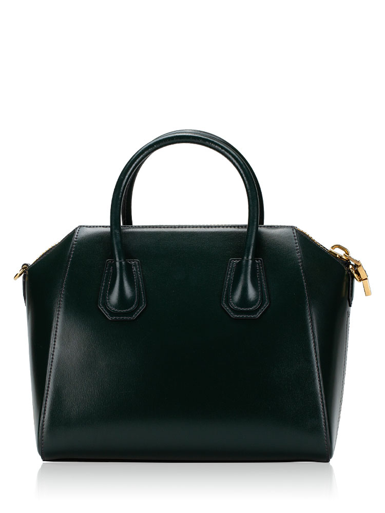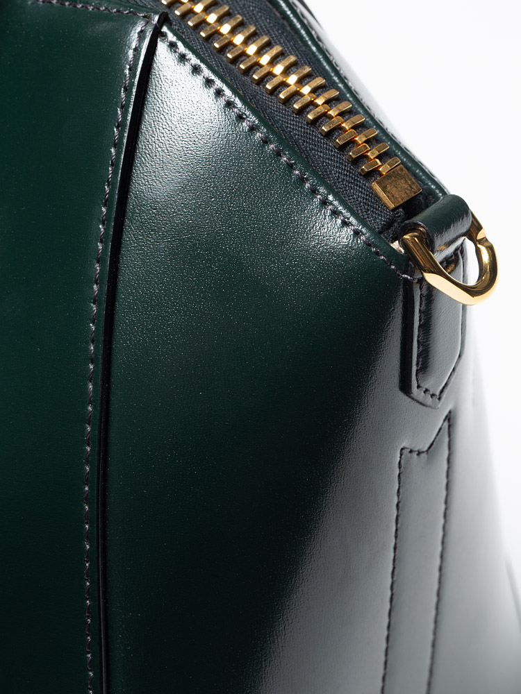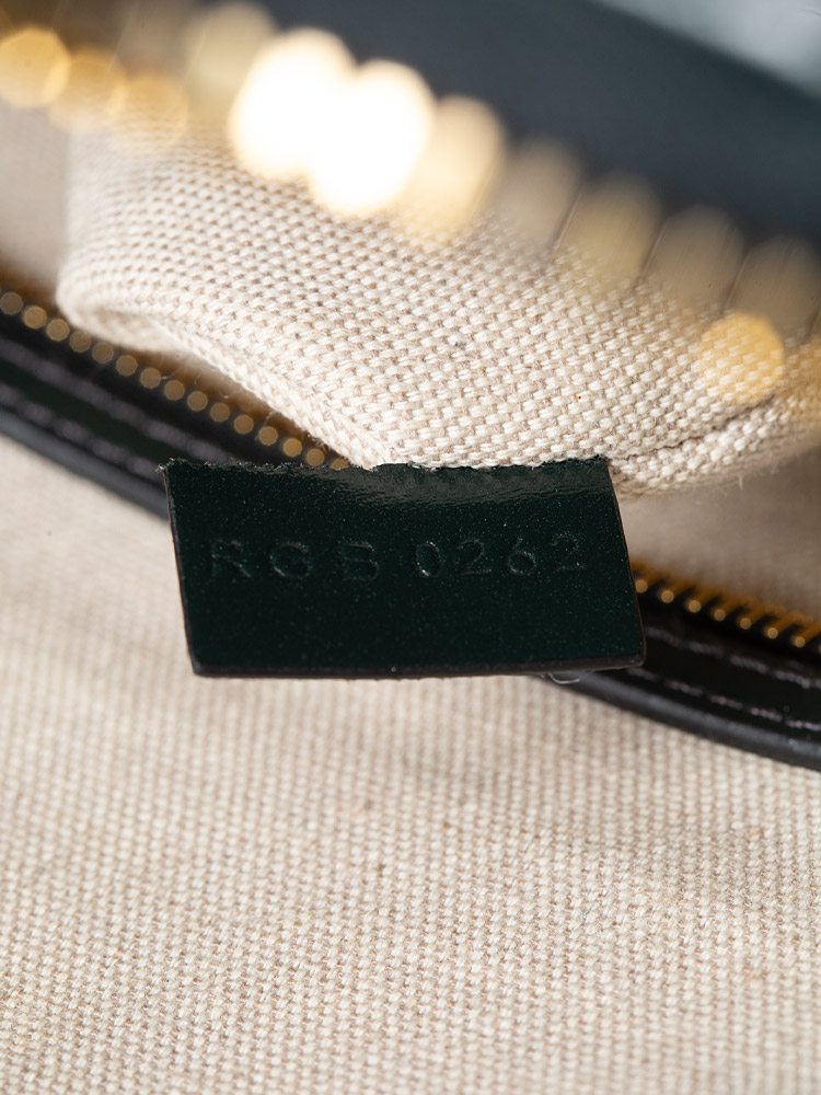 This bag is crafted of smooth calfskin leather. The bag features rolled leather top handles and a permanent leather shoulder strap with polished gold clasps. The top opens to a fabric interior with a zipper and patch pockets.