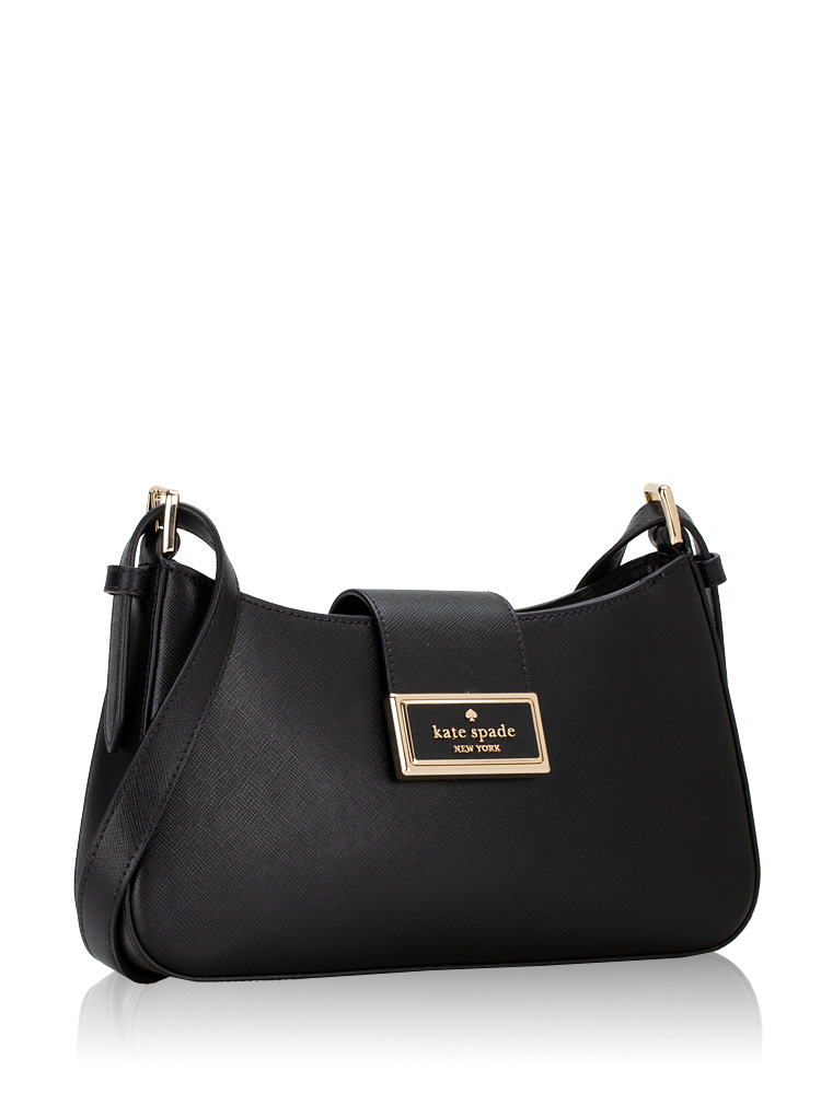Made of saffiano PVC with logo polyester lining. The bag features an open button magnetic with zip closure, gold tone hardware, one zip pocket and removable and adjustable shoulder wear.