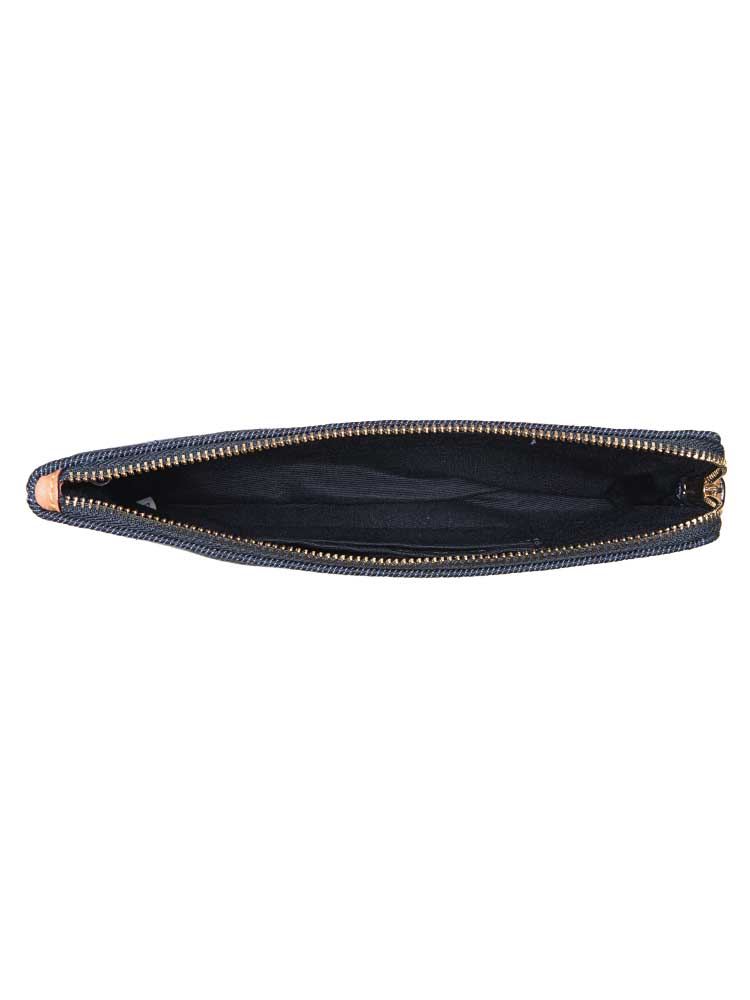 Made of canvas denim The wallet features a zip closure that opens to fabric lining with two slip pocket.