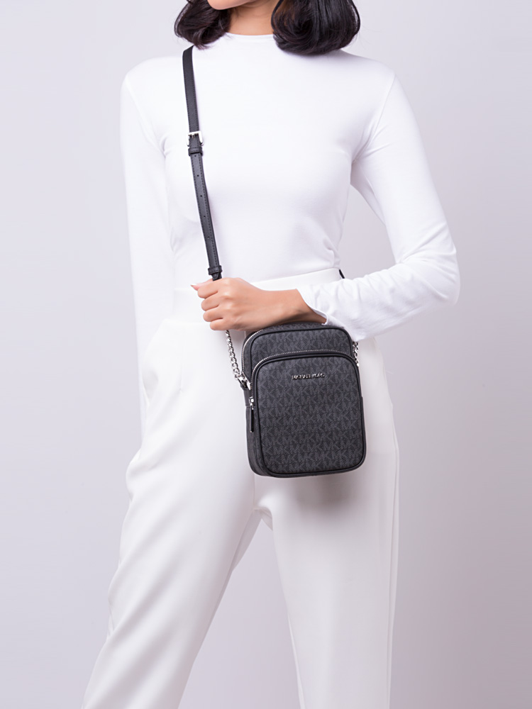 Our Signature-print Jet Set Travel bag will be your new on-the-go companion. Its slim, compact profile makes it effortlessly portable, while a compartmentalized interior organizes small essentials with ease.