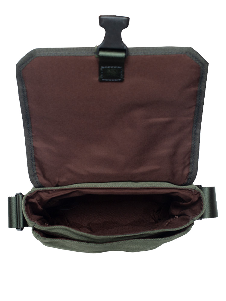 Made of polyester oxford and leather trim. The bag features a push lock closure that opens to polyester lining with interior two slip pockets and exterior one slip pocket at front, one slip pocket at back.