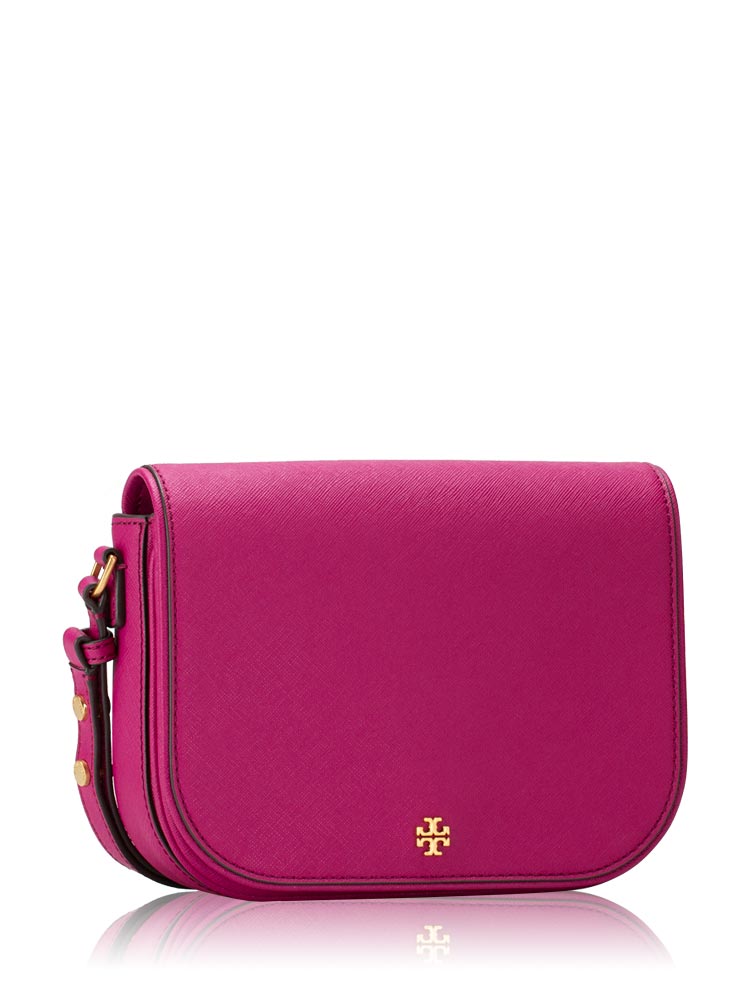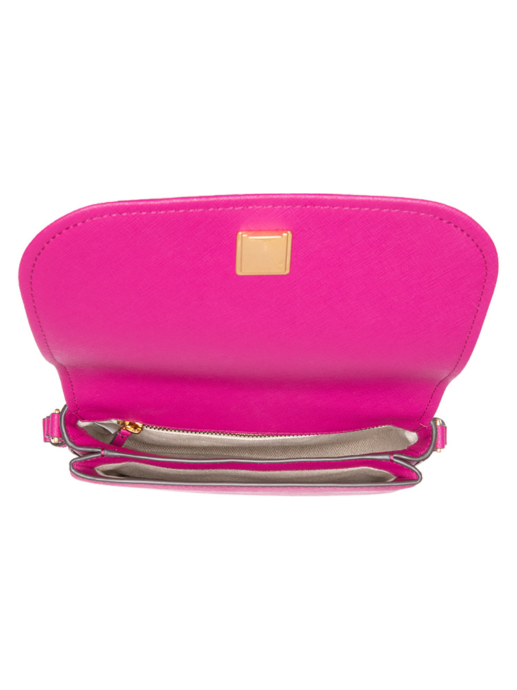 Made of saffiano leather. The bag features a magnetic closure that opens to fabric lining with interior one zip pocket, one slip pocket, one slip compartment at front and exterior one slip pocket at back.