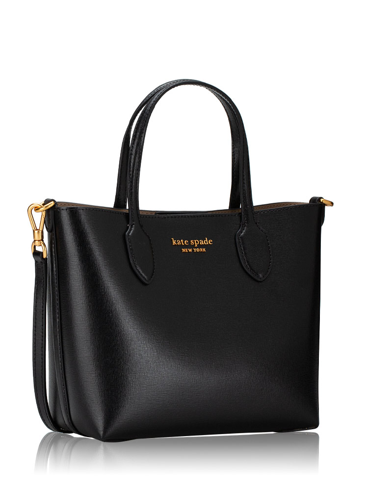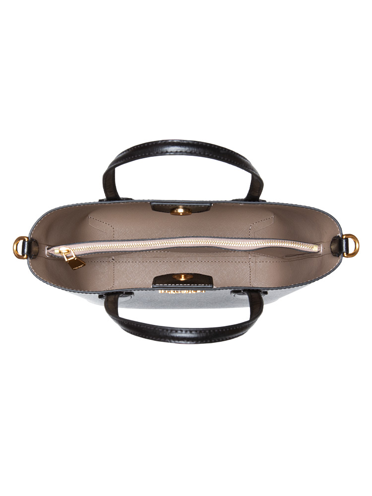 Made of saffiano leather. The bag features a magnetic snap closure that opens to faille lining with interior one middle zip pocket and two slip multifunction.