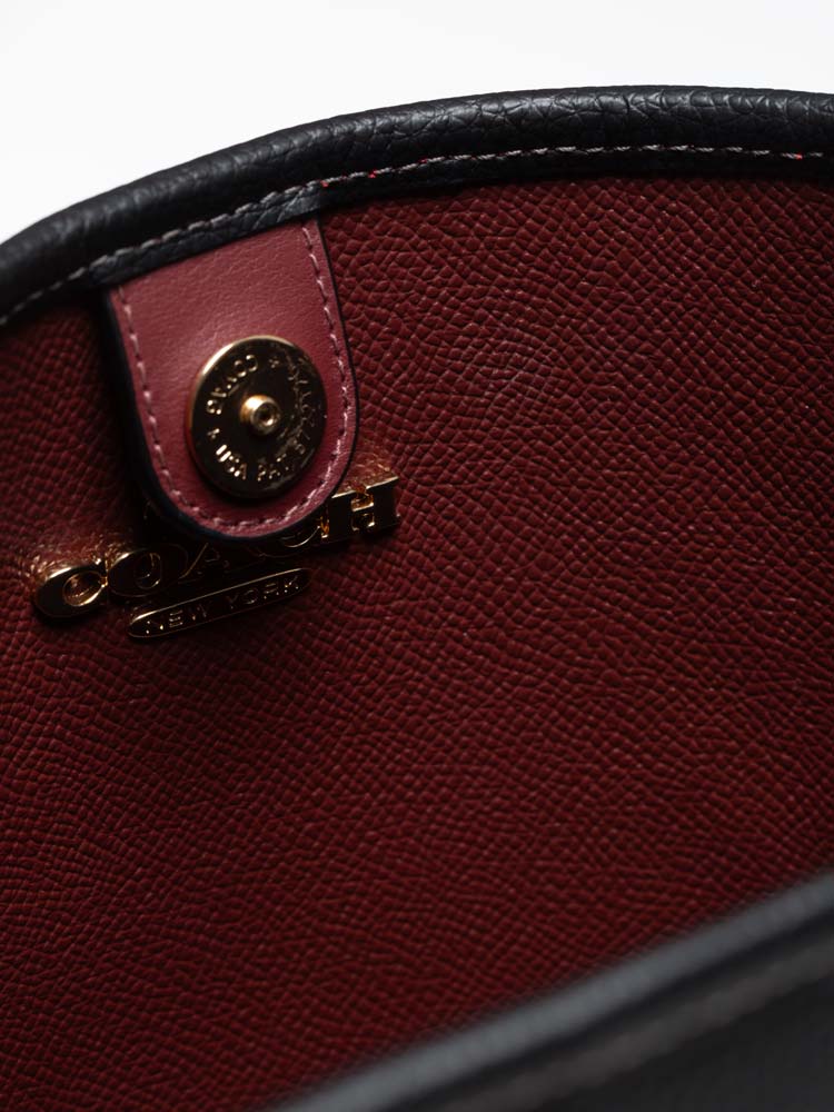 Made of pebble leather. The bag features a magnetic closure that opens to crossgrain leather lining and fabric lining with interior one zip pocket.
