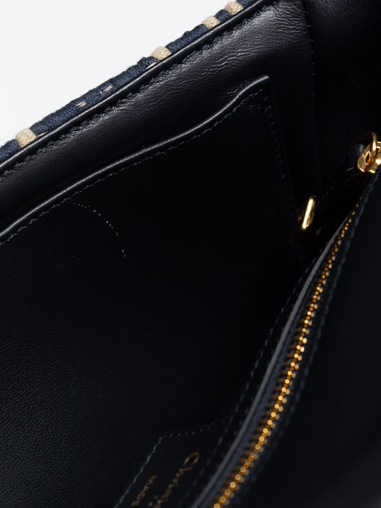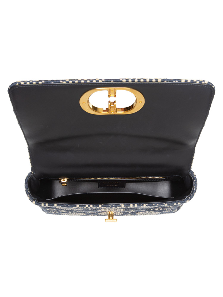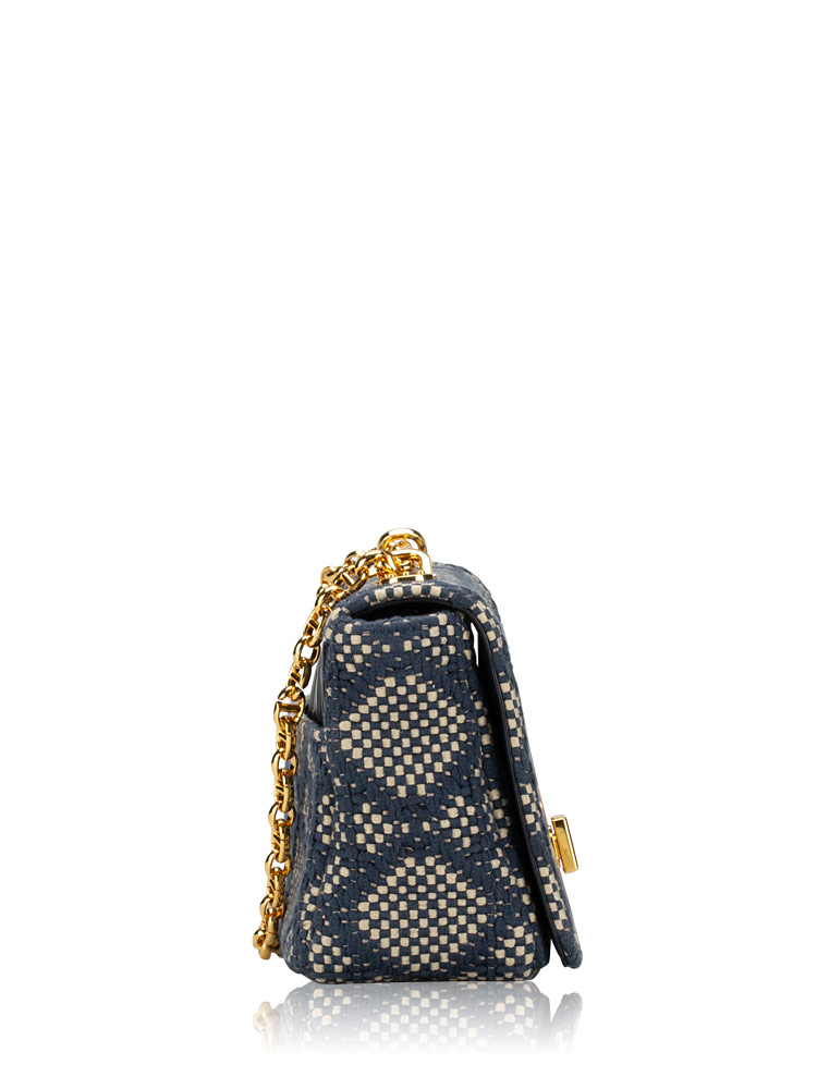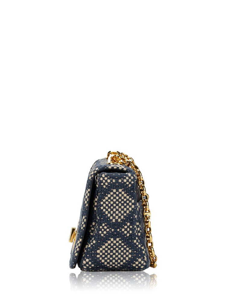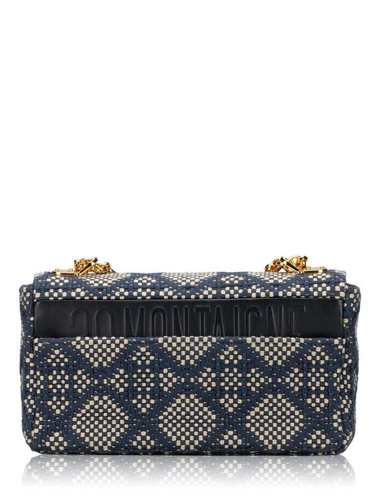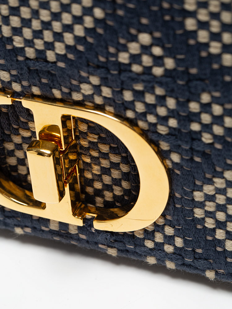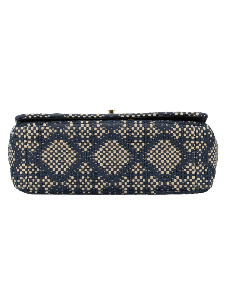 Crafted of tweed cannage fabric. It features an adjustable strap and polished metal hardware. It opens to a leather interior with zipper and patch pockets.