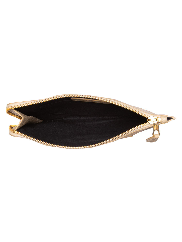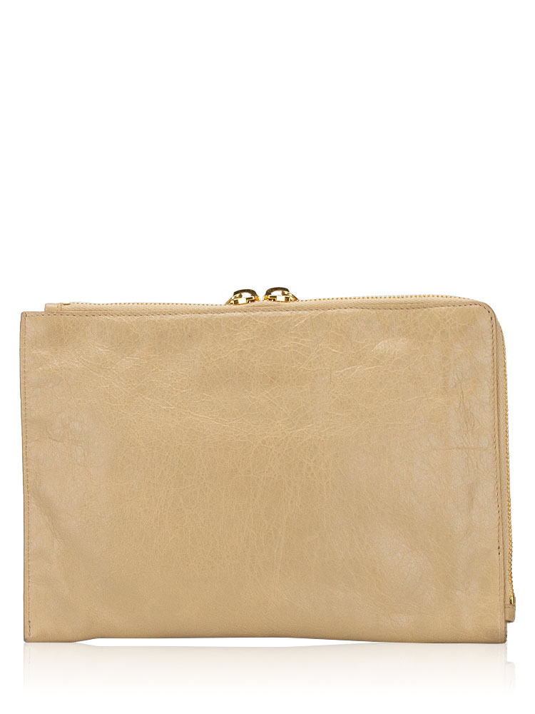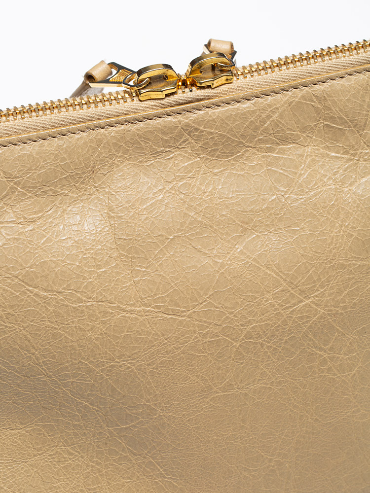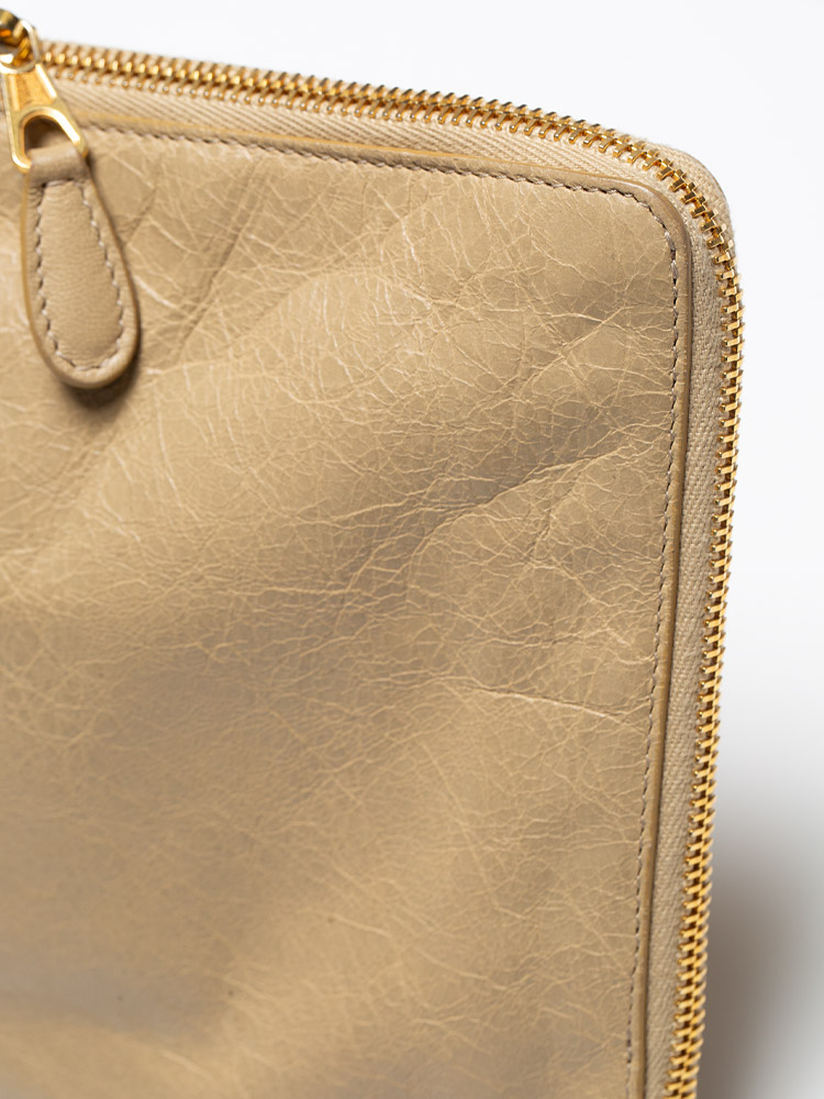 Crafted of distressed lambskin leather. Features a facing zipper pocket, leather patches and belts, and textured gold hardware including buckles and decorative studs. The wrap-around zippers open to a fabric interior with a patch pocket.