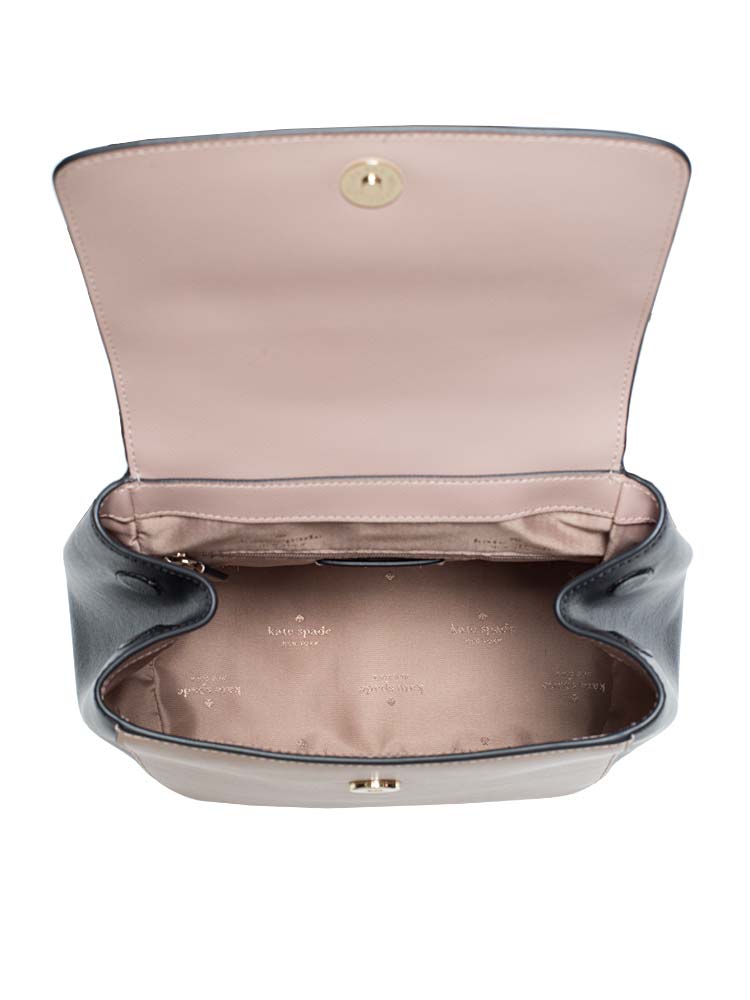 Made of saffiano leather. The backpack feature a magnetic snap closure that opens to polyester lining with interior one zip pocket, one slip pocket.
