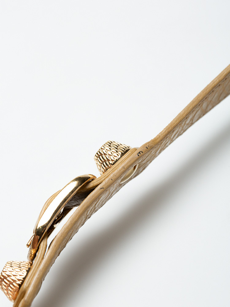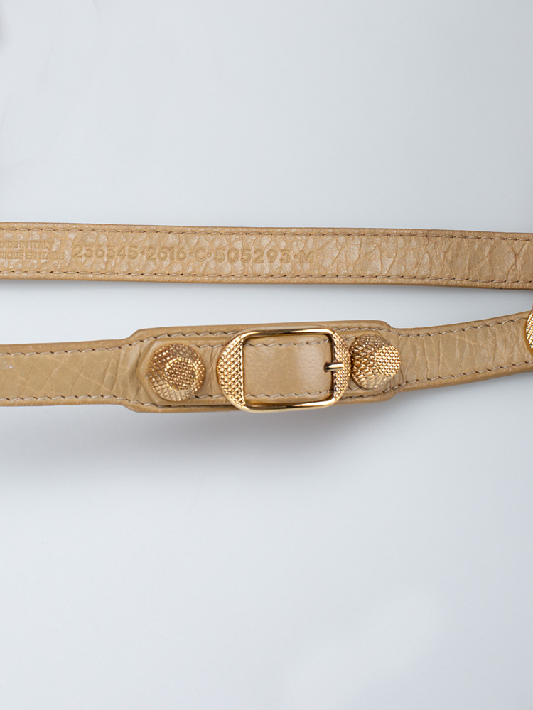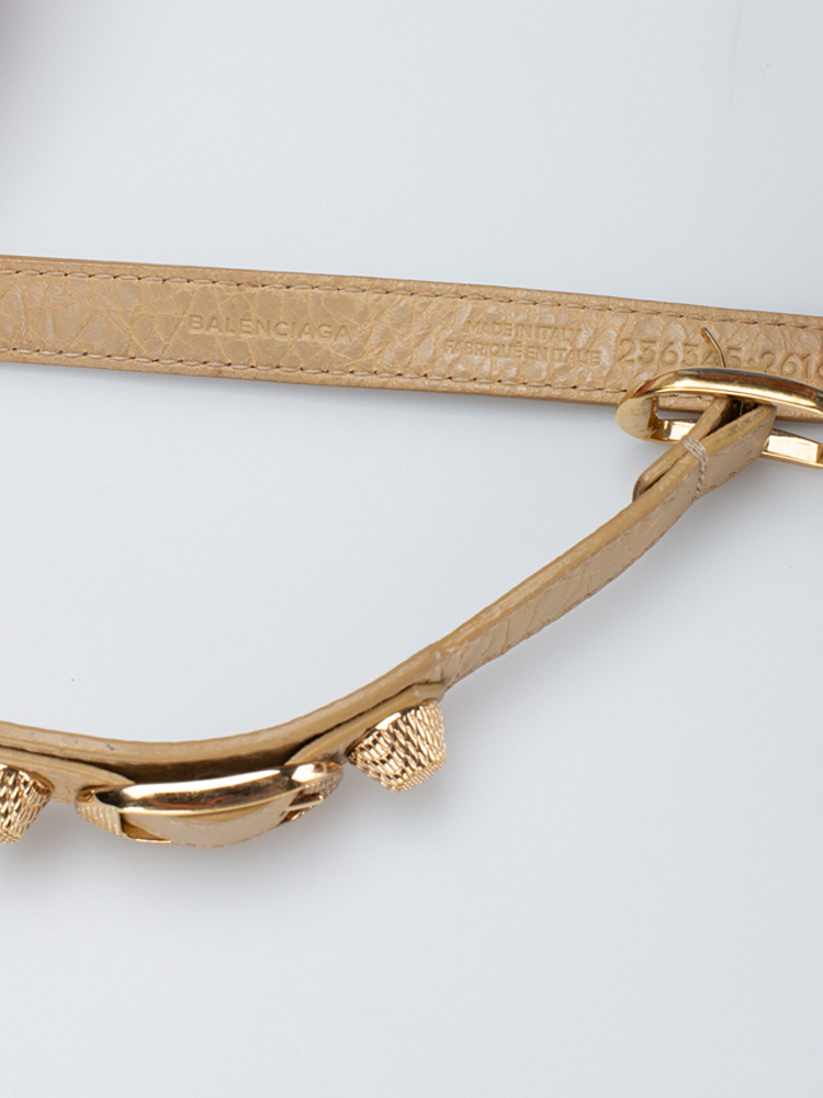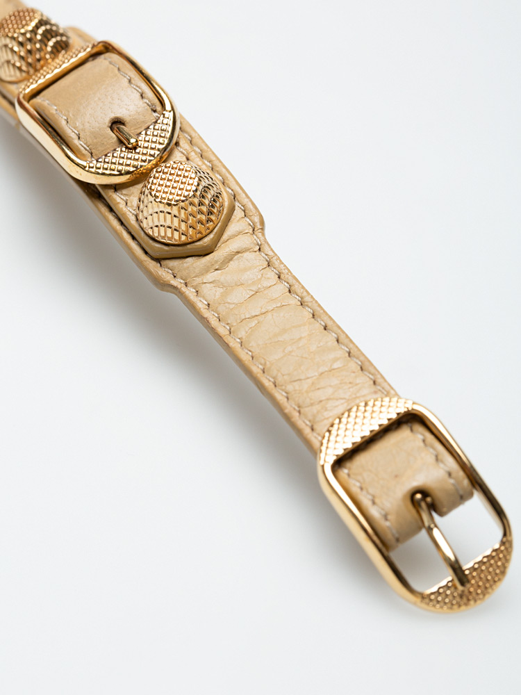 This bracelet is crafted of agneau lambskin leather and features Balenciaga signature gold textured buckles and giant studs.