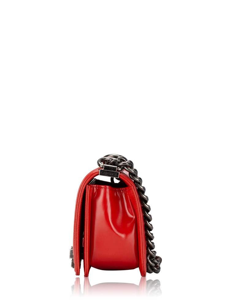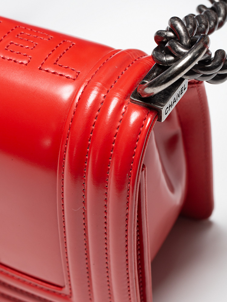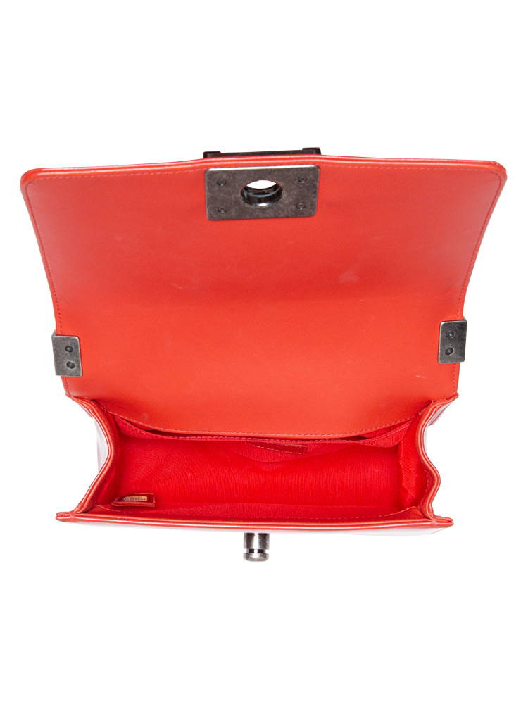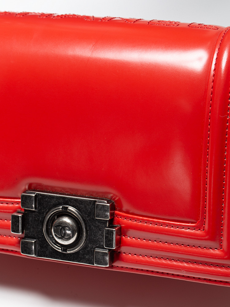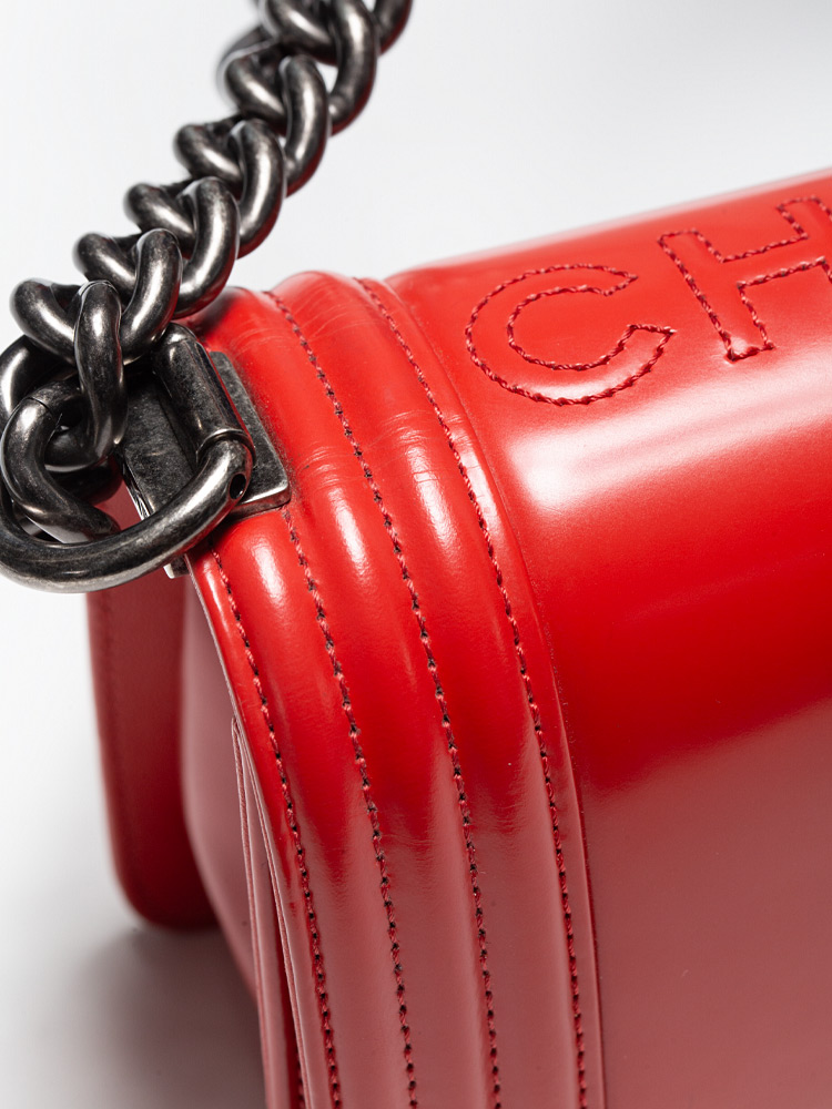 Crafted of glazed calfskin leather material. It features a chain shoulder strap with a leather pad, a Chanel logo stitched prominently on top, and a Chanel boy CC push lock. This opens the front flap to a fabric interior with a pocket.