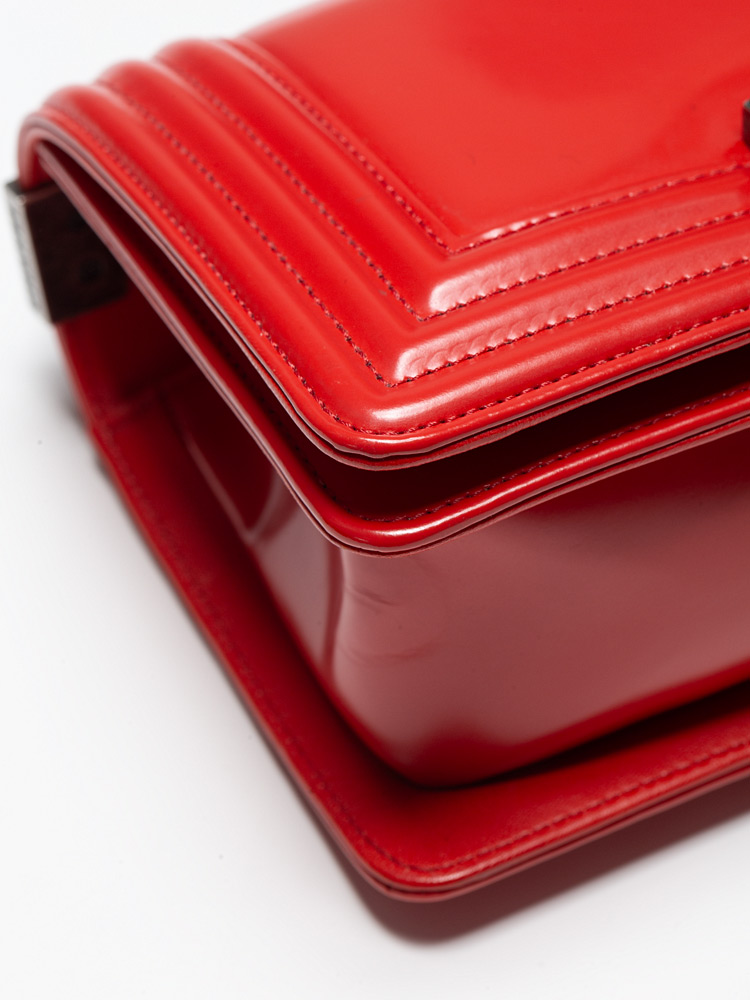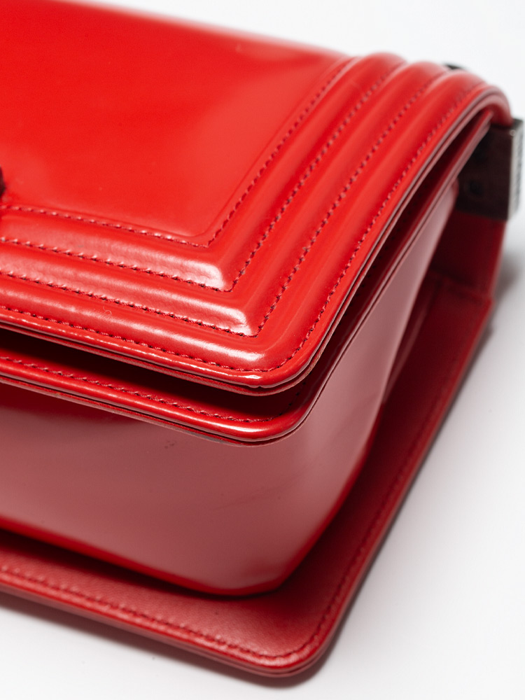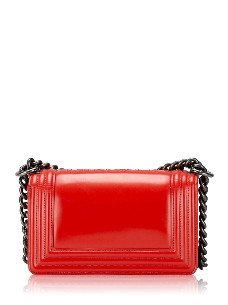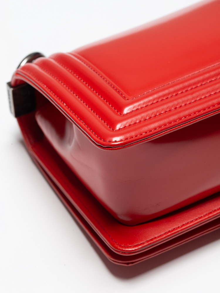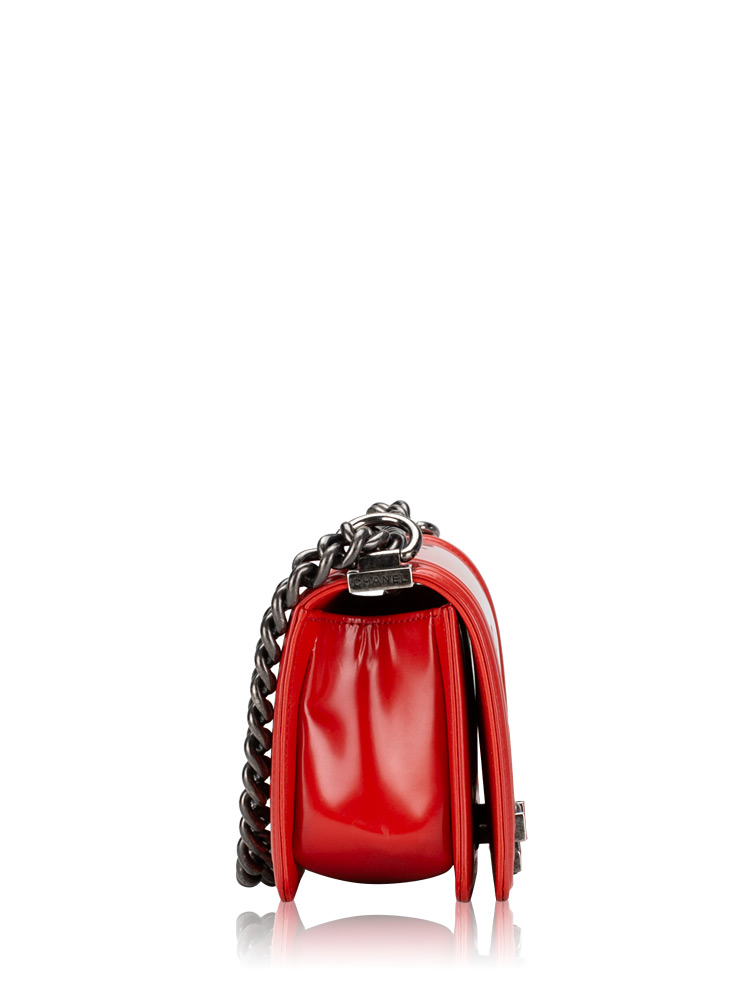 Crafted of glazed calfskin leather material. It features a chain shoulder strap with a leather pad, a Chanel logo stitched prominently on top, and a Chanel boy CC push lock. This opens the front flap to a fabric interior with a pocket.