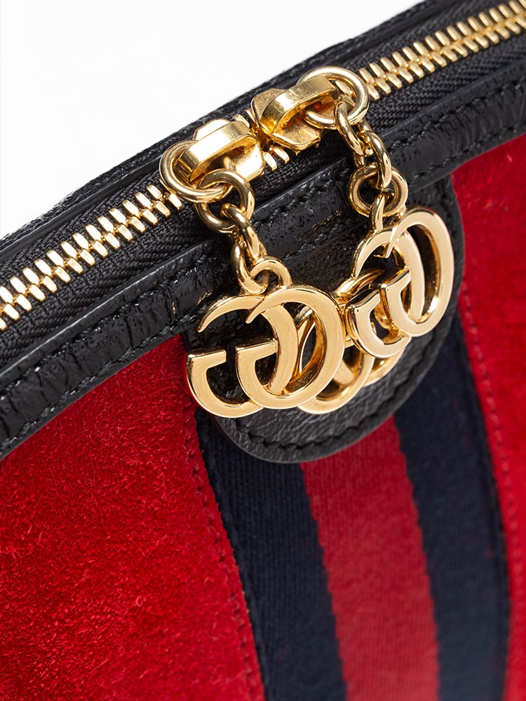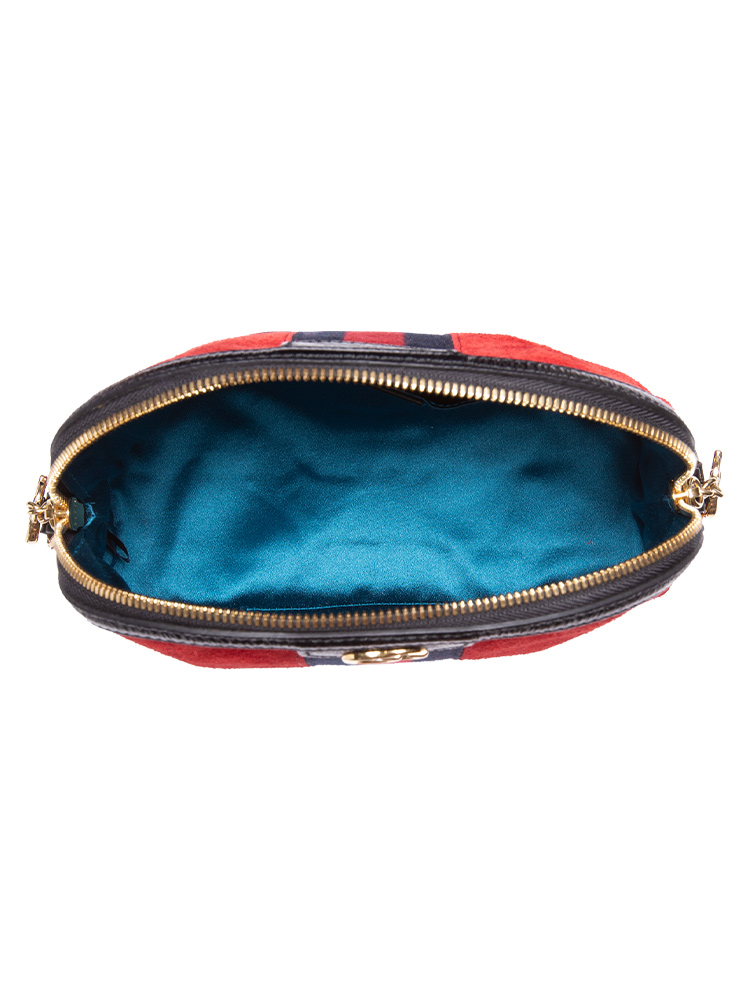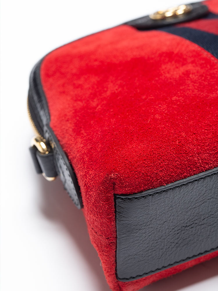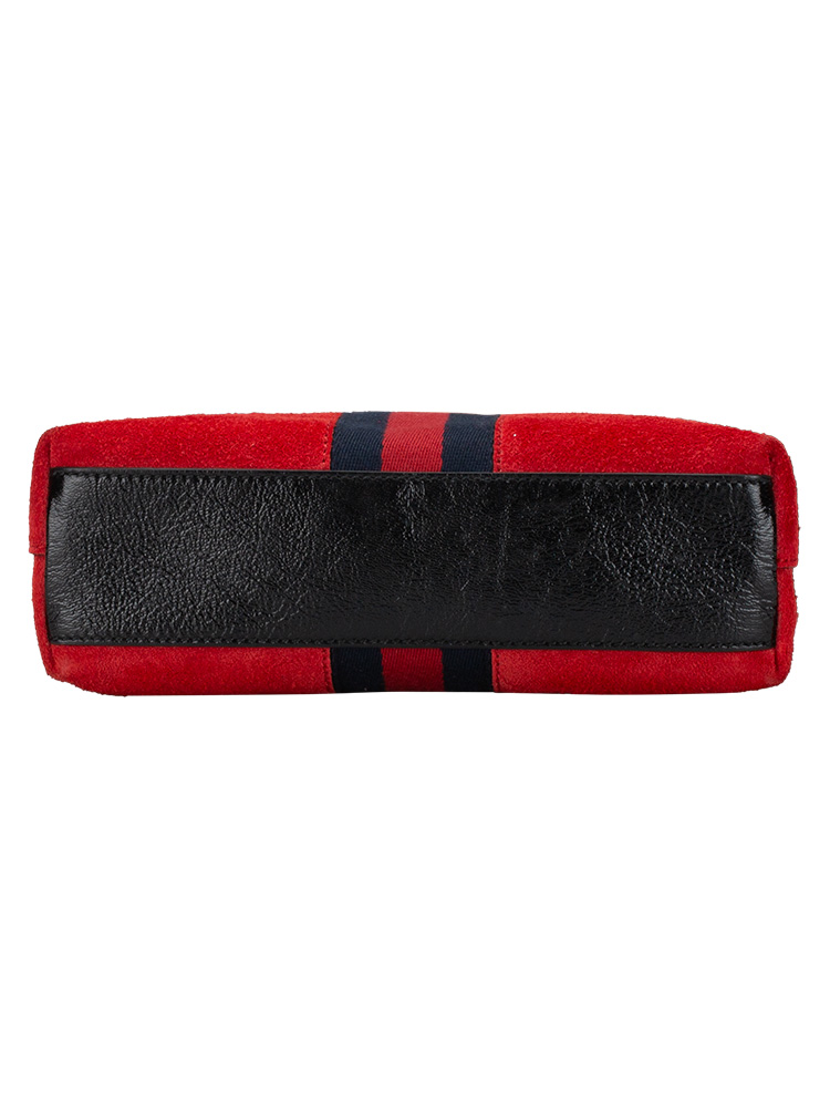Crafted of red suede with black leather trim and a navy blue and red Gucci web detail. The bag features an adjustable patent leather shoulder strap and gold hardware. This opens to a satin interior and multiple patch pockets.