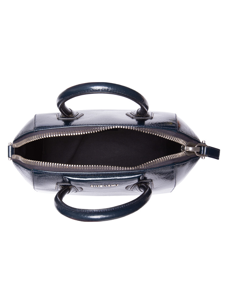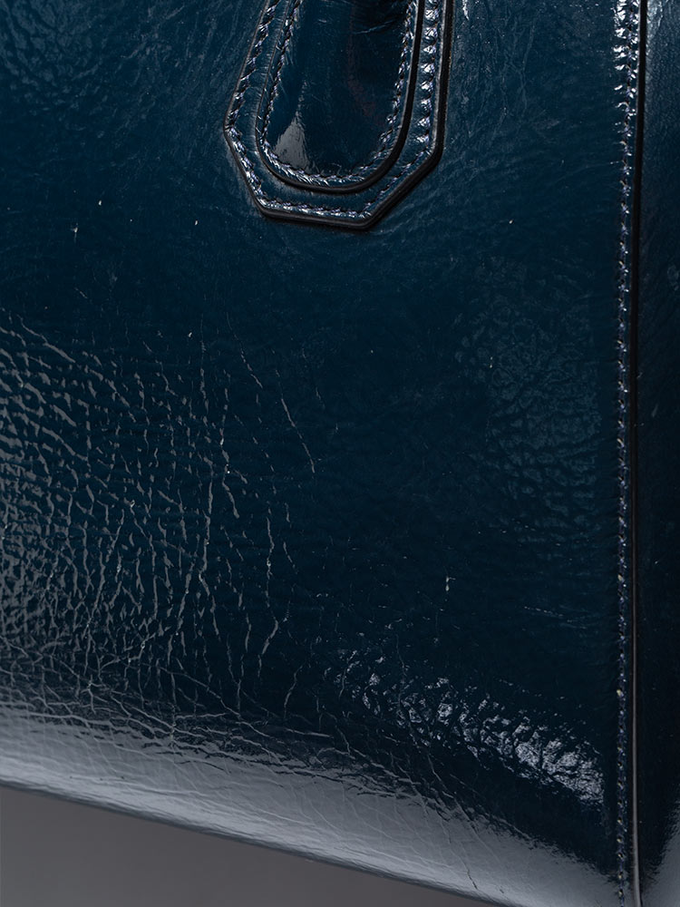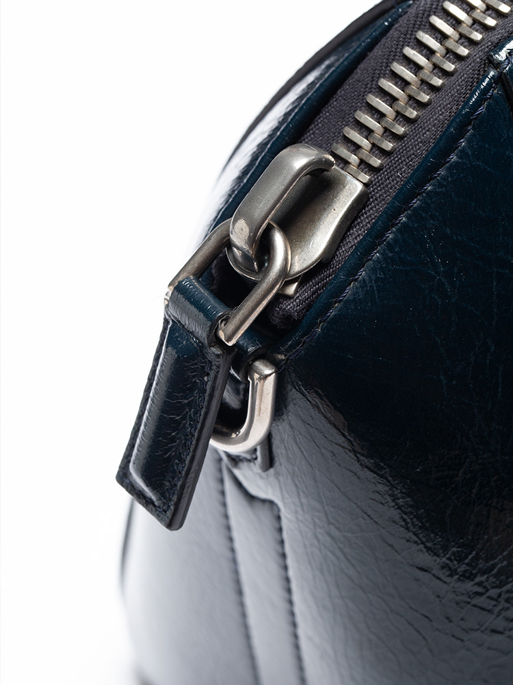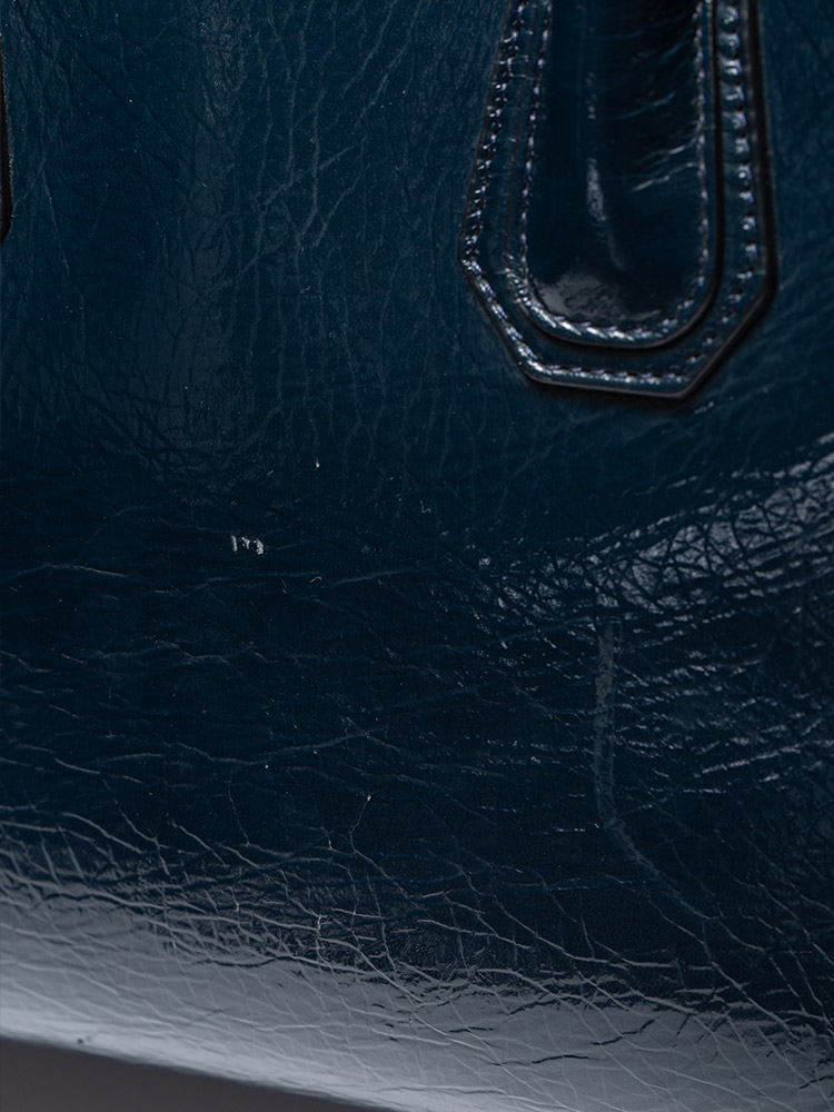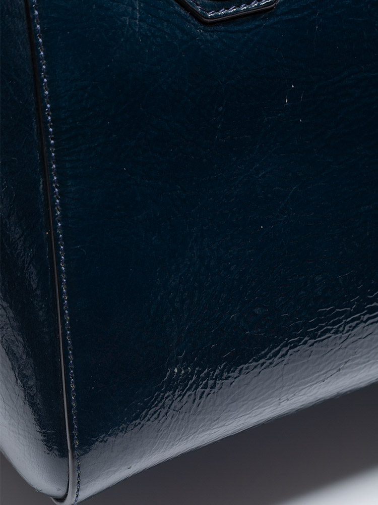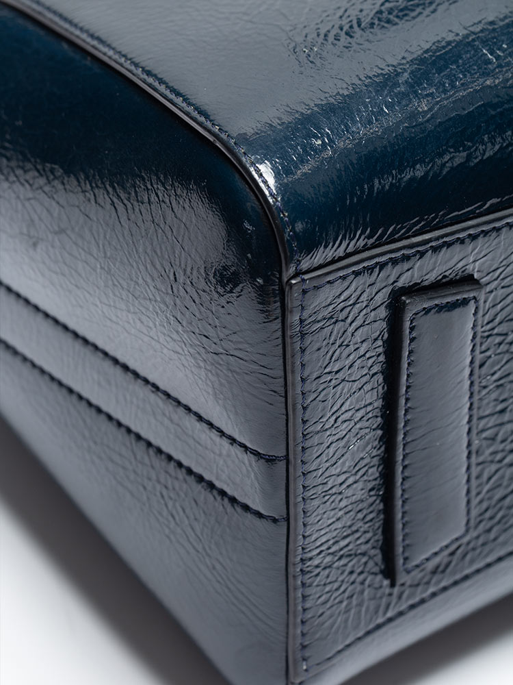 Crafted of crinkled patent deerskin leather. Features with rolled top handles, an optional shoulder strap with aged silver hardware, and extended sides. The top zipper opens to a fabric interior with zipper and patch pockets.