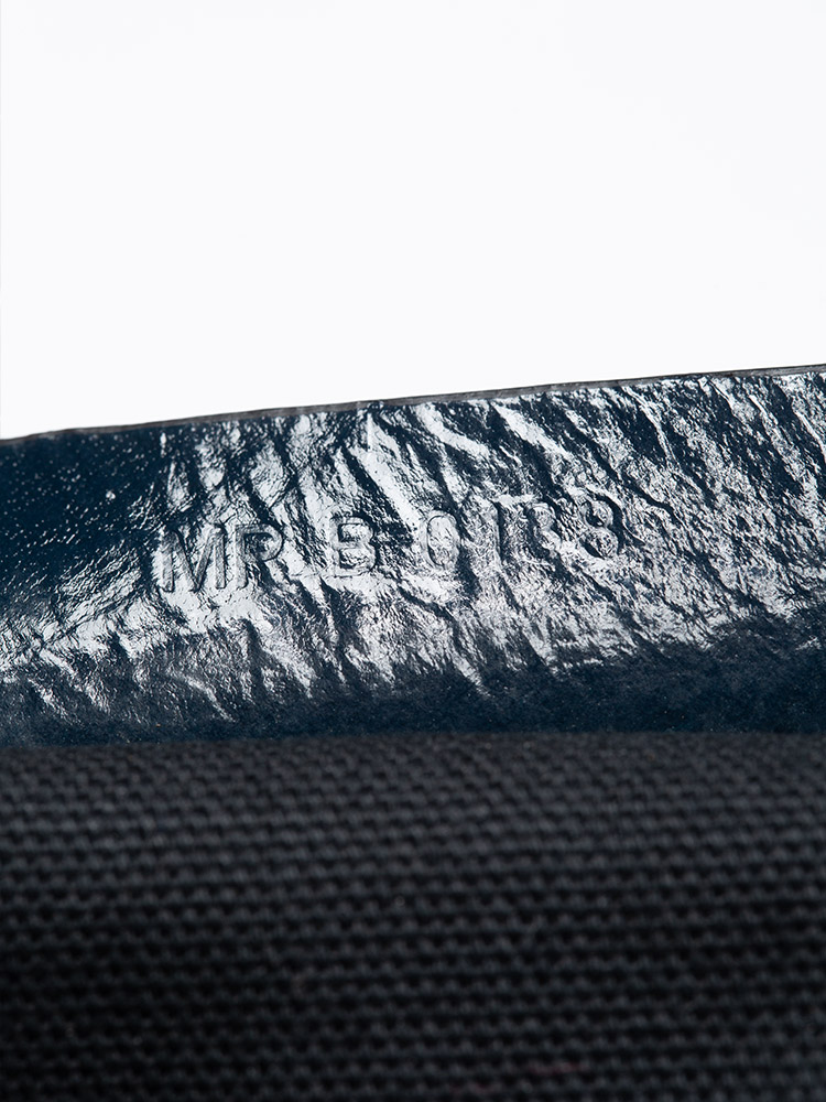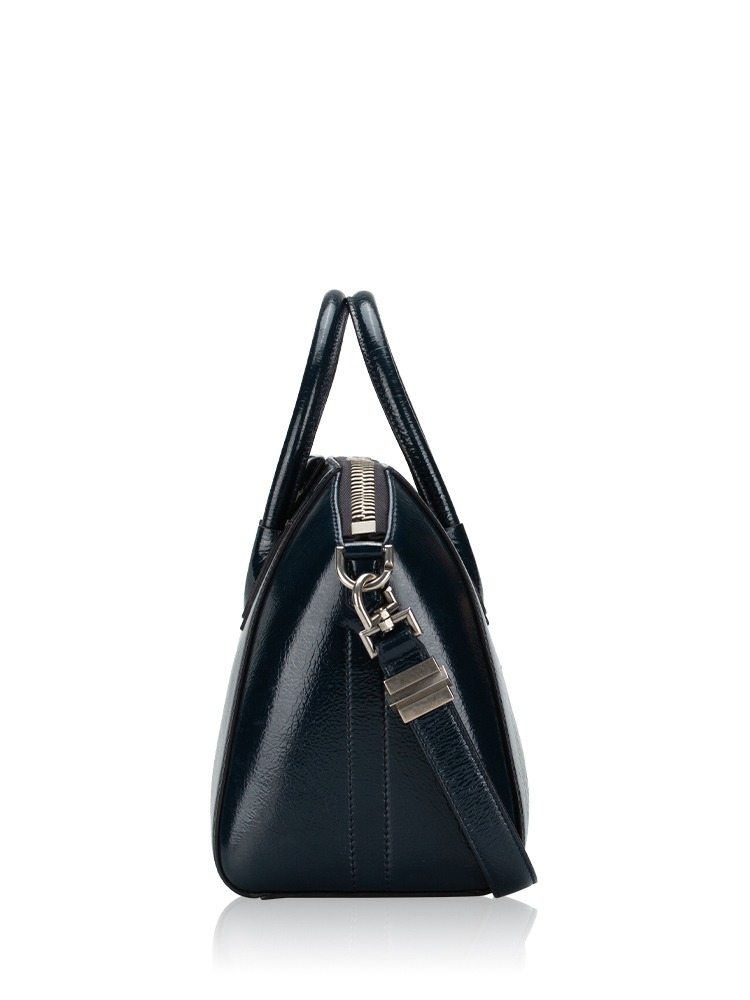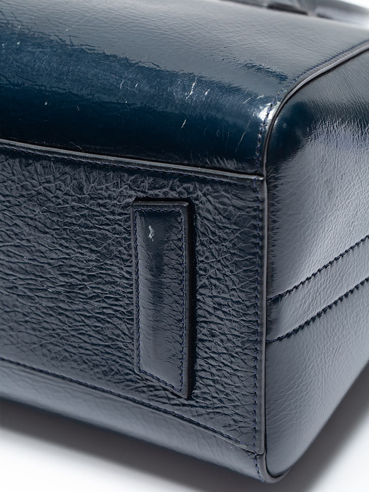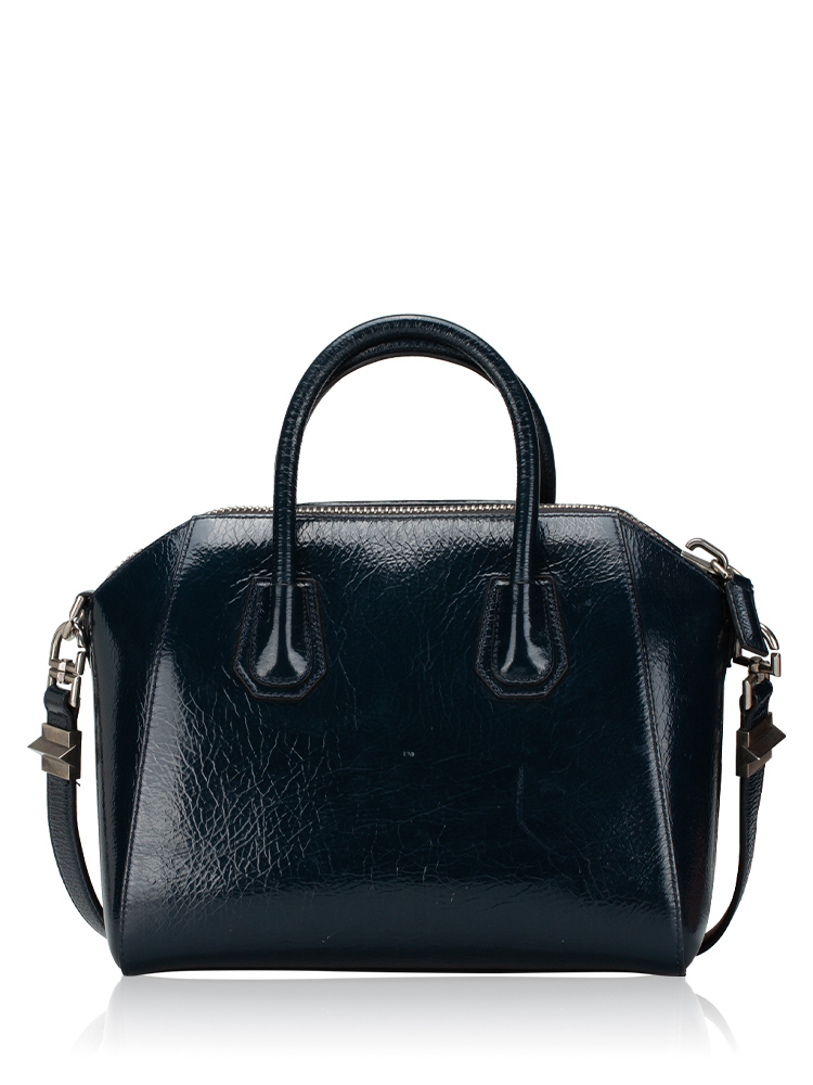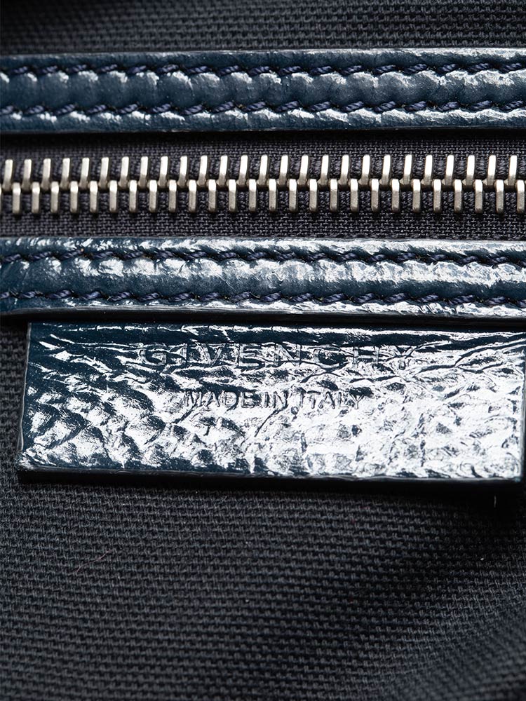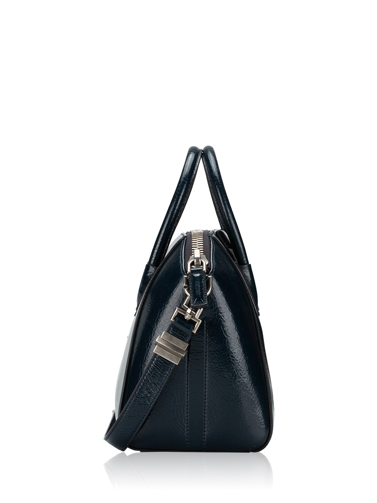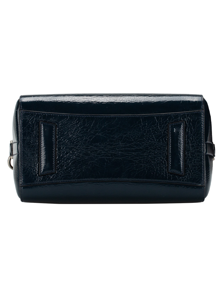 Crafted of crinkled patent deerskin leather. Features with rolled top handles, an optional shoulder strap with aged silver hardware, and extended sides. The top zipper opens to a fabric interior with zipper and patch pockets.