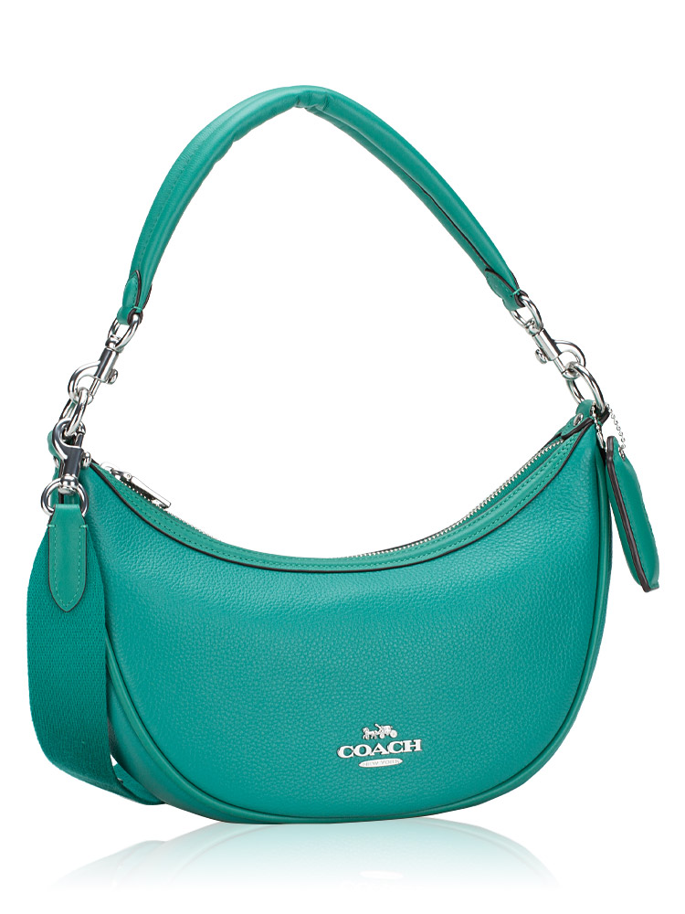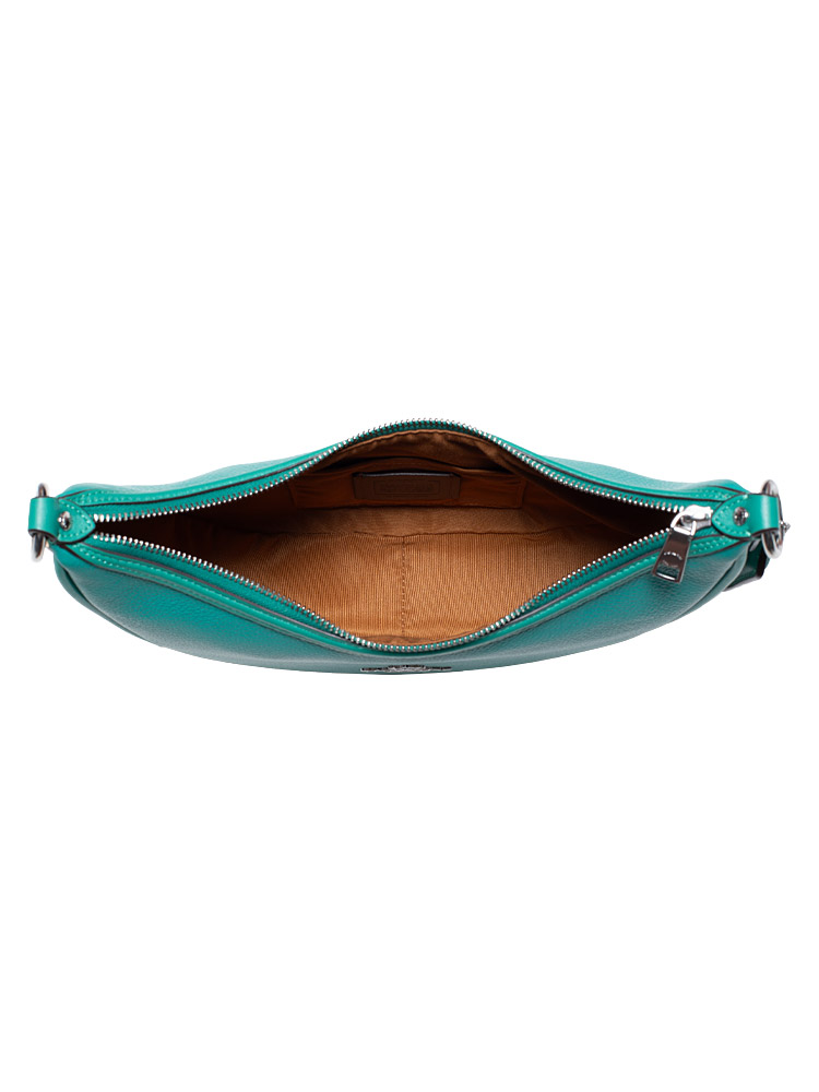 Made of pebble leather. The bag features a zip closure that opens to fabric lining with interior one slip pocket, removable shoulder strap, adjustable and removable long strap.