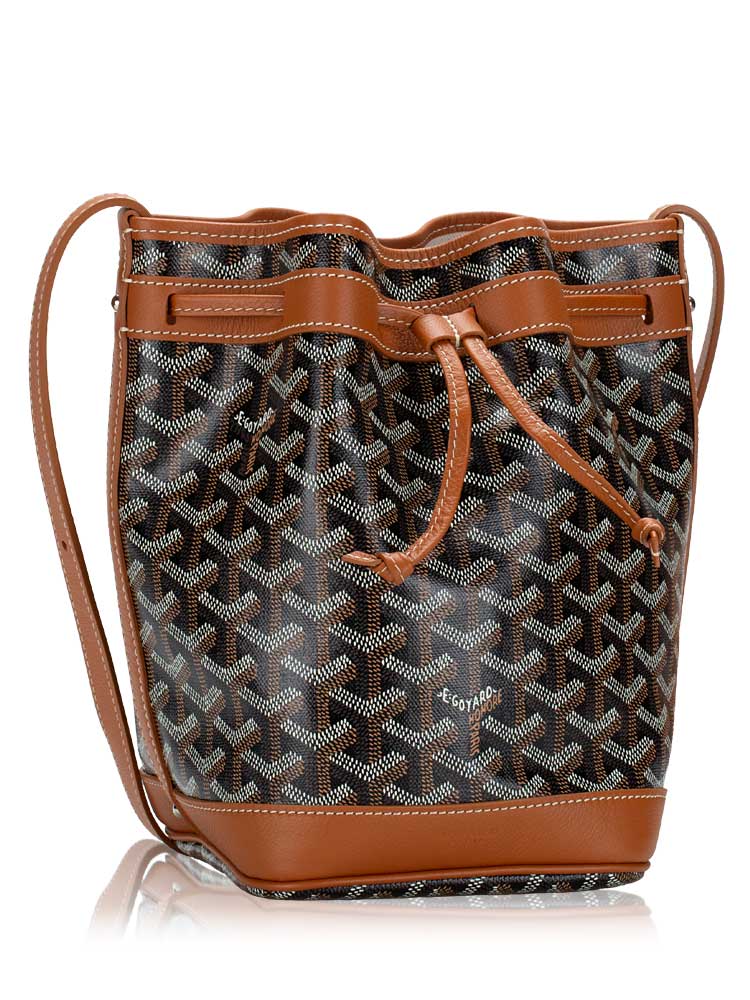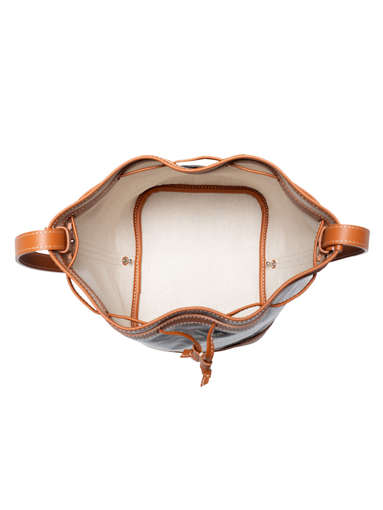 Made of goyardine canvas and chevroches calfskin. The bag features a drawstring fastening system closure that opens to linen and cotton inner side.