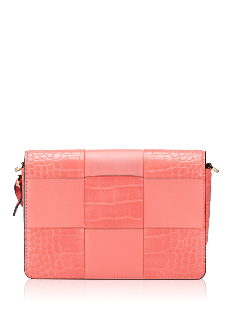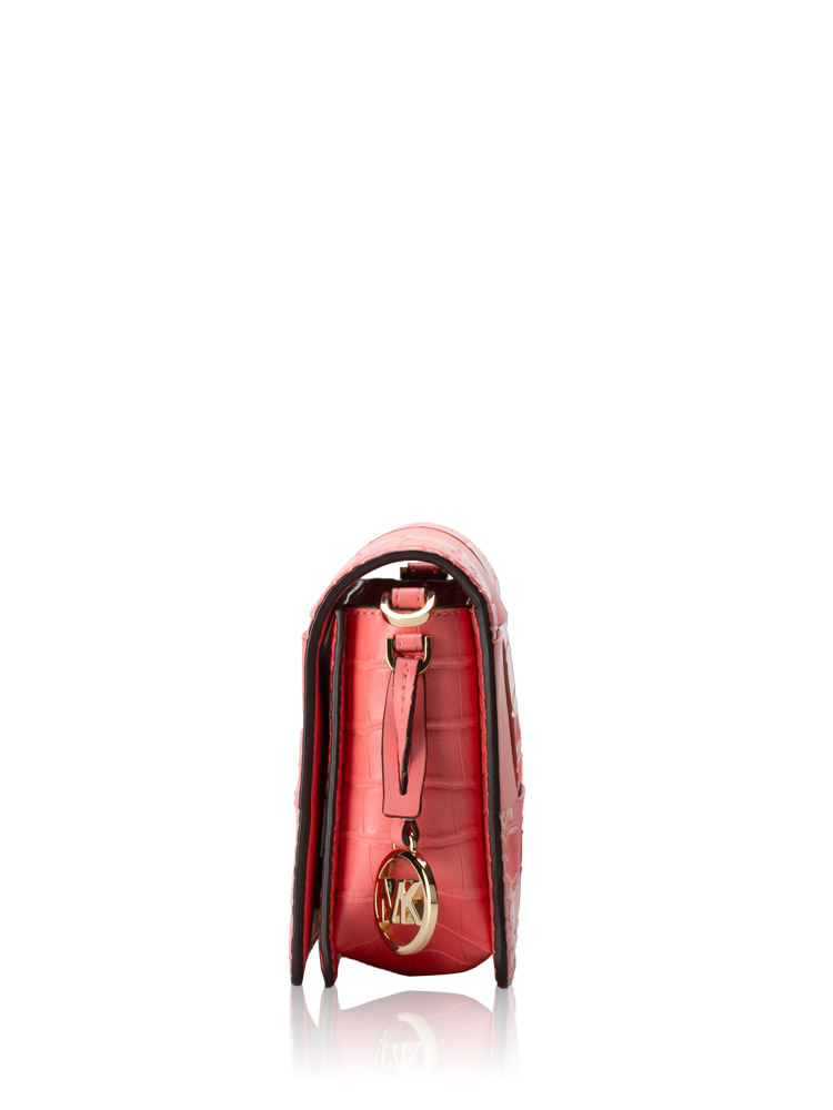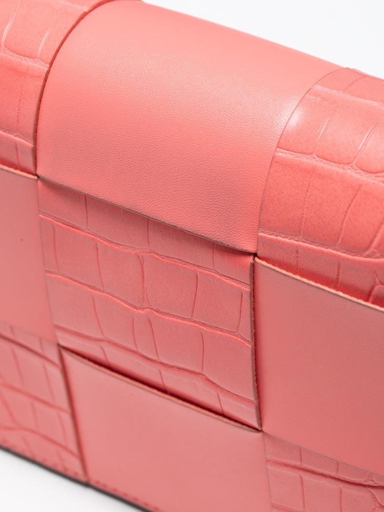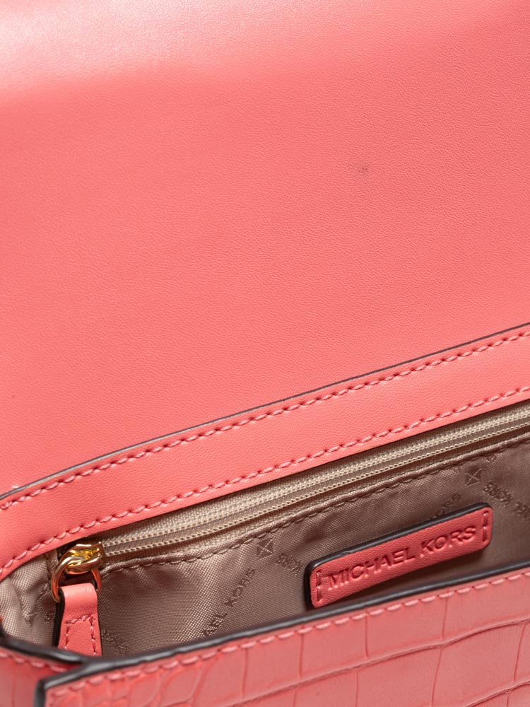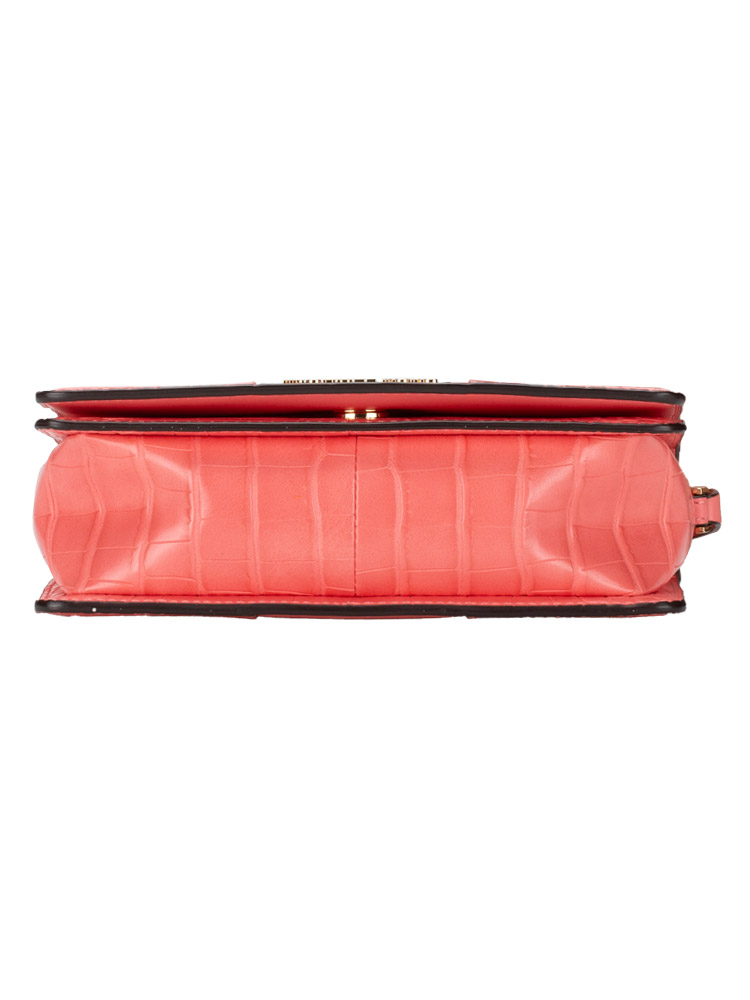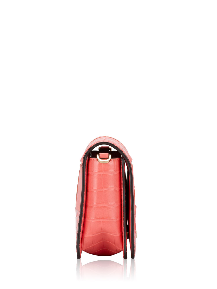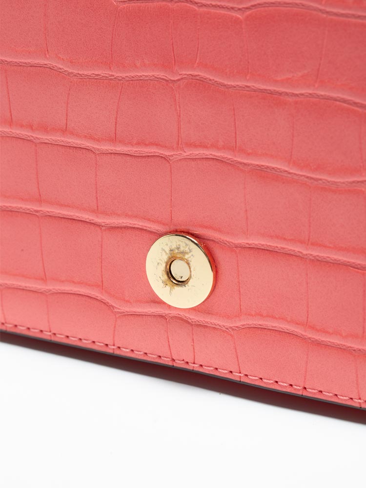 Made of embossed crocodile leather. The bag features a magnetic closure that opens to polyester lining with interio one zip pocket, one slip pocket.