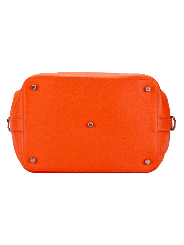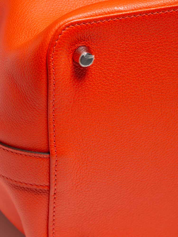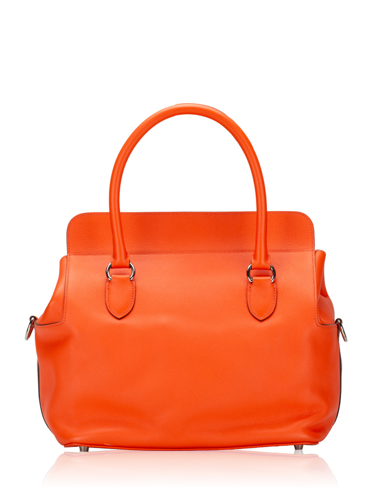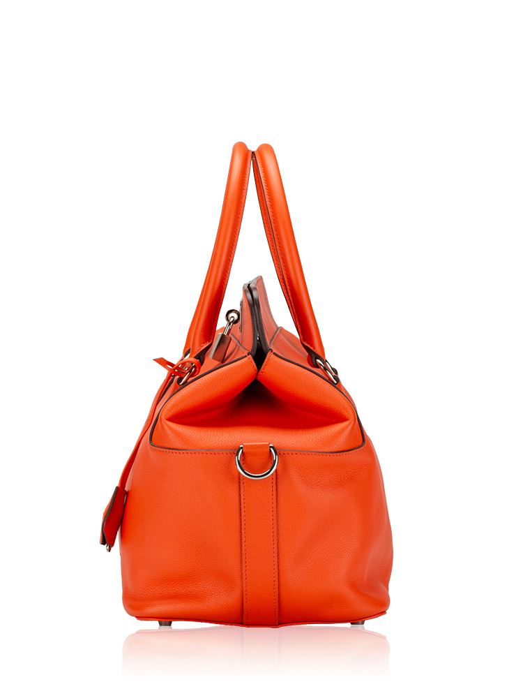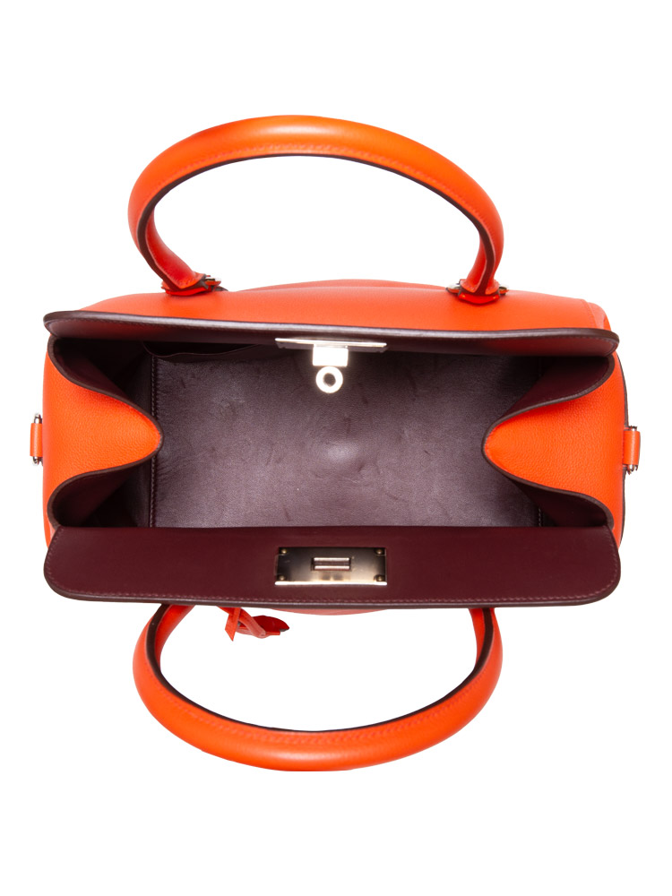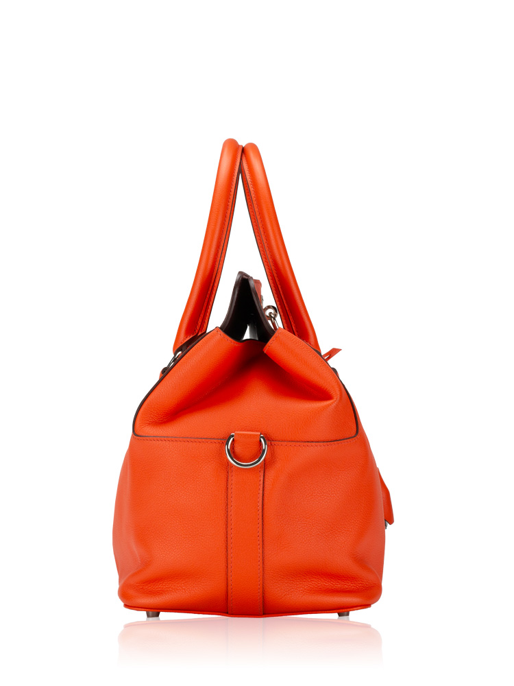 Crafted of finely grained evercolor calfskin leather. It features top handles, an optional shoulder strap, and palladium hardware including a frontal turn lock. The top opens to a spacious leather interior with patch pockets.