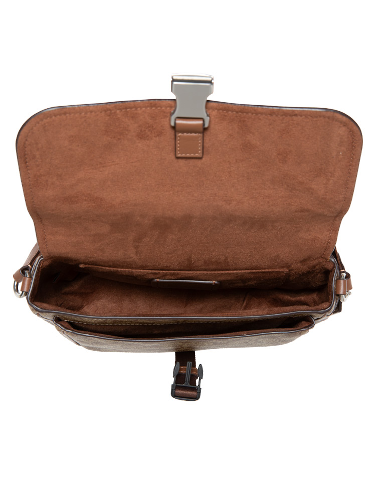 Made of coated canvas and smooth leather. The bag features a Speed-clip closure that opens to suede lining with two slip pockets, exterior one slip pocket at back, adjustable strap.