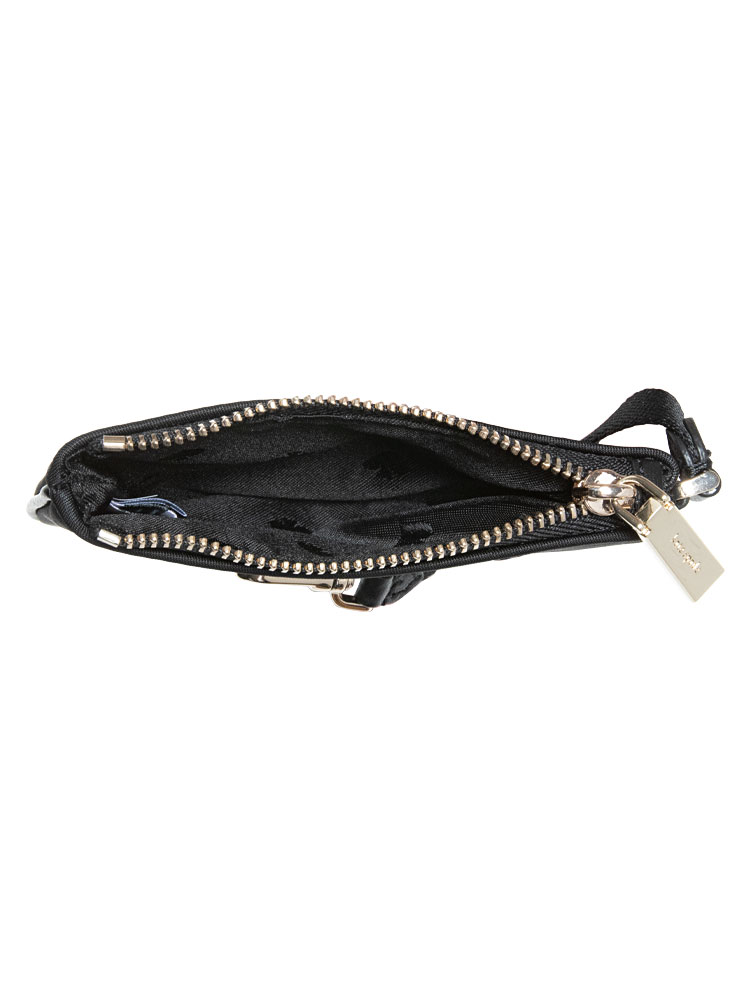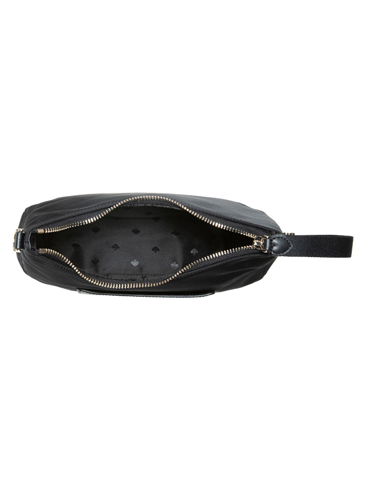 Crafted of nylon. It features a zip closure that opens to a lined interior with an interior zip pocket. It comes with an optional strap and optional removable pochette.