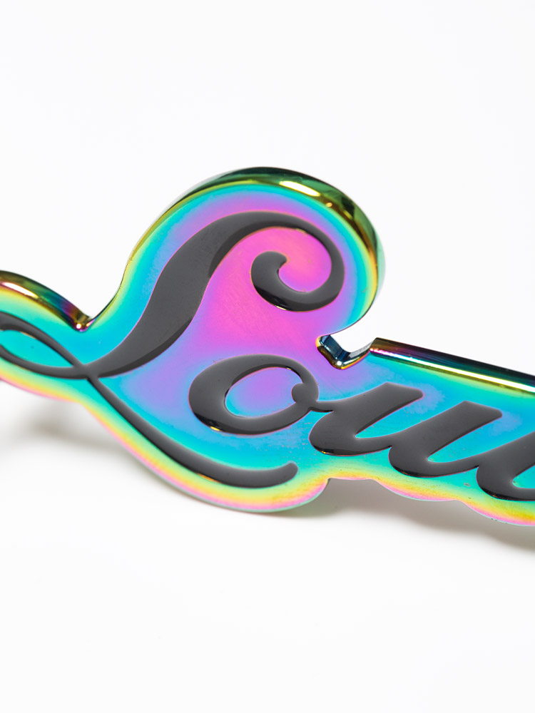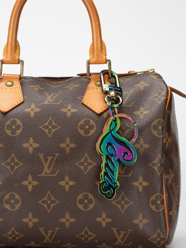 Crafted of metal. It has a ring for keys and a D-ring clasp to be used as a handbag charm.