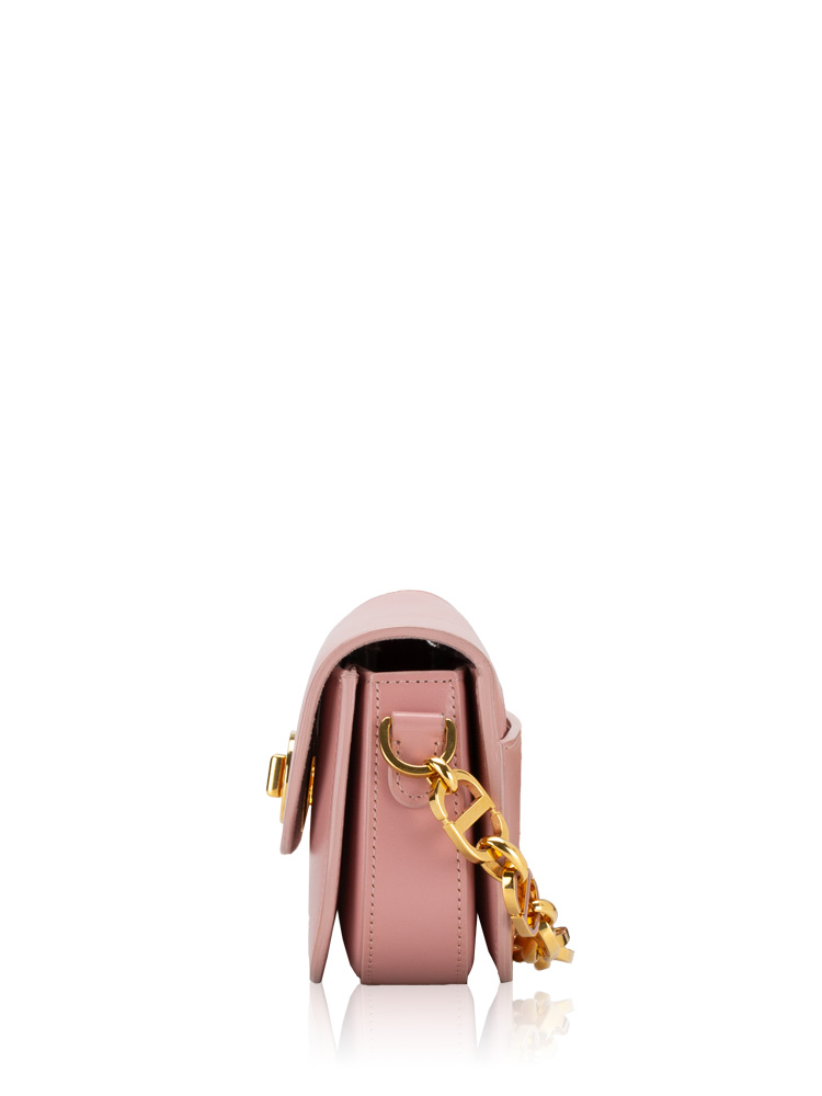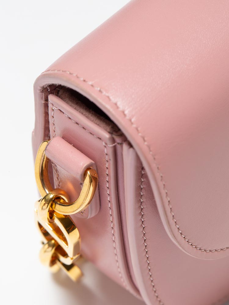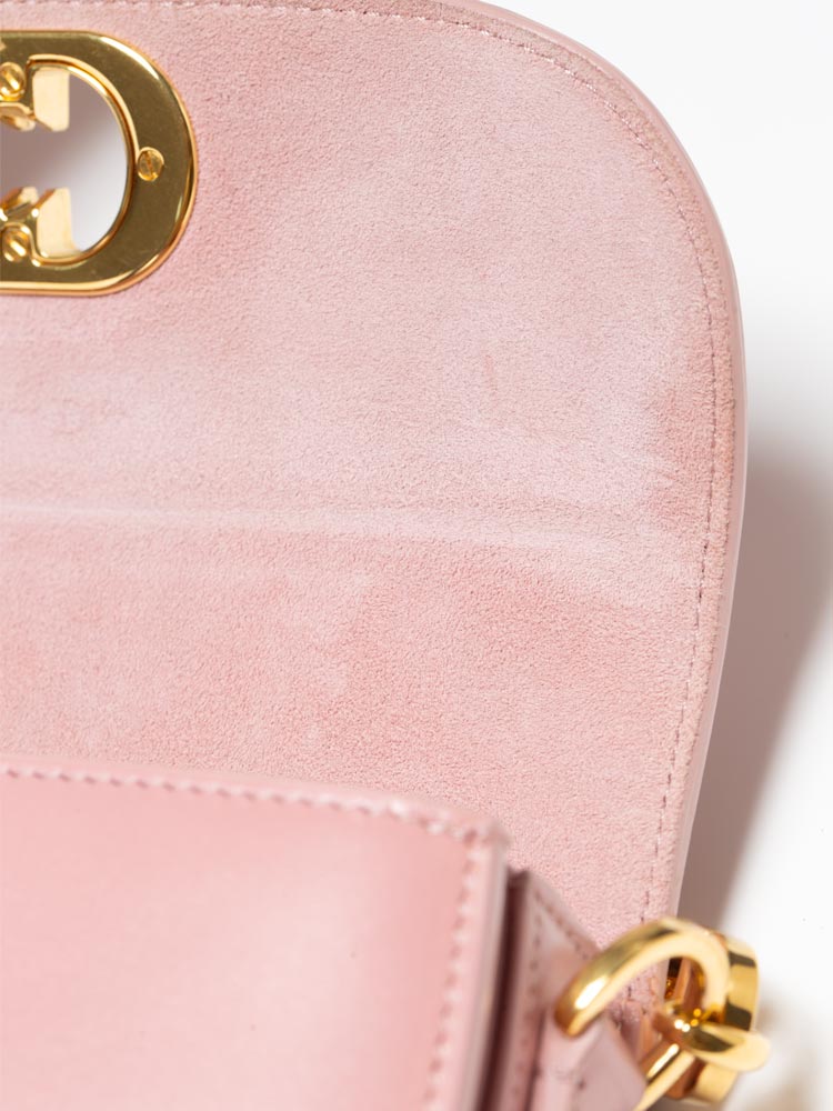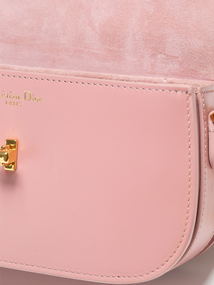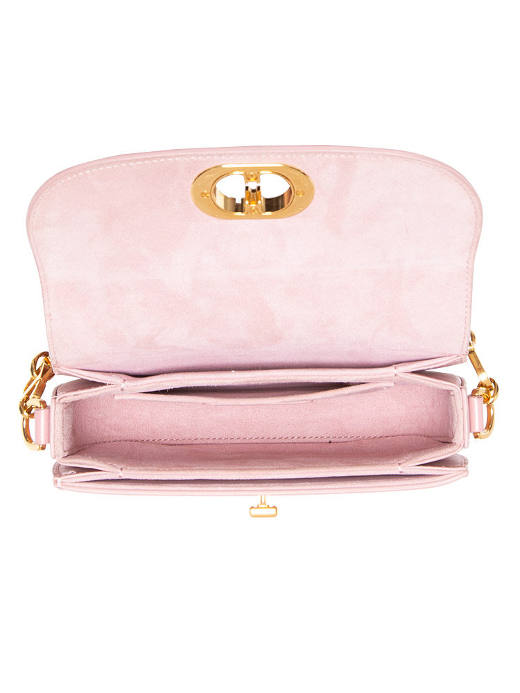 This flap bag is crafted of smooth leather in pink. The bag features an adjustable shoulder strap and polished gold hardware. The CD clasp flap opens to a pink suede interior with triple compartments and patch pocket.