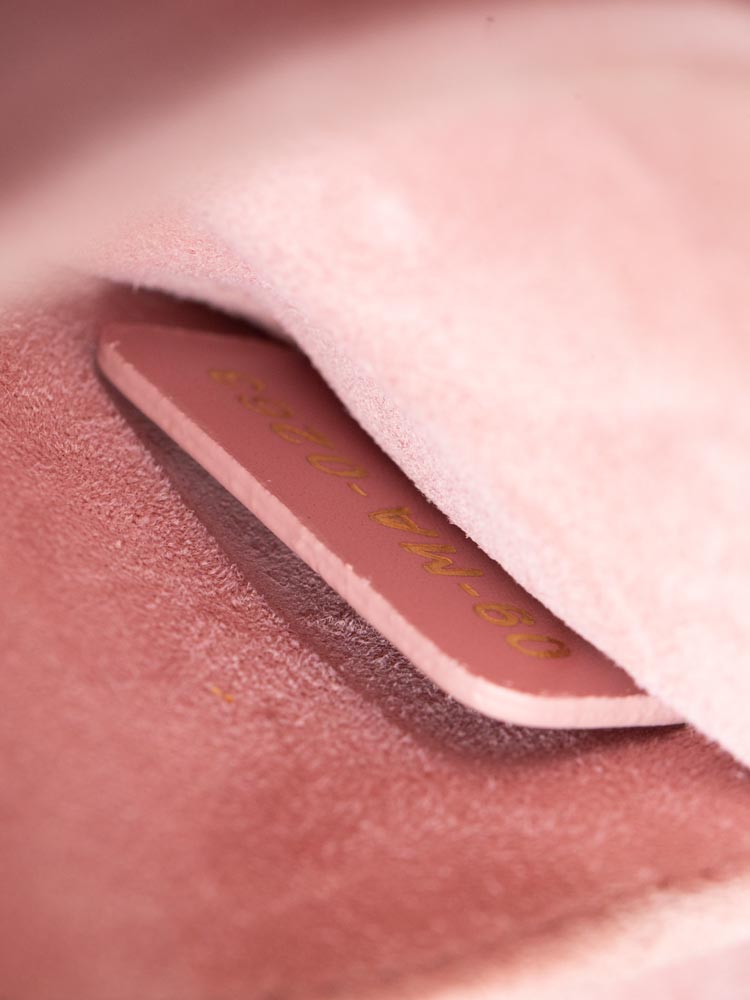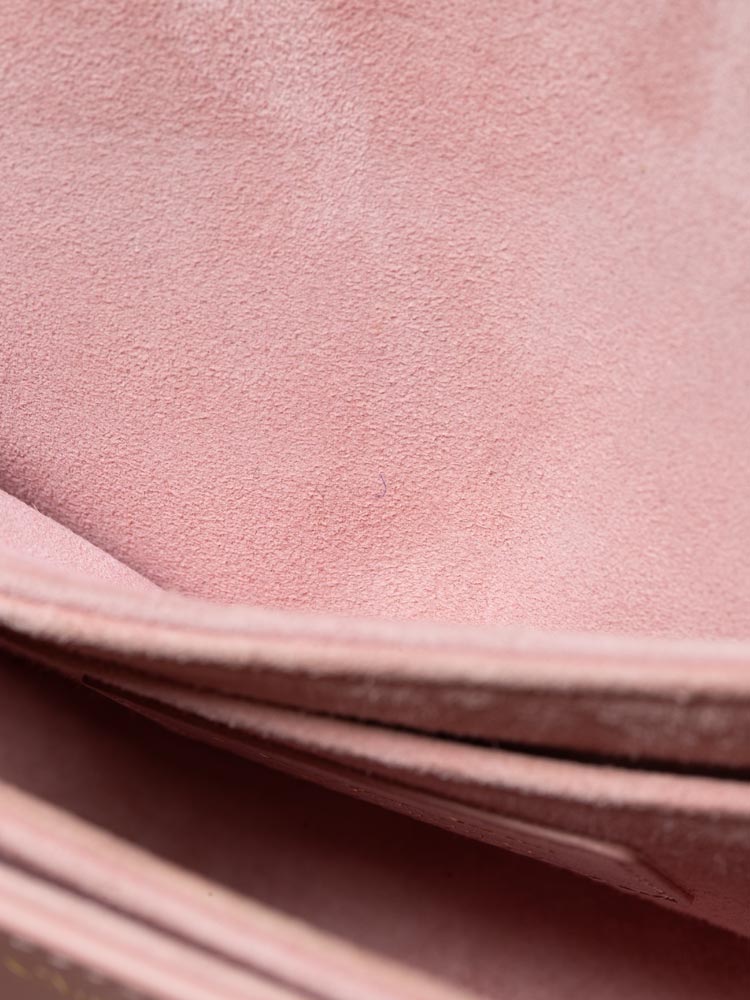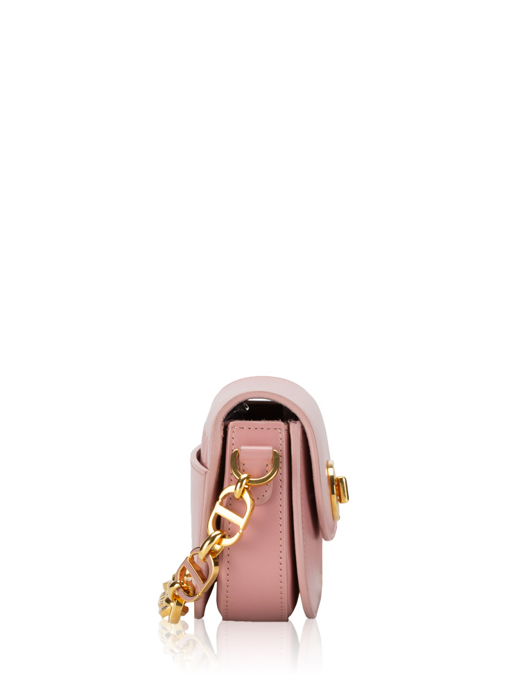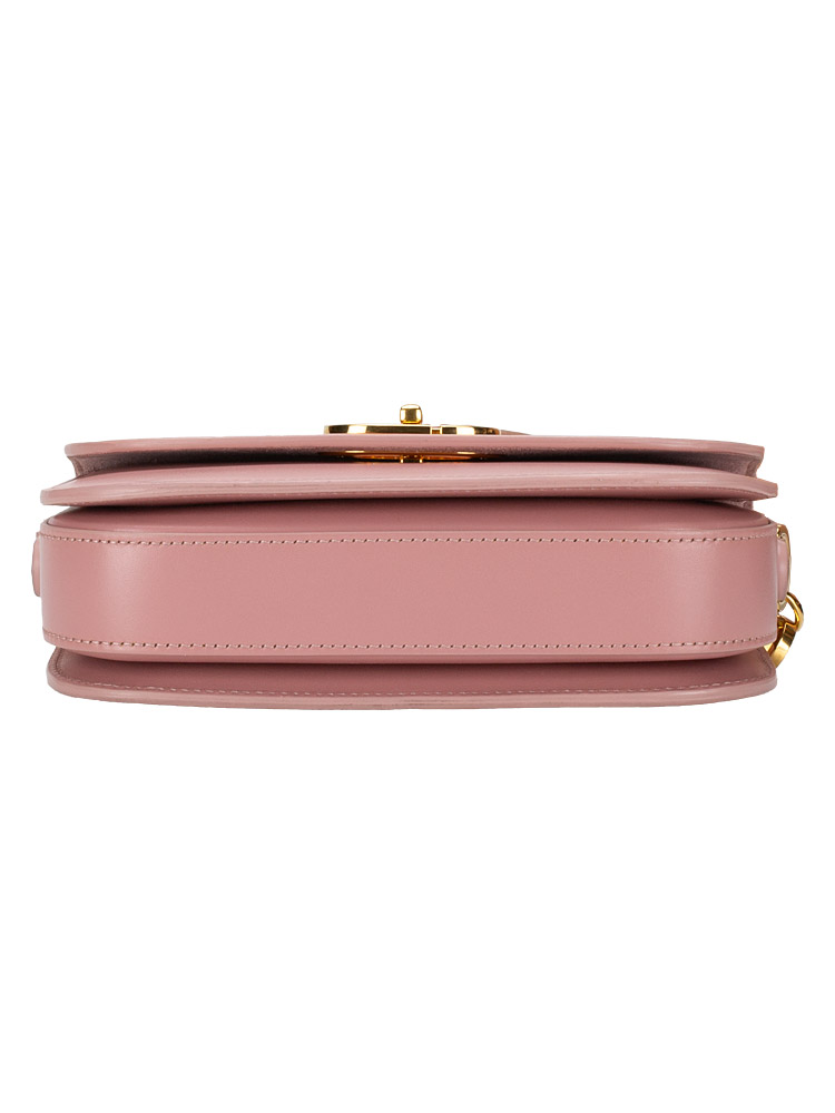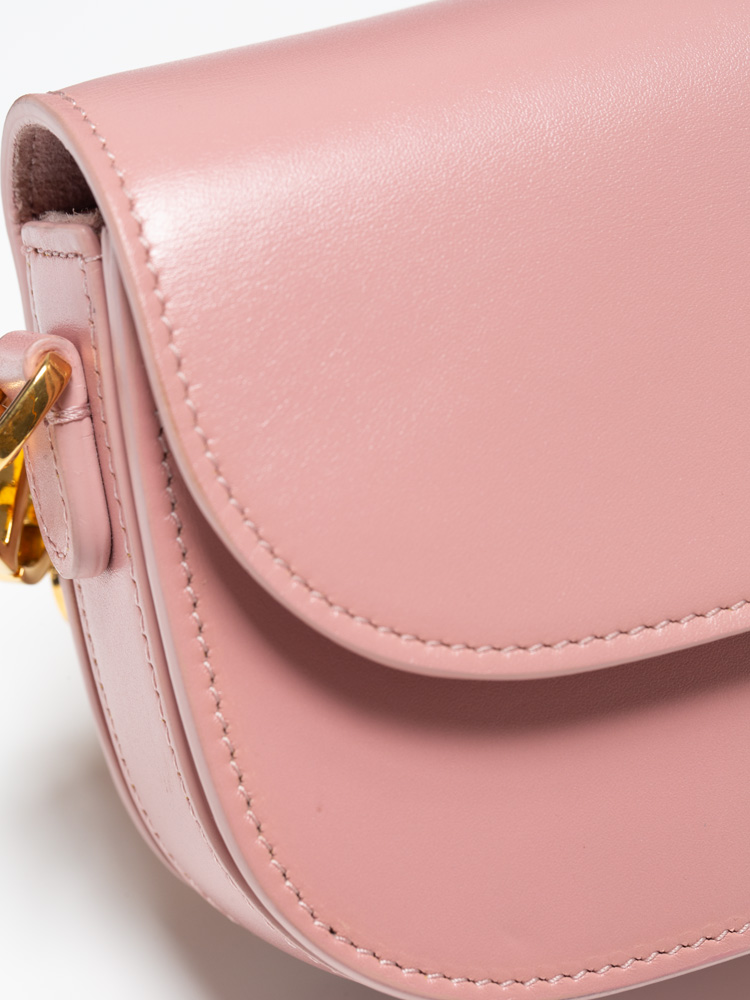 This flap bag is crafted of smooth leather in pink. The bag features an adjustable shoulder strap and polished gold hardware. The CD clasp flap opens to a pink suede interior with triple compartments and patch pocket.