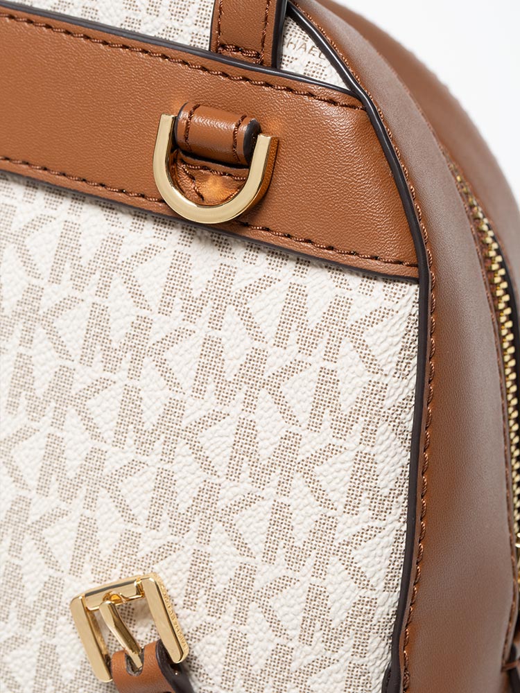 Made of signature coated canvas. The bag features a zip closure that opens to polyester lining with two slip pockets, one zip pocket, and adjustable strap.