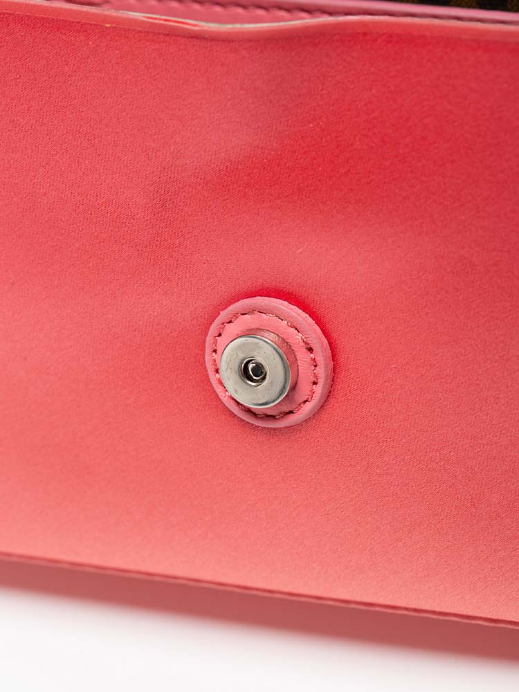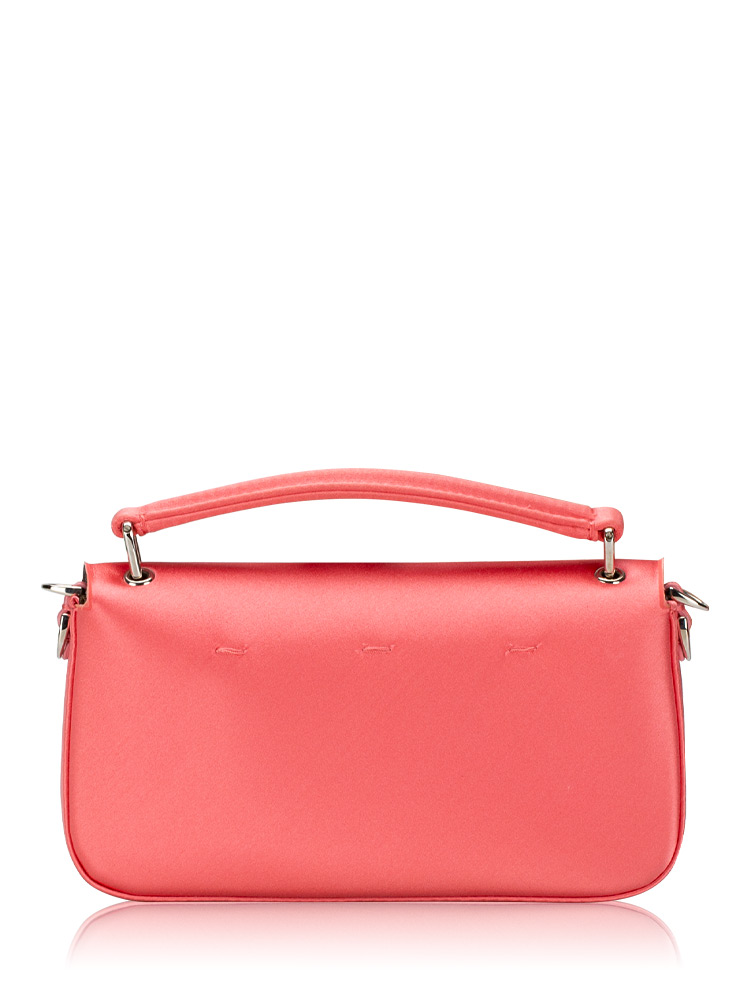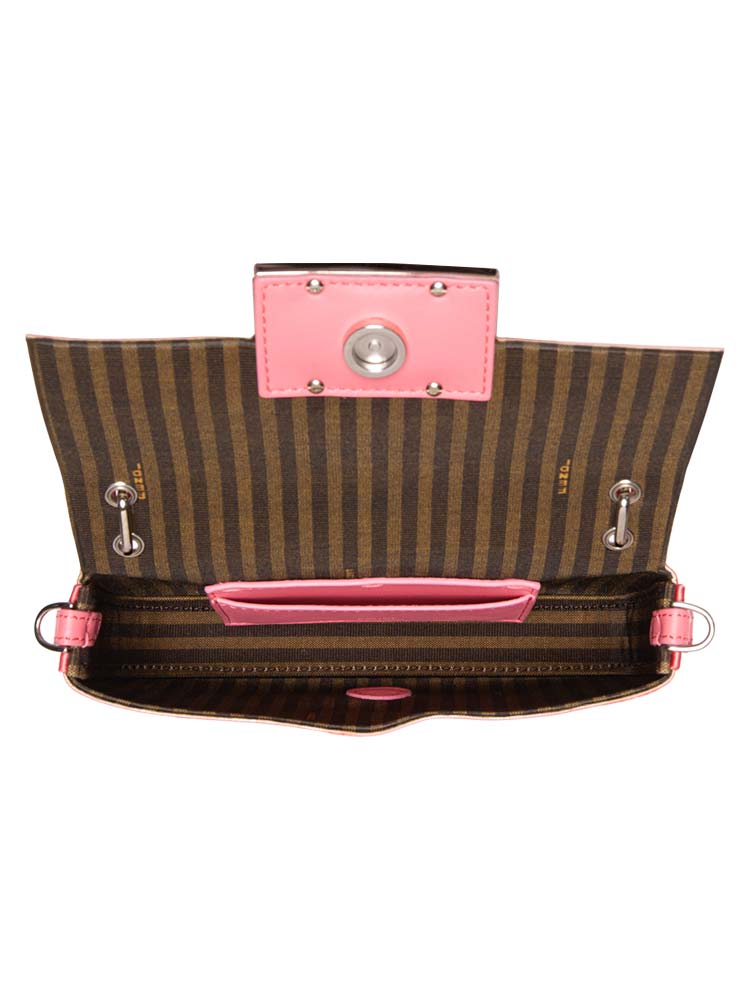Crafted of satin. It features a looping leather shoulder strap and trim with a Fendi FF clasp that closes the frontal flap, an optional shoulder strap, and leather strap with a magnet. The flap opens to jacquard interior with a leather pocket.