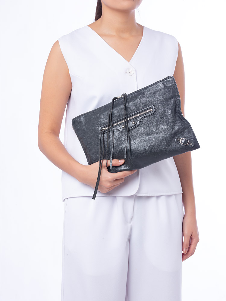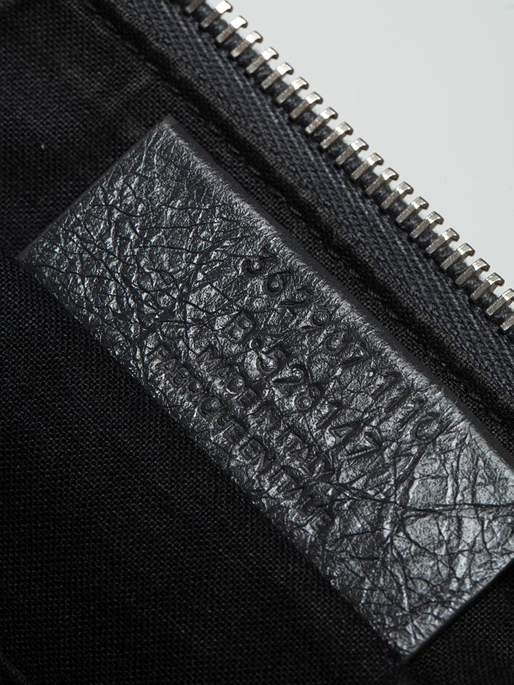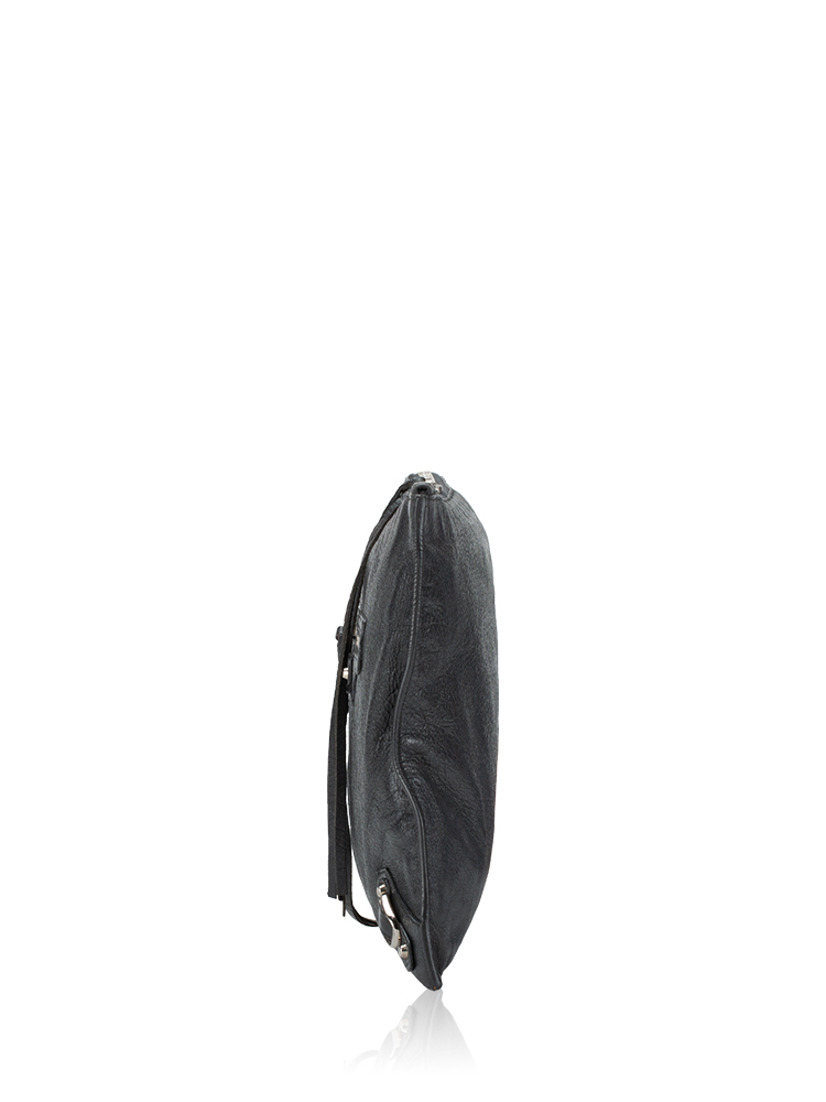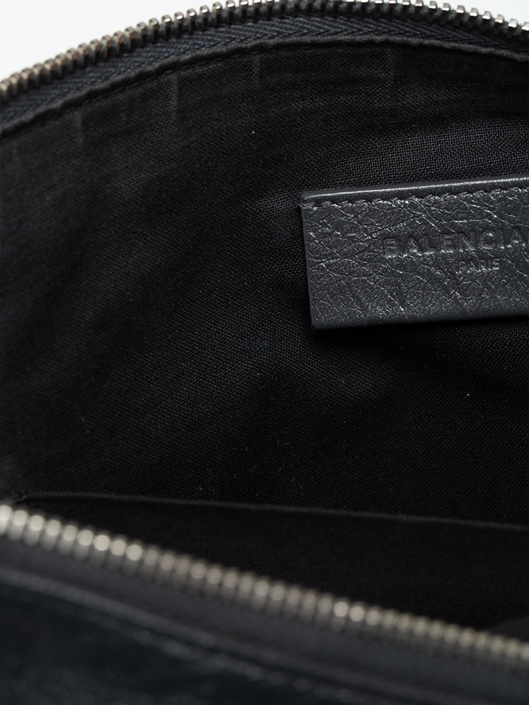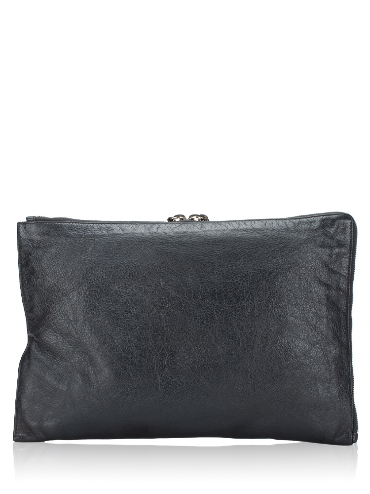 This pouch is crafted of distressed leather in gray. This clutch features all the hallmarks of classic Balenciaga bags including a facing zipper pocket, a leather zipper pull tassel, leather patches and belts,