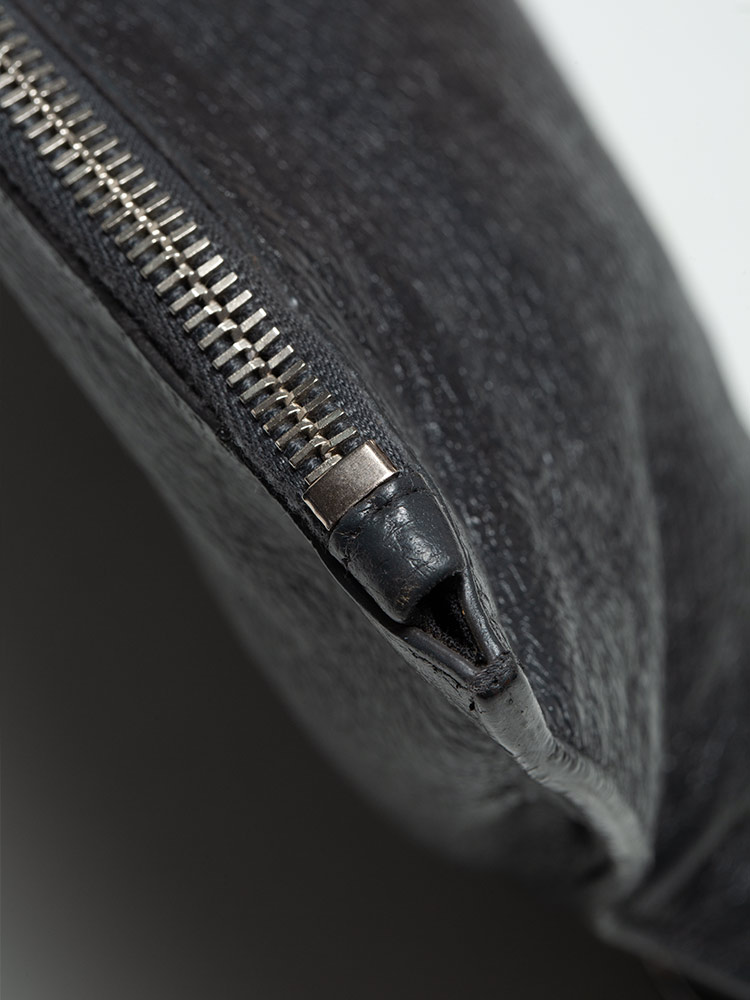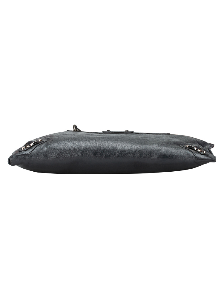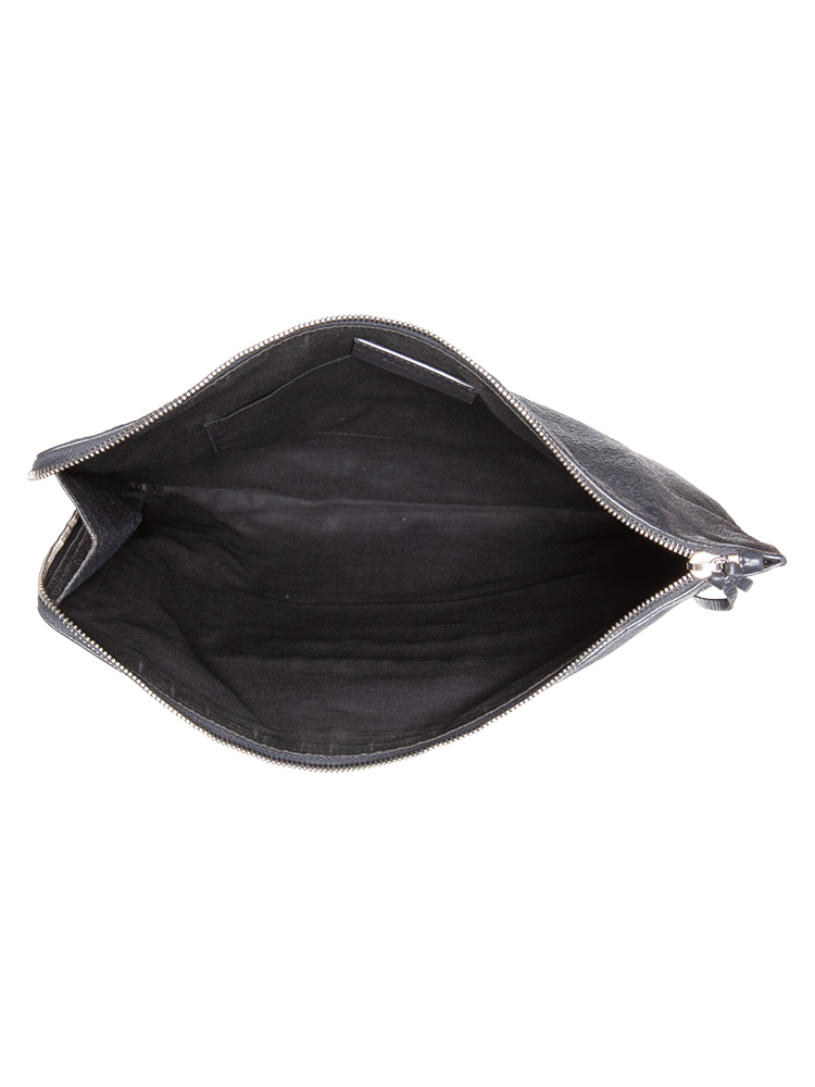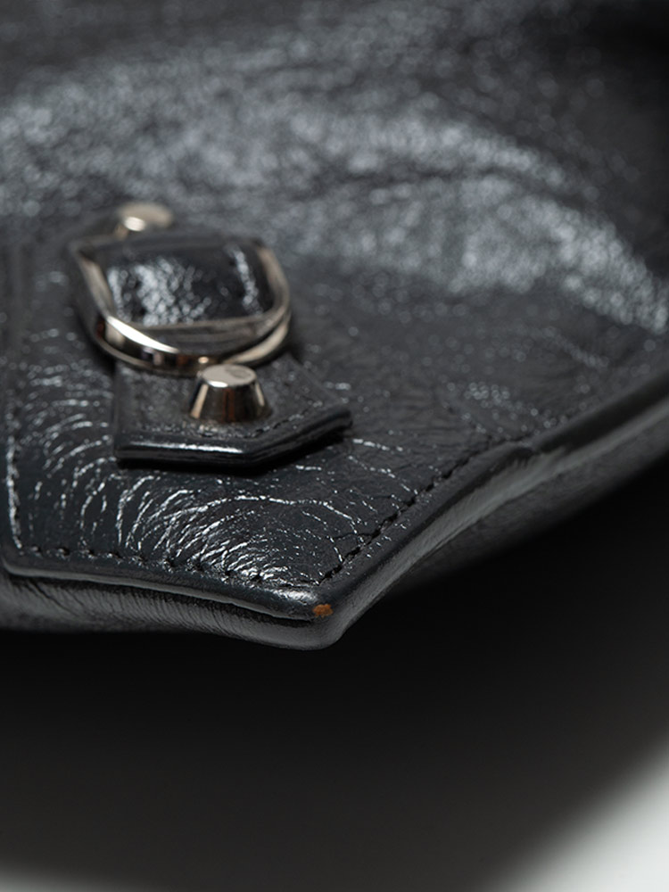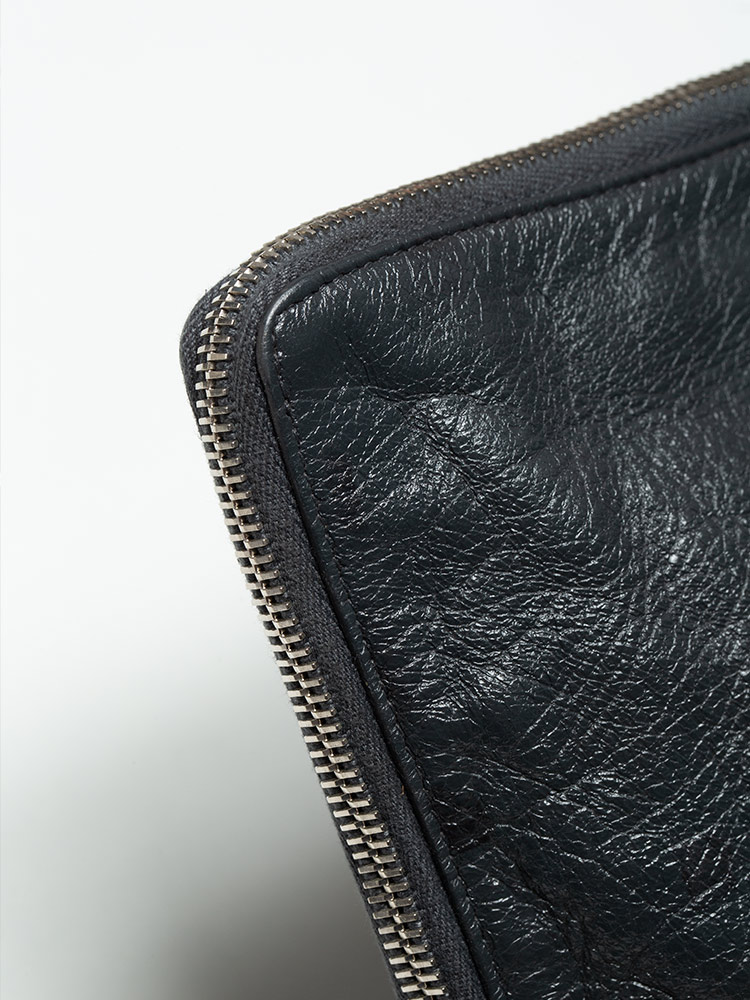 This pouch is crafted of distressed leather in gray. This clutch features all the hallmarks of classic Balenciaga bags including a facing zipper pocket, a leather zipper pull tassel, leather patches and belts,