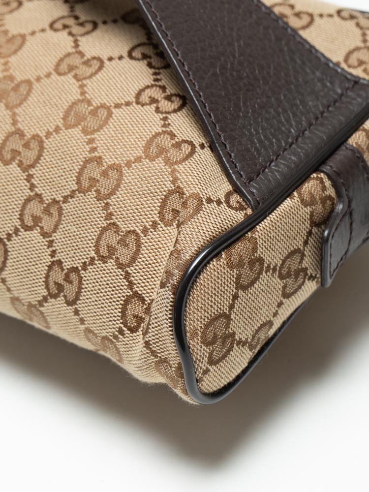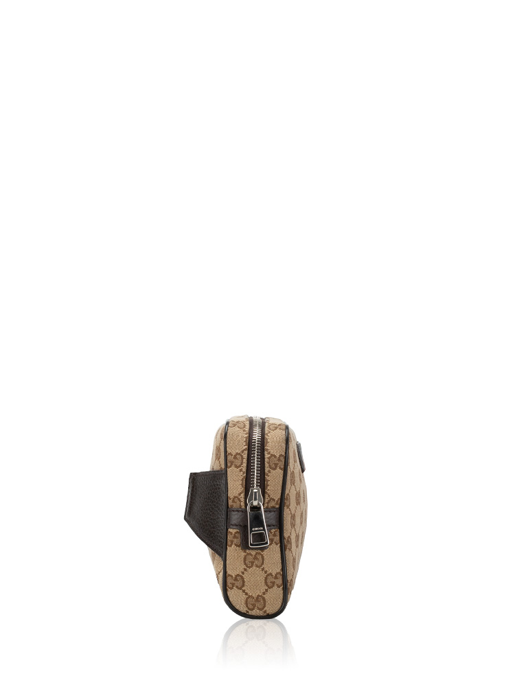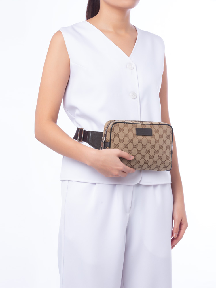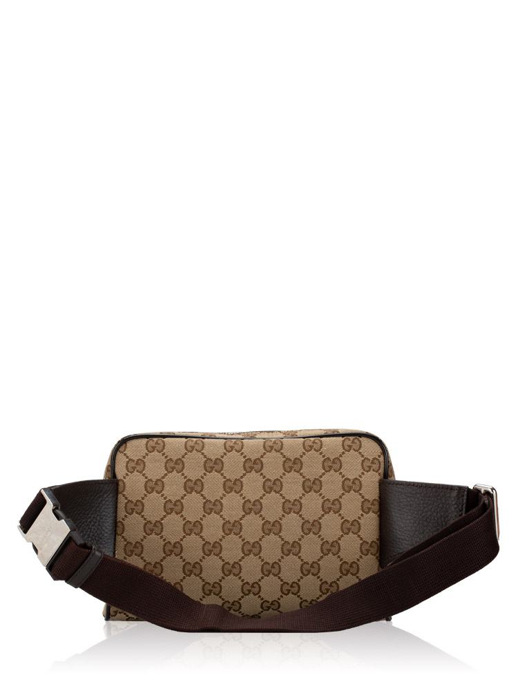 This belt bag is crafted of classic brown on beige Gucci GG monogram canvas and leather trim. The bag features a silver zipper top that opens to a fabric lining with a patch pocket.