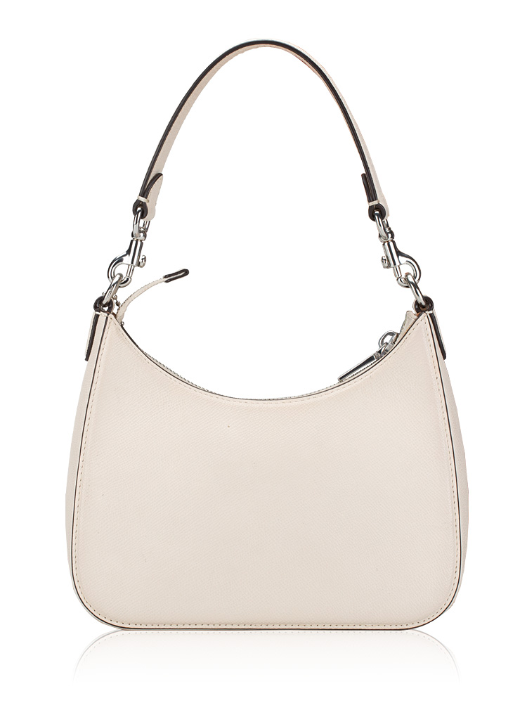 Made of crossgrain leather. The bag features a zip closure that opens to fabric lining with one card slot, one slip pocket, removable handle strap, adjustable and removable two long strap.