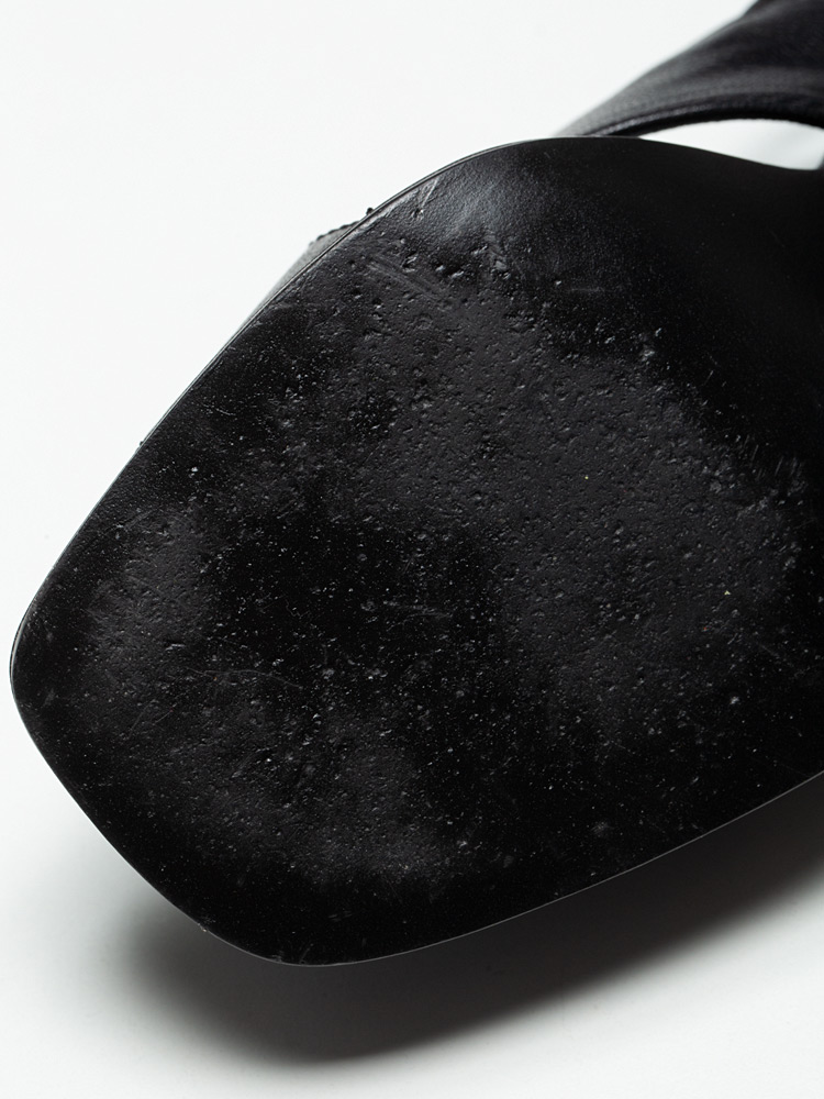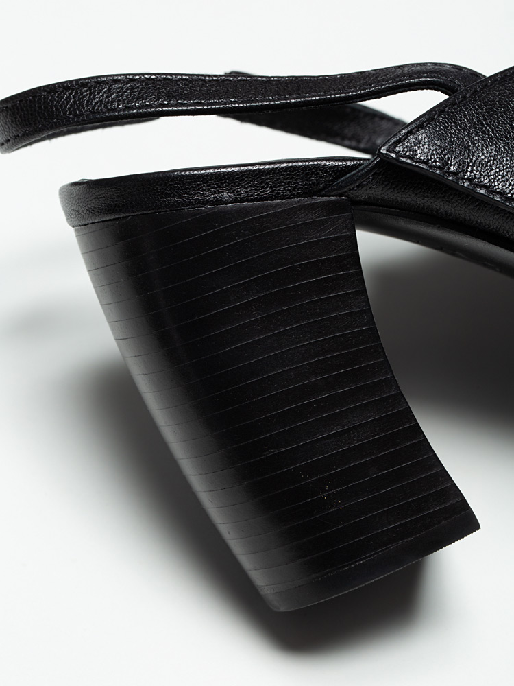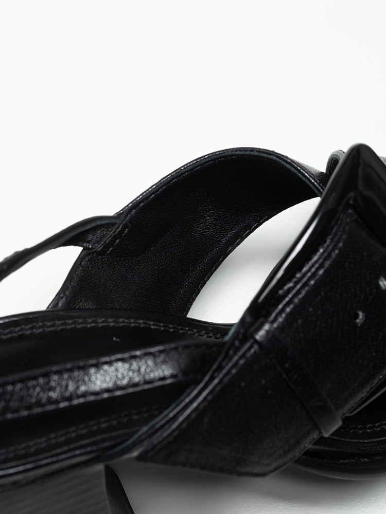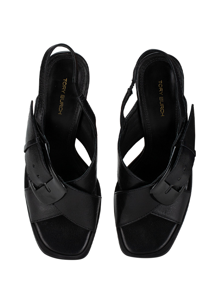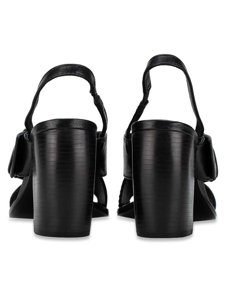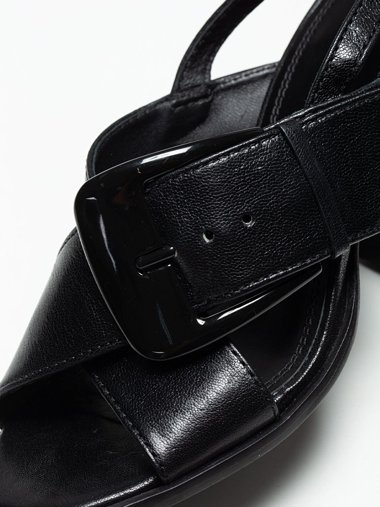 Our distinctive curved heel. Designed with an oversized buckle and crossover straps, our Banana Heel Sandal is crafted in soft, tumbled leather with a subtle shine.