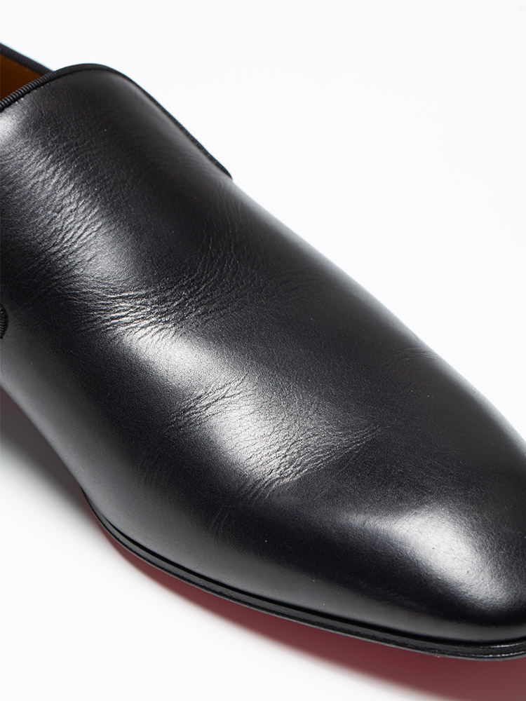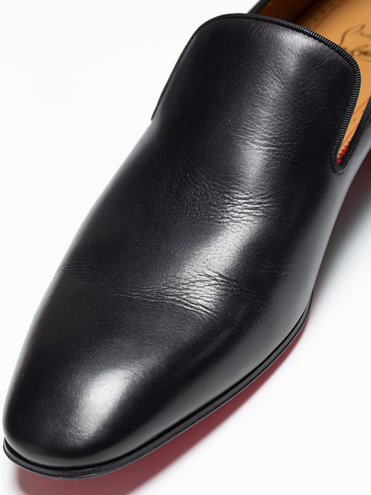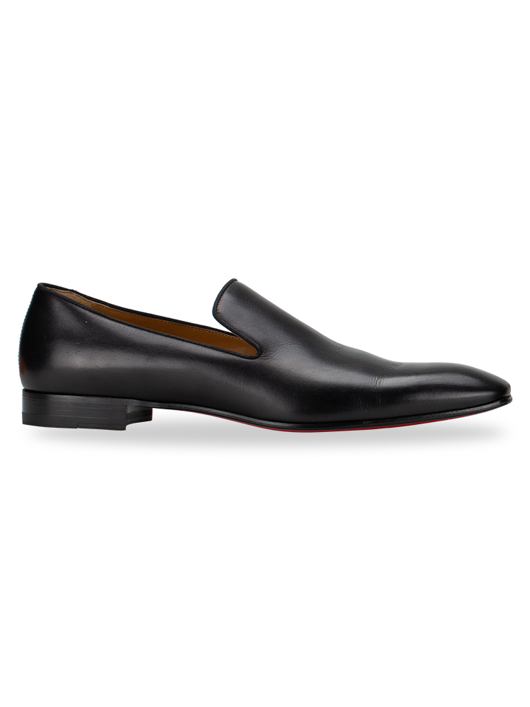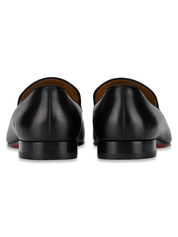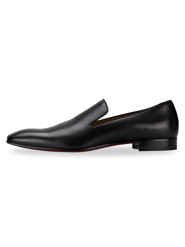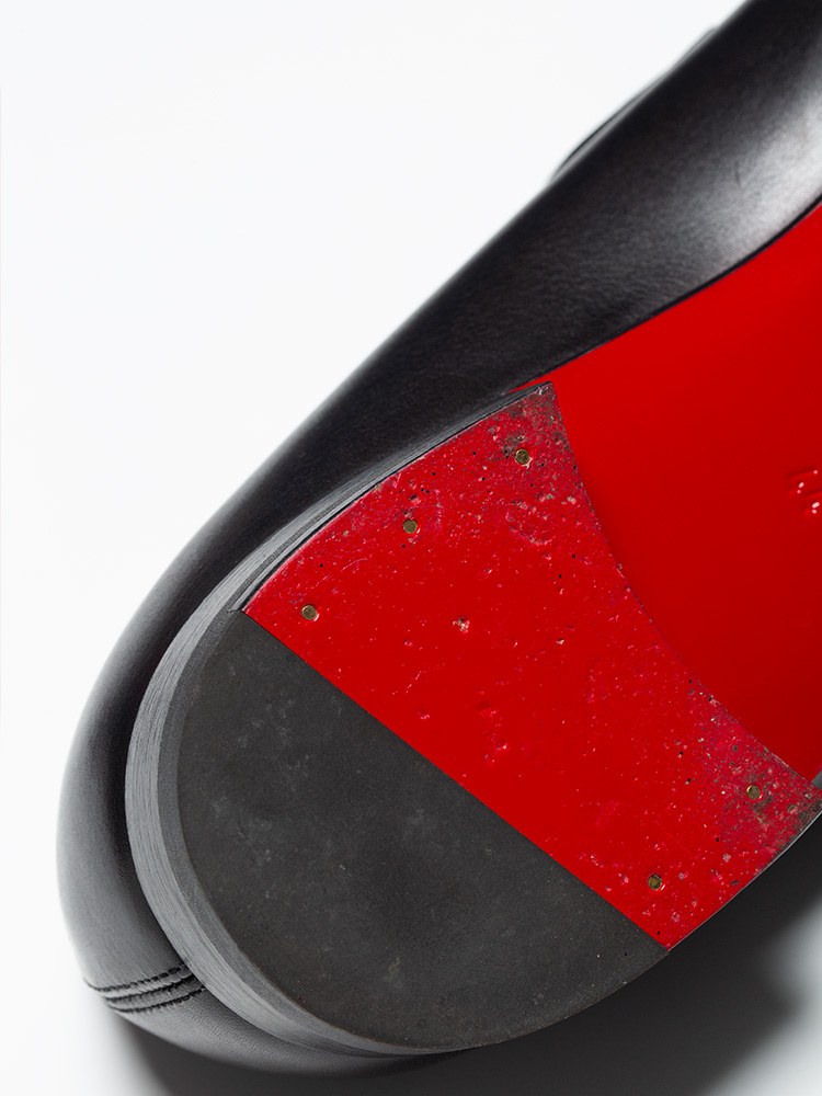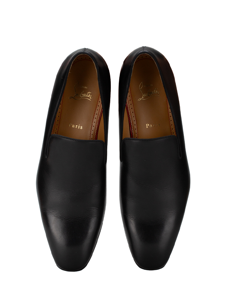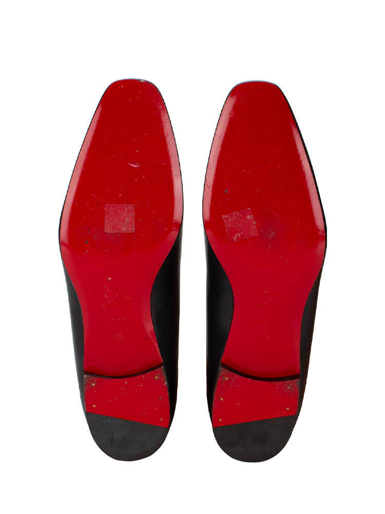 Crafted of calfskin leather and a fabric trim. The shoes feature rounded toe and the iconic shiny red lacquered soles.