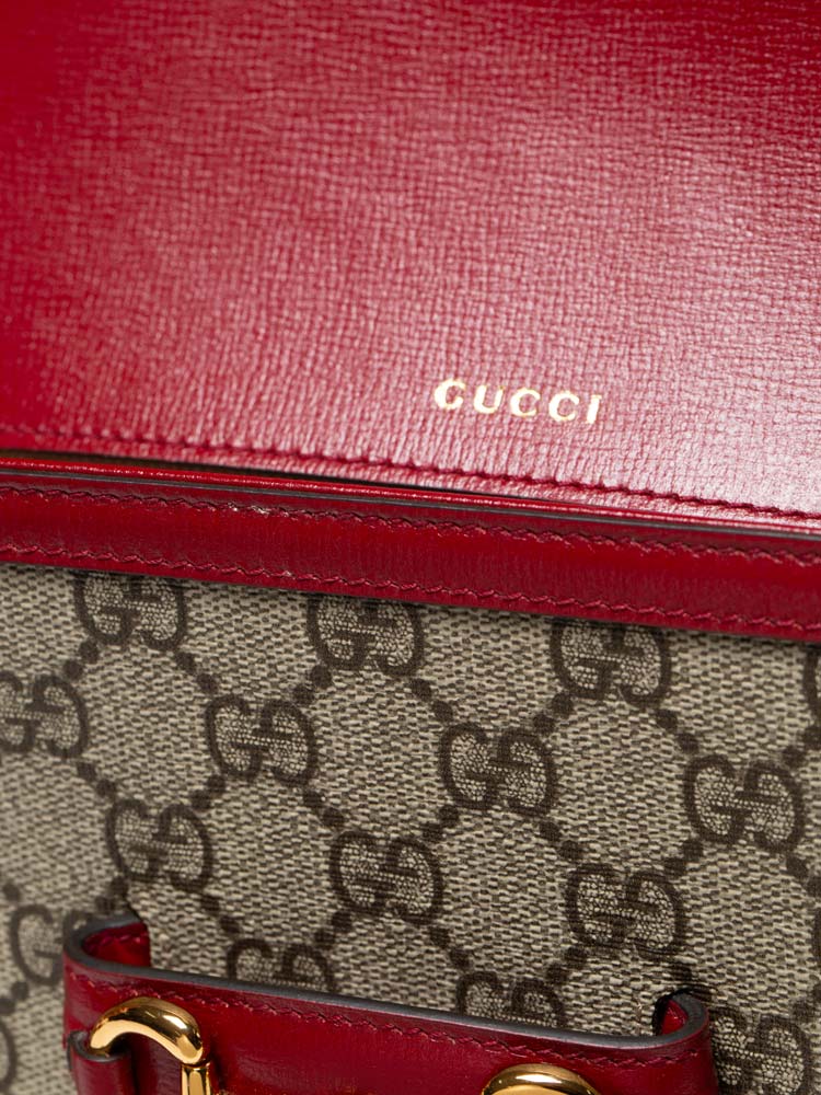 Crafted of Gucci G supreme coated canvas. Features with an optional adjustable leather shoulder strap and horsebit detail. The top flap opens to a fabric interior.
