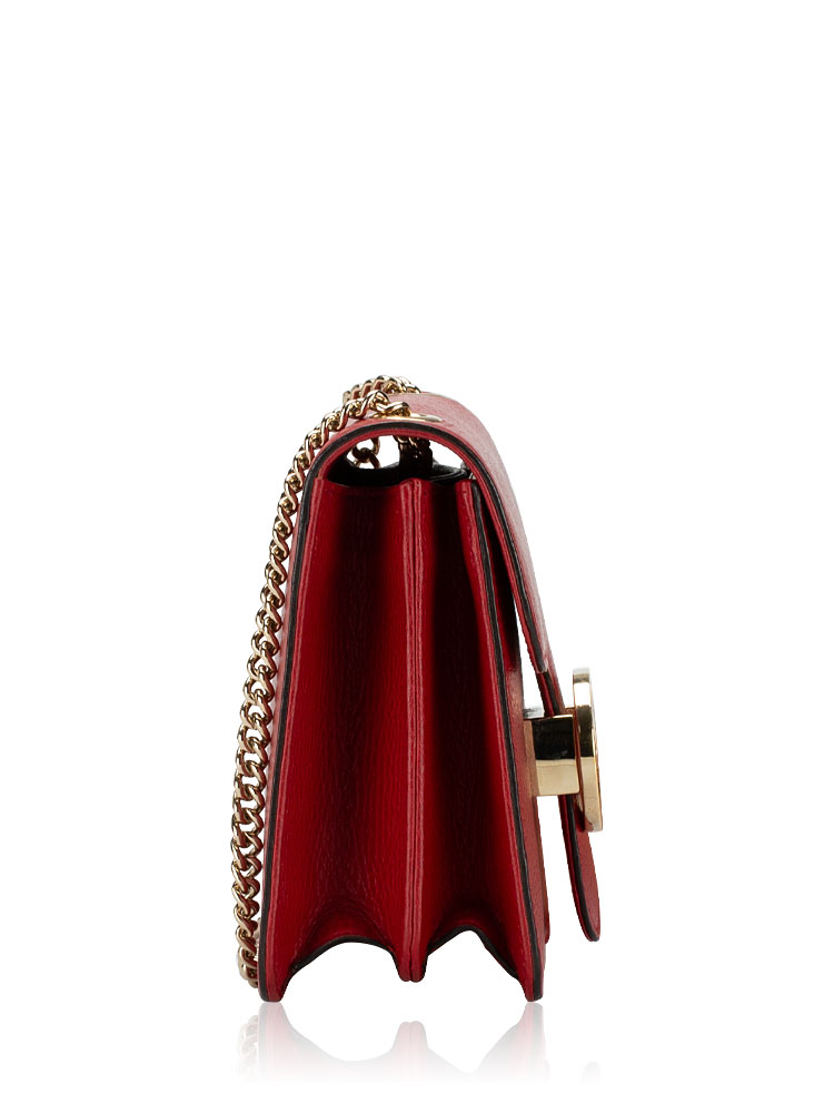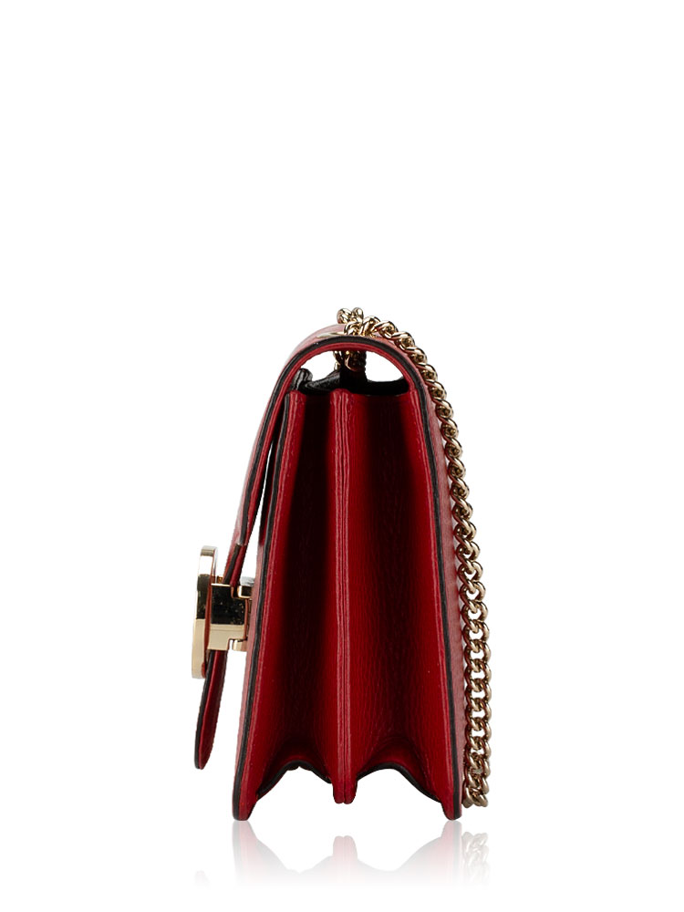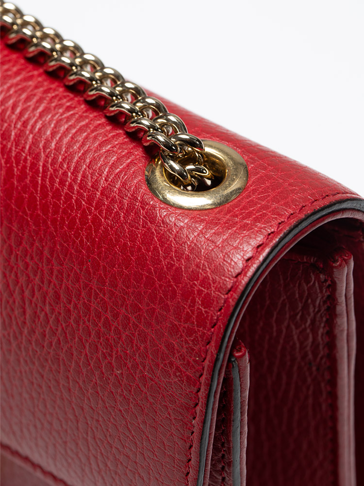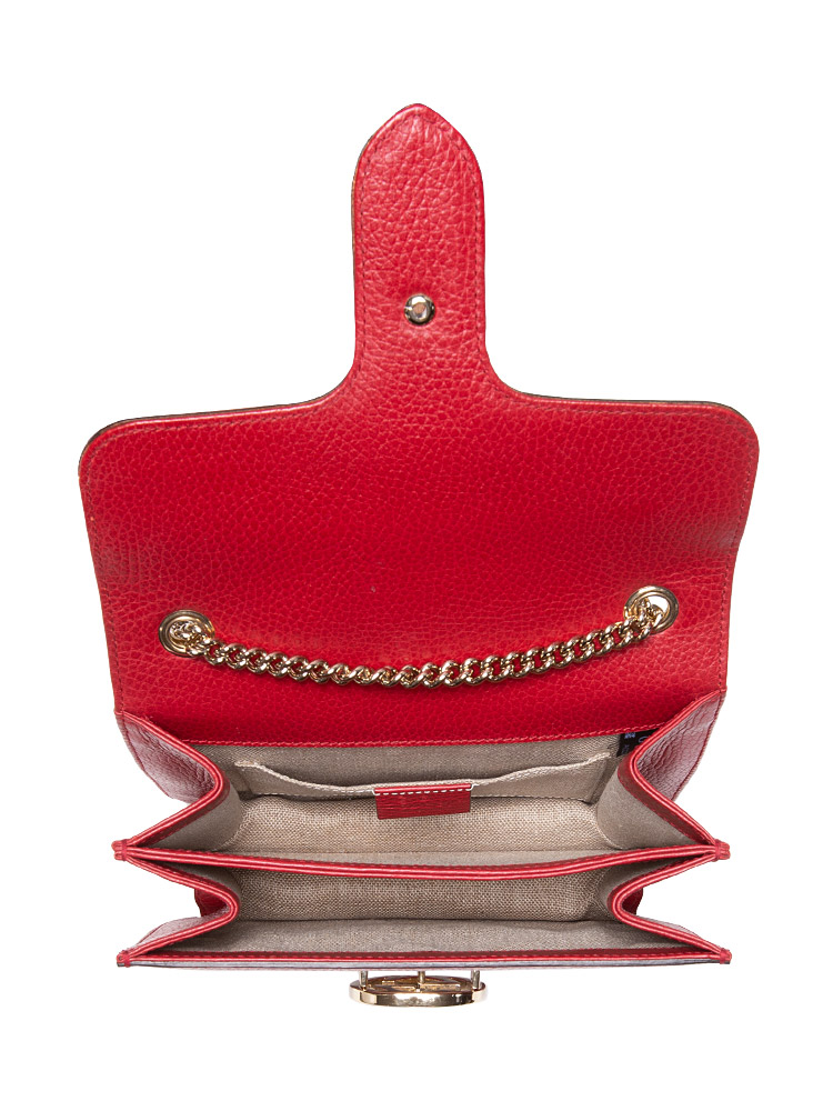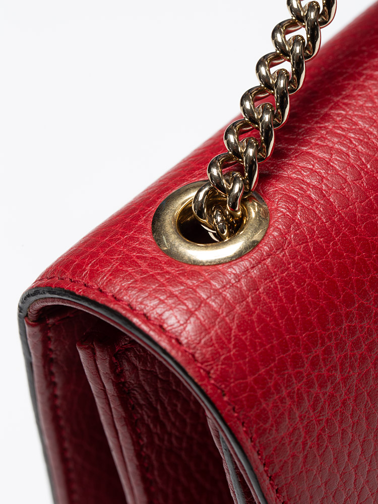 Crafted of calfskin material. It features chain strap with leather pad, and a matching gold interlocking GG flip-lock on the crossover flap. This opens to a partitioned beige fabric interior with a patch pocket.