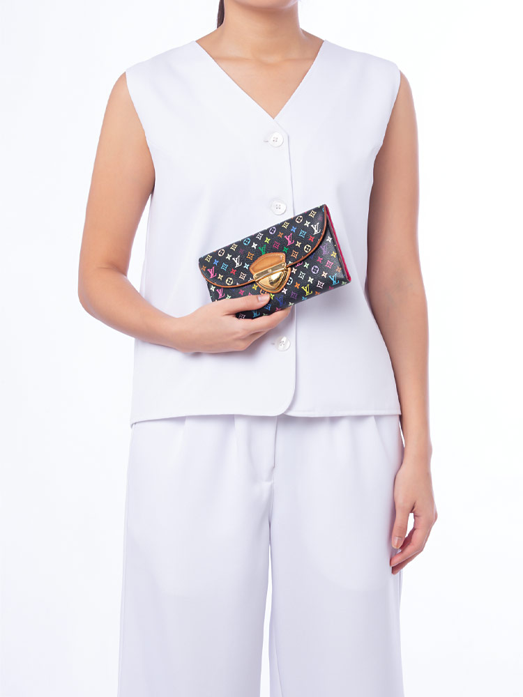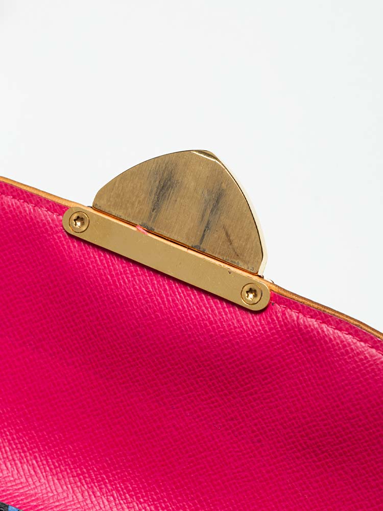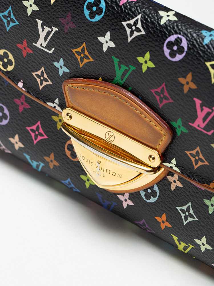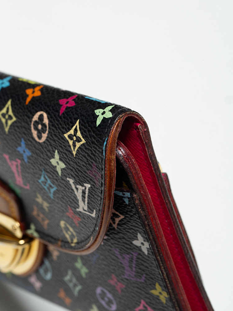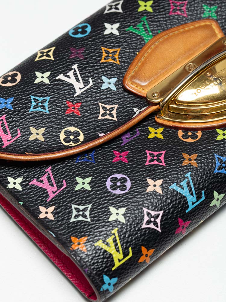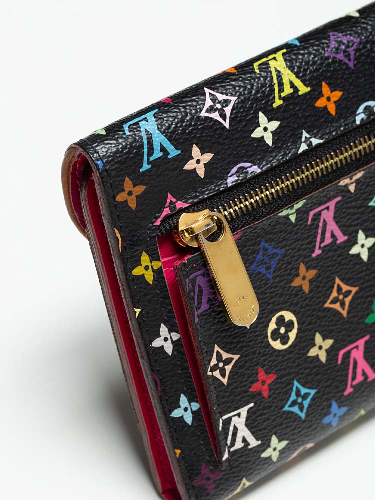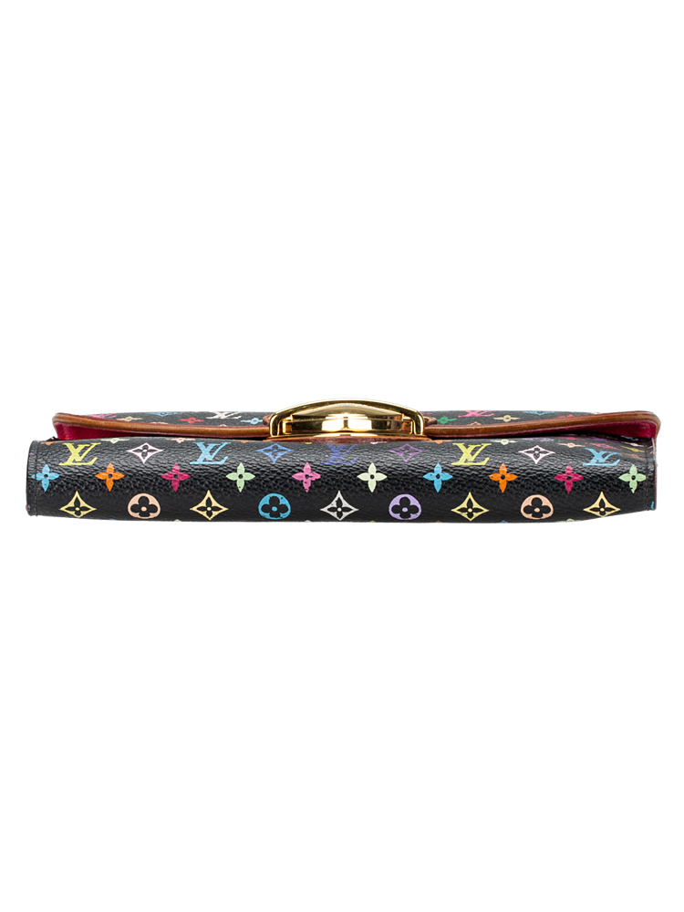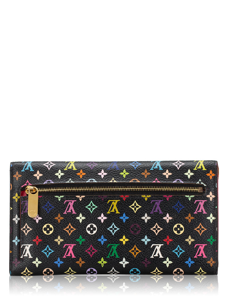 This wallet is crafted of Multicolore monogram. Features with a rear zipper pocket, a frontal flap with cowhide leather trim, and a push lock. This opens to a leather interior of card slots, patch pockets, billfolds, and an ID window.