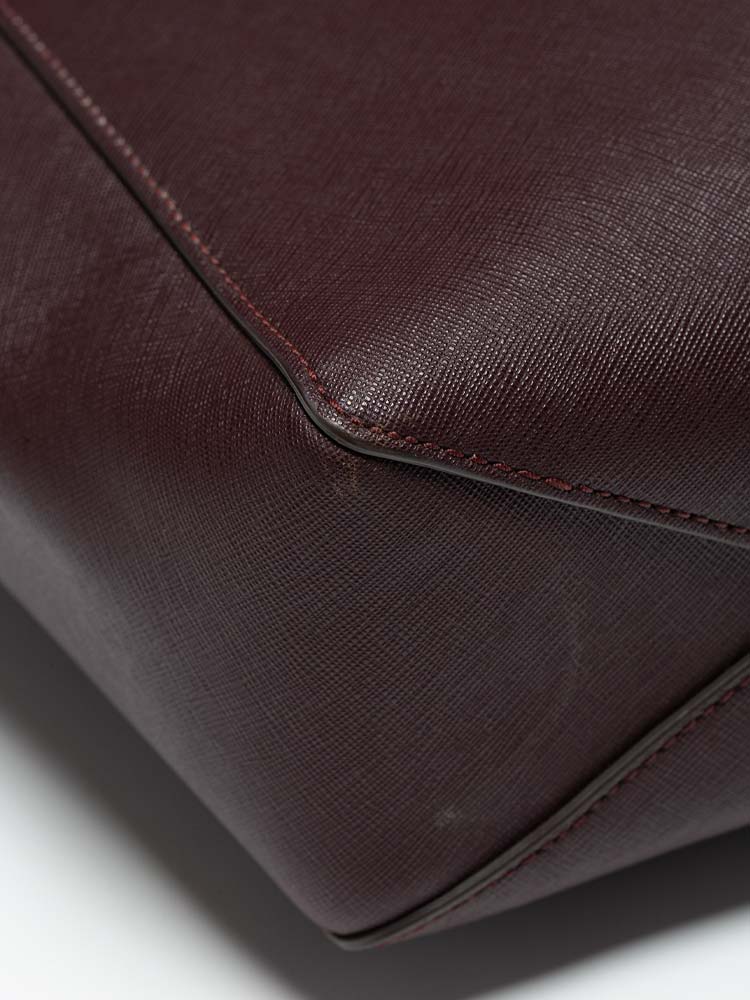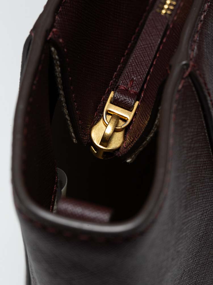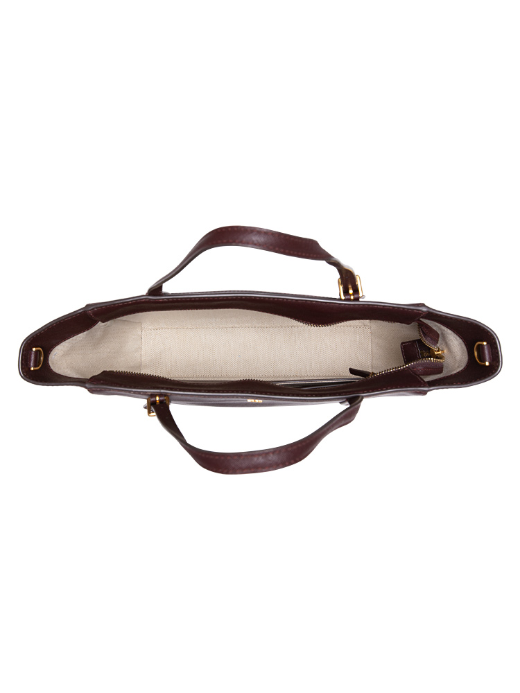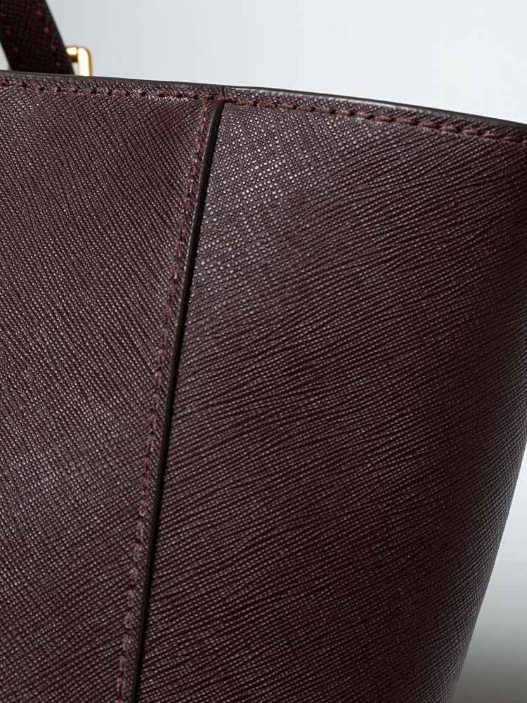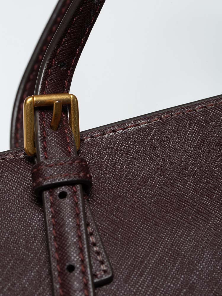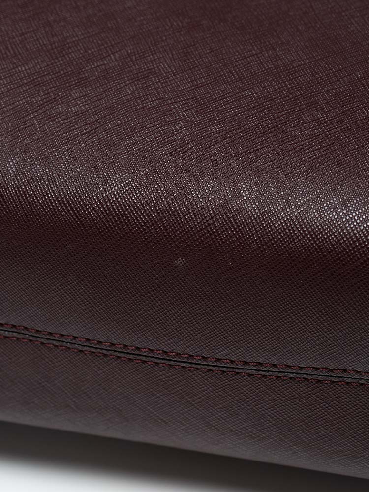 Made of saffiano leather. The bag features a zip closure that opens to canvas lining with one zip pocket, one slip pocket, exterior one slip pocket at back, adjustable and removable long strap.