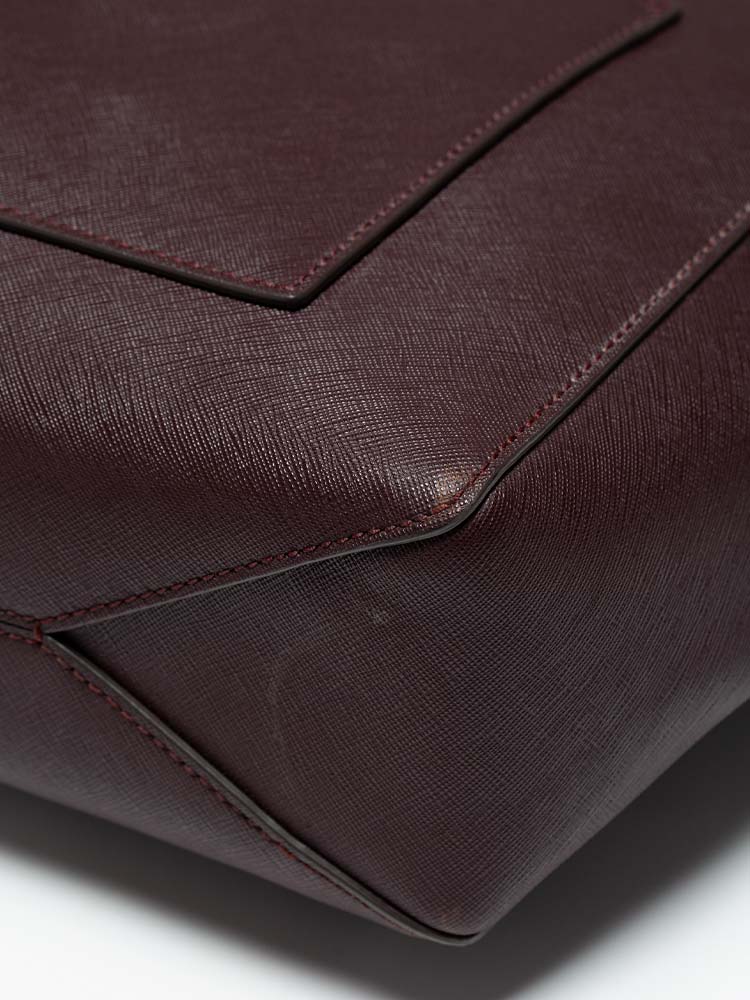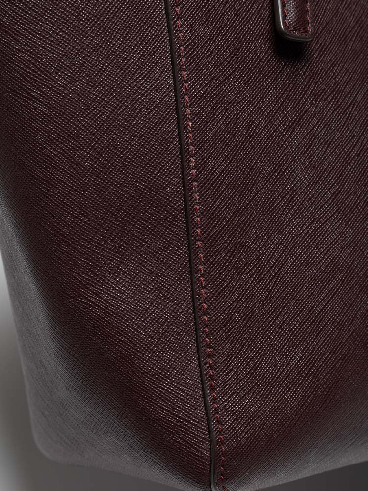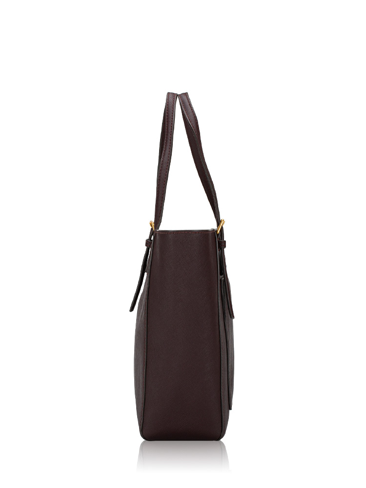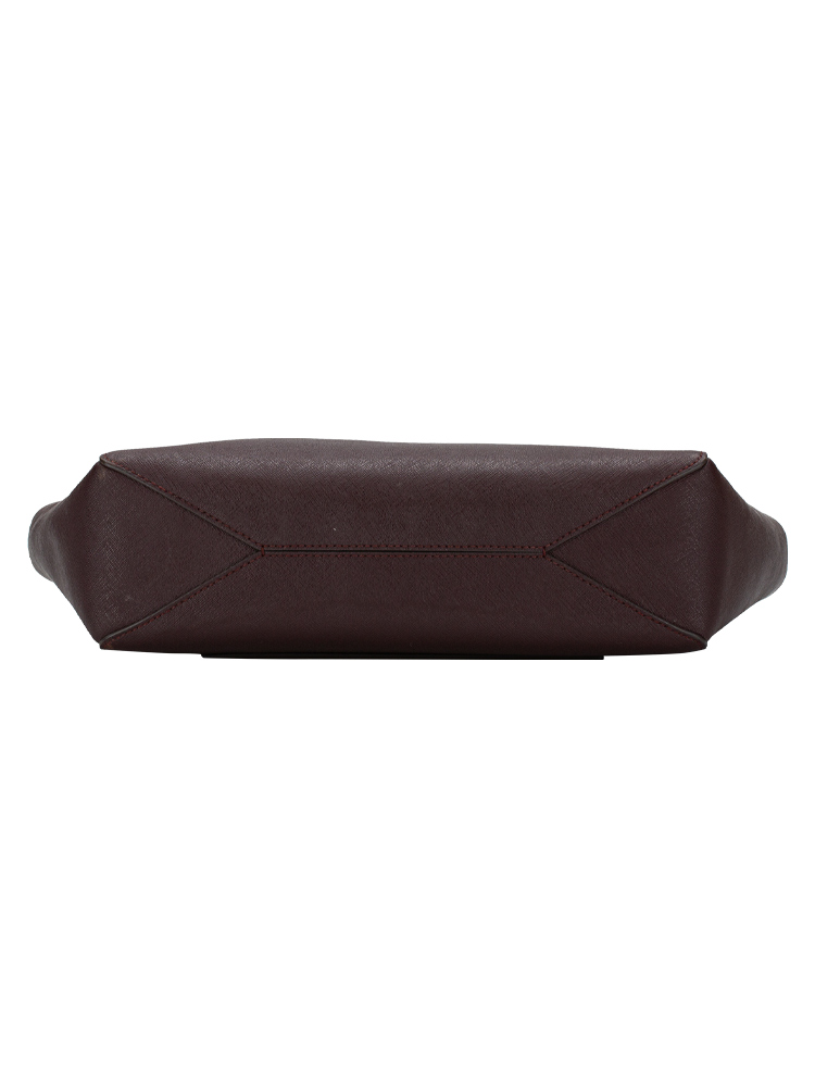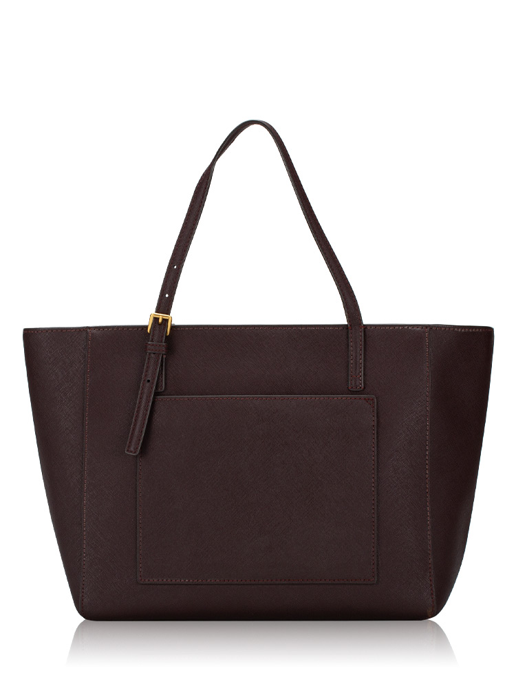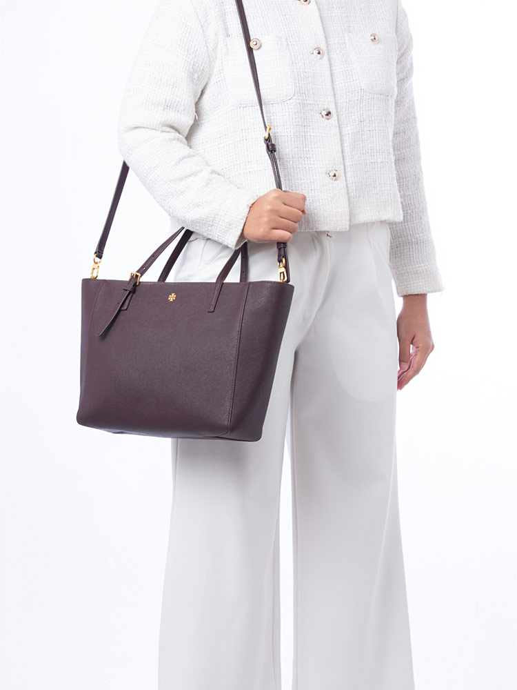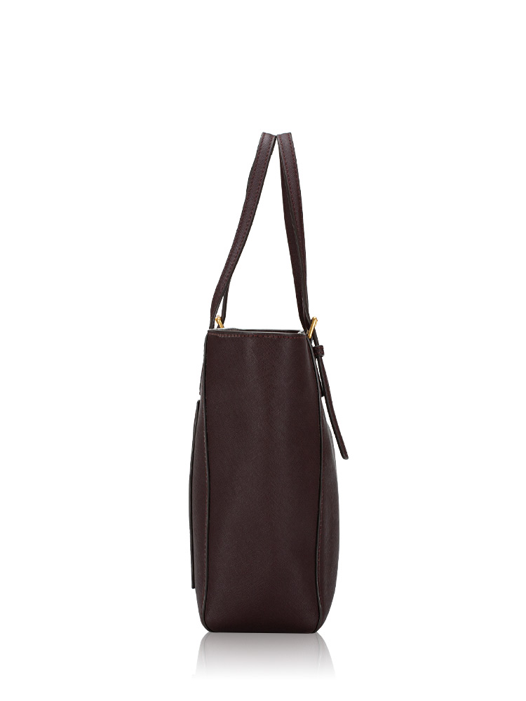 Made of saffiano leather. The bag features a zip closure that opens to canvas lining with one zip pocket, one slip pocket, exterior one slip pocket at back, adjustable and removable long strap.