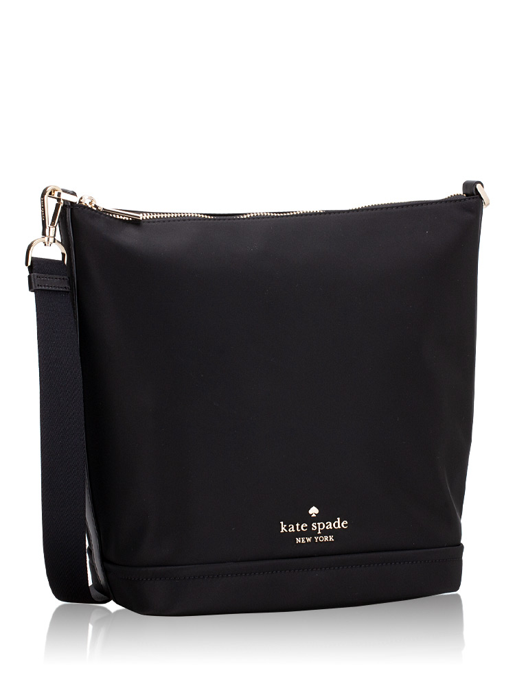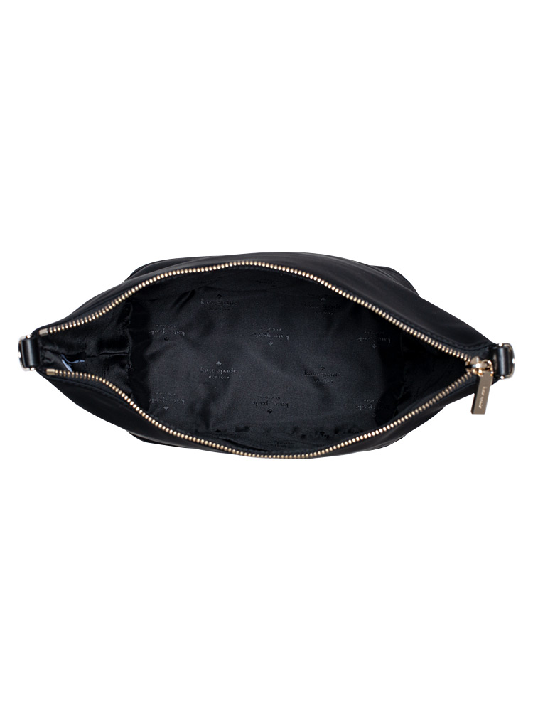 Made of nylon with logo polyester lining material. The bag features an zip closure, gold tone hardware, one zip pocket, and one slip pocket.