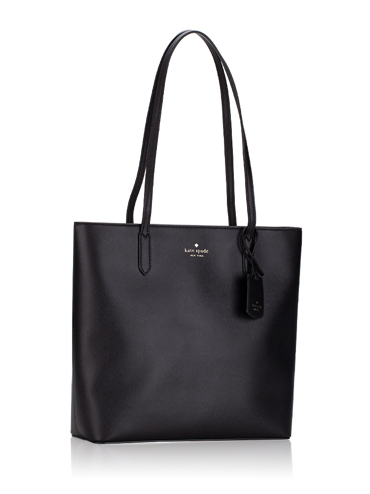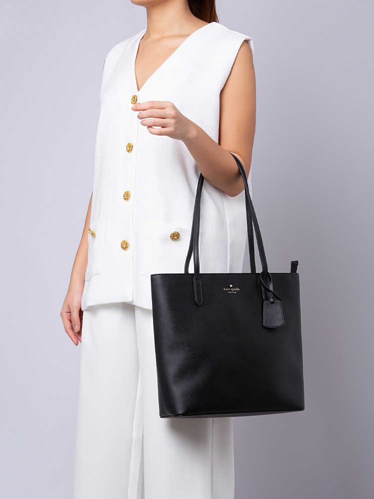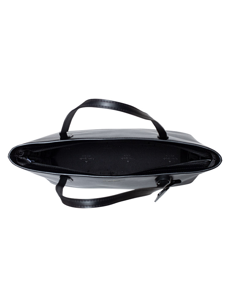 Made of saffiano PVC. The bag features a zip closure that opens to polyester lining with two slip pockets, double handles strap drop 29 cm.
