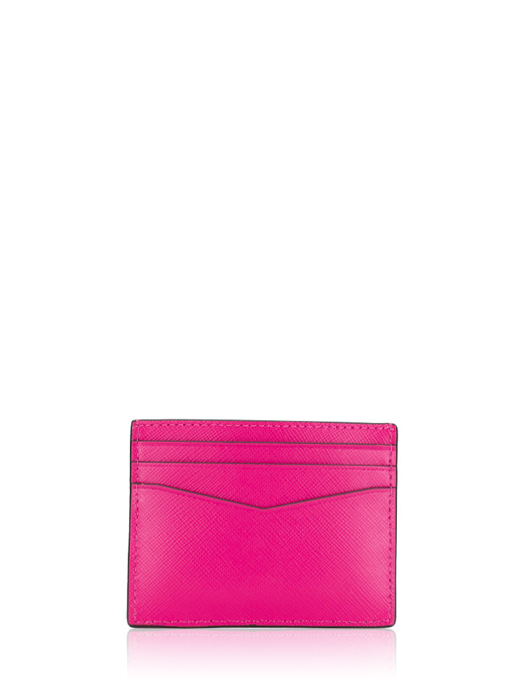 Crafted of saffiano pvc and two way spade jacquard lining. It features a center open compartment and 6 card slots.