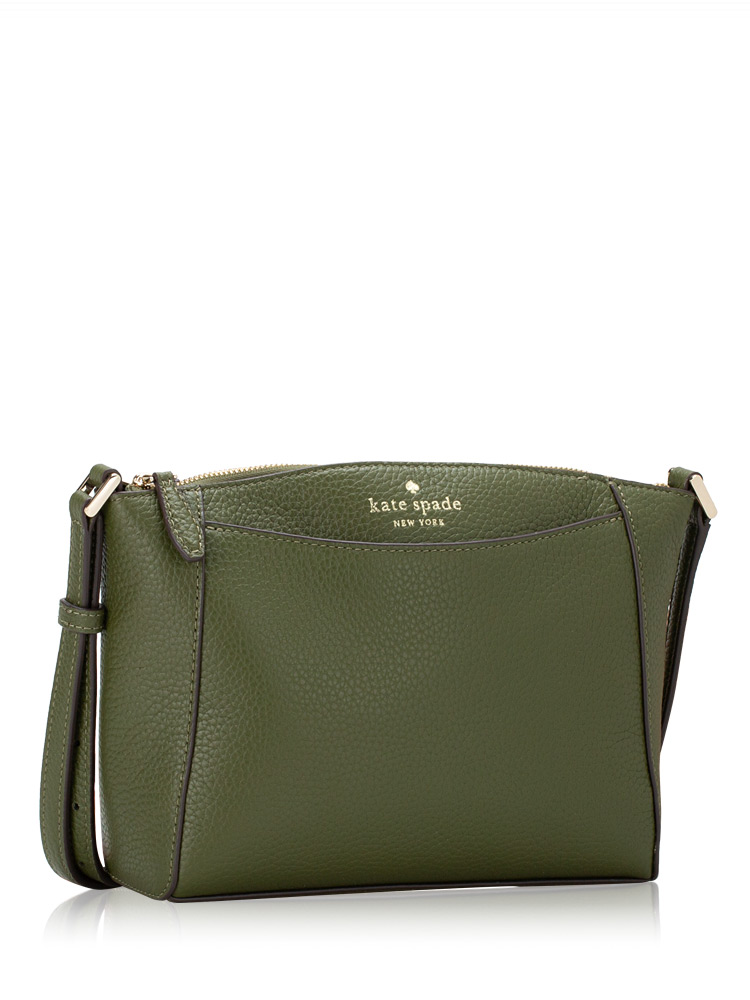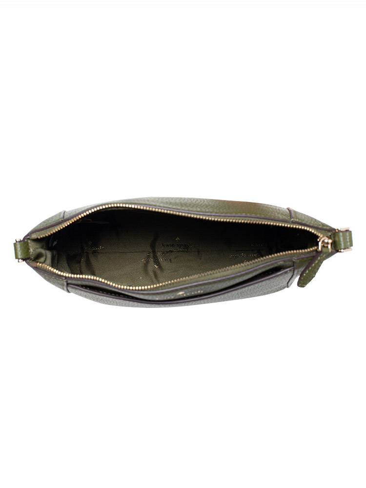 Made of pebbled leather. The bag features a zip closure that opens to polyester lining with one slip pocket, one zip pocket, exterior one slip pocket at front, adjustable strap.