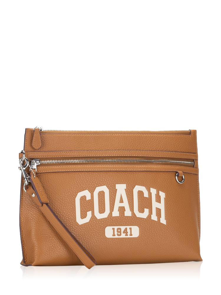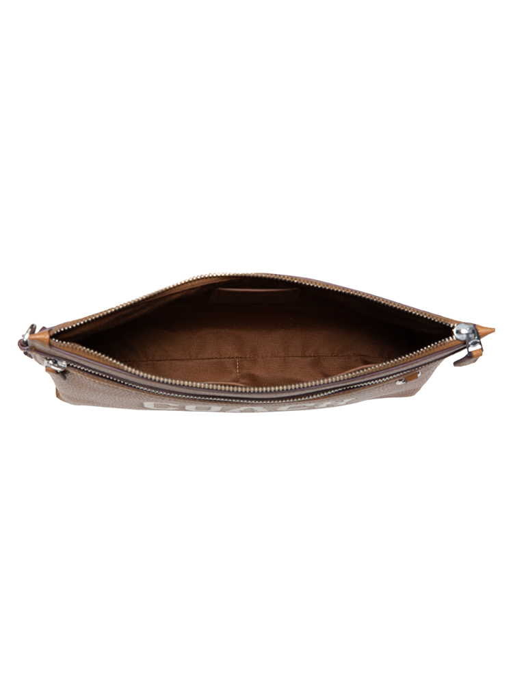 Made of refined pebble leather with fabric lining. The pouch features an open zip closure, silver tone hardware, two slip pockets, and one front exterior zip pocket.