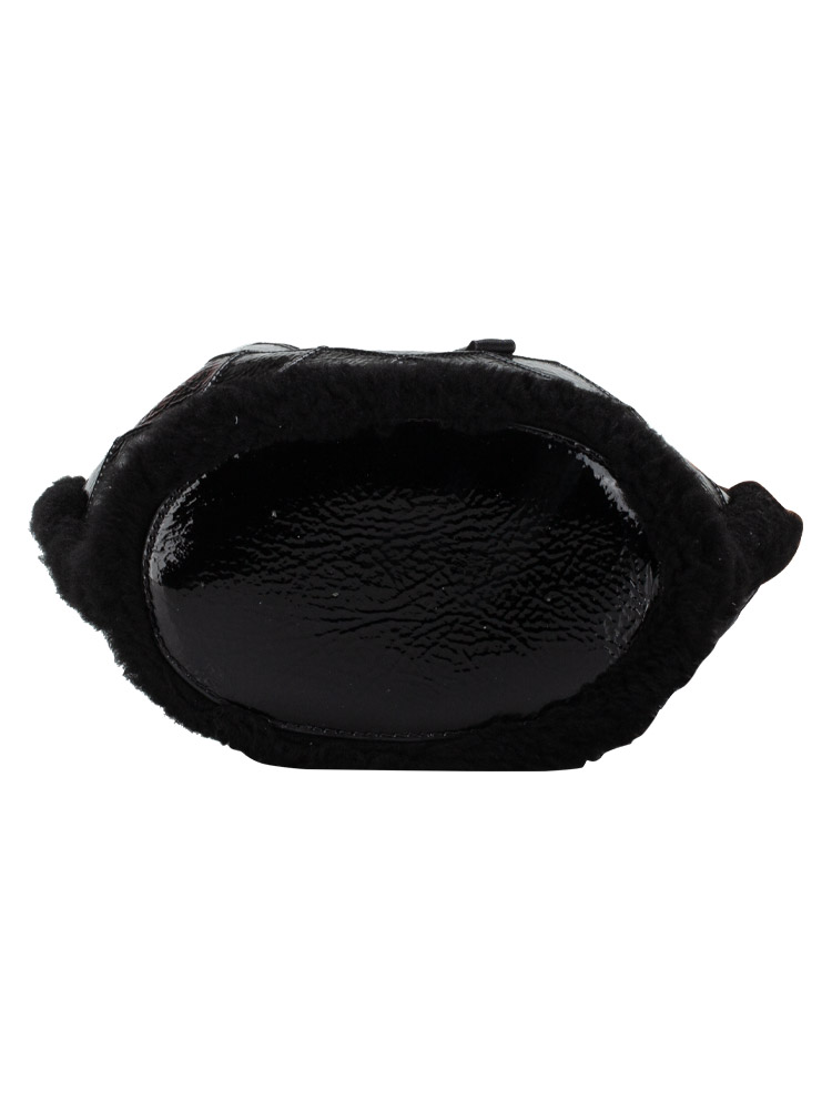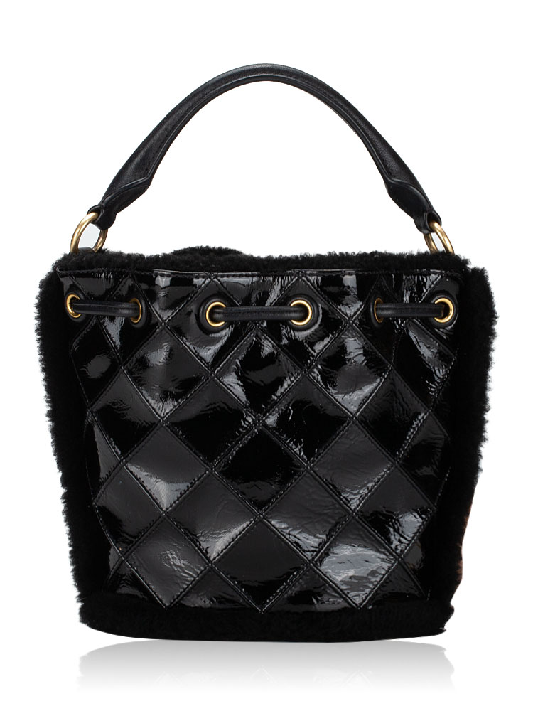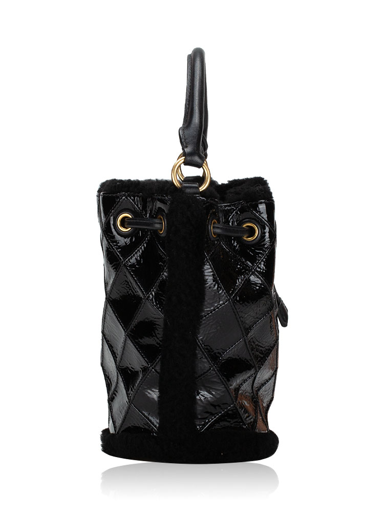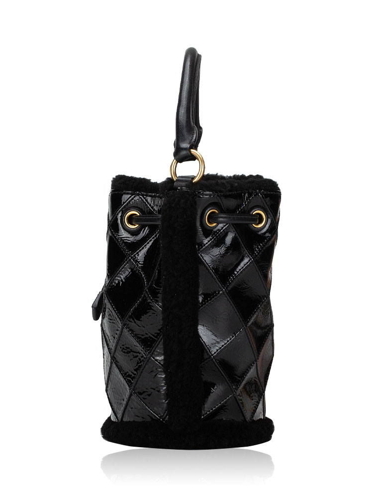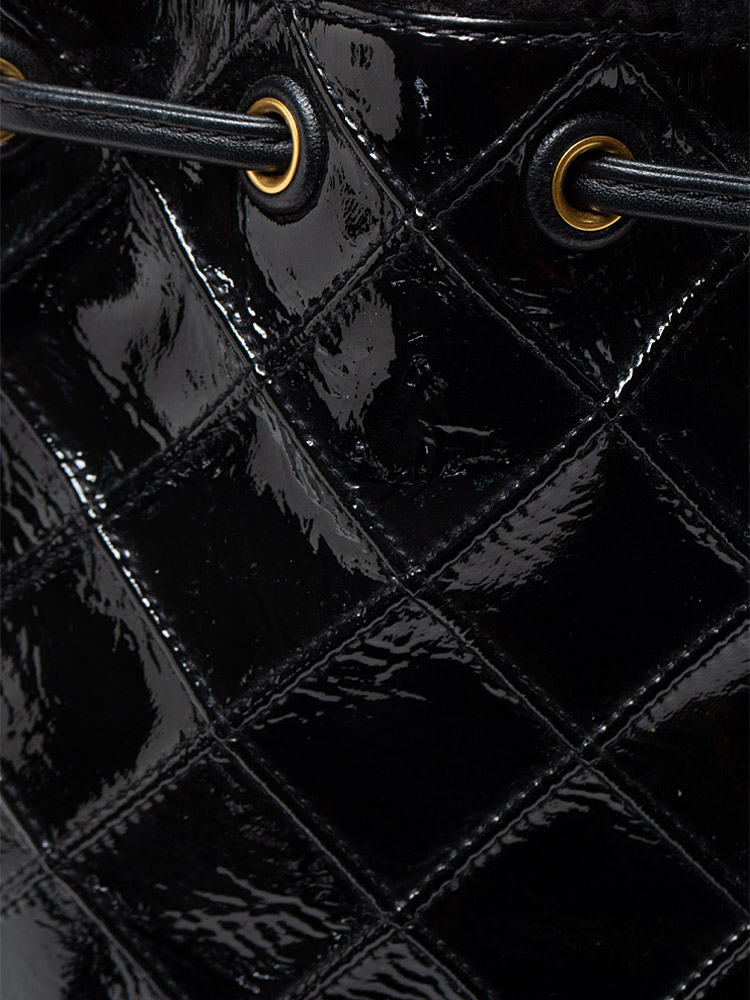 Made of patent leather. The bag features a drawstring closure that opens to fabric lining, adjustable and removable long strap.