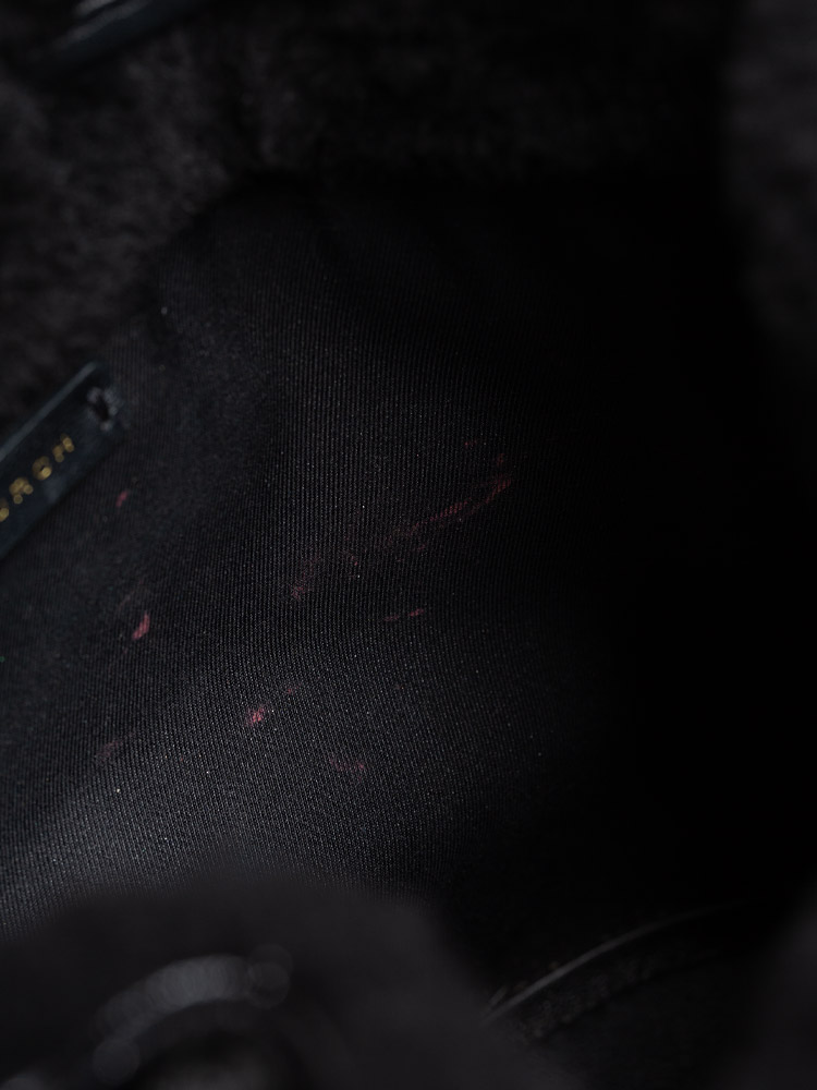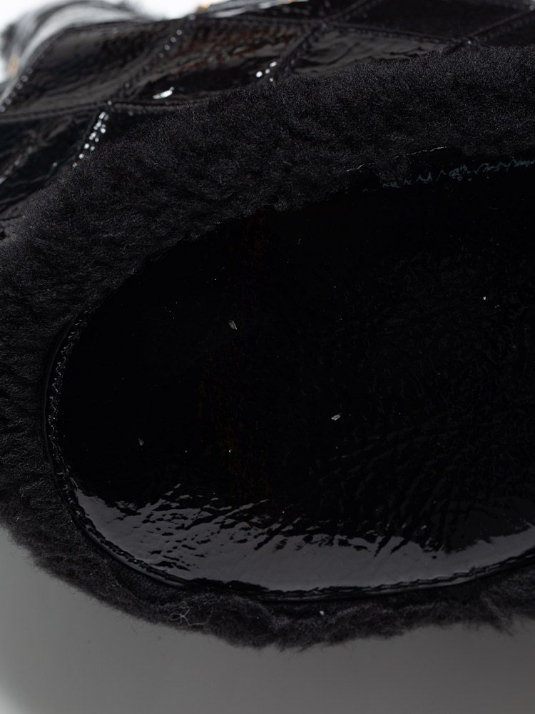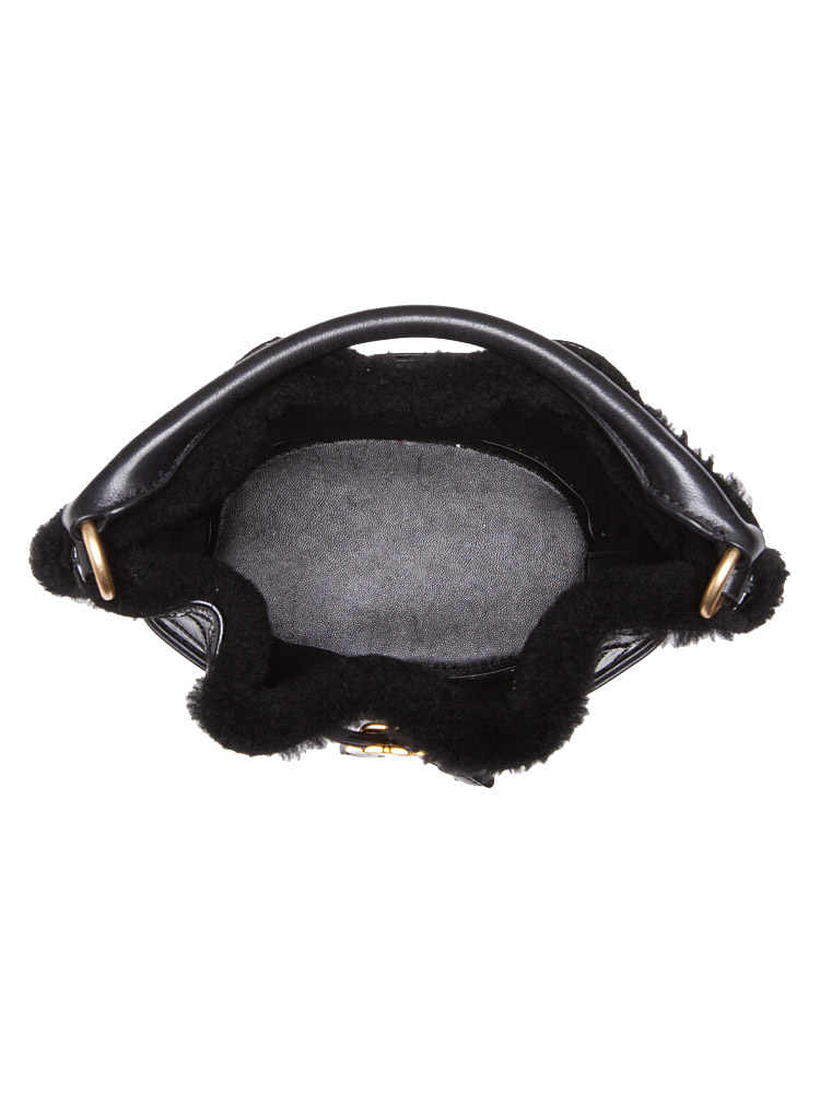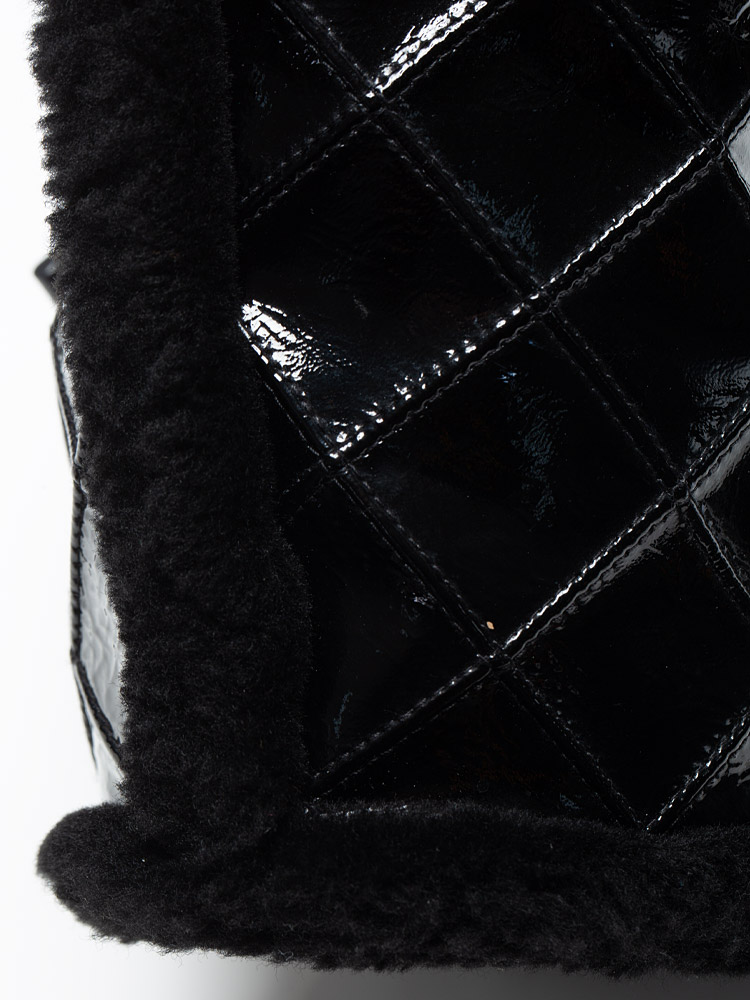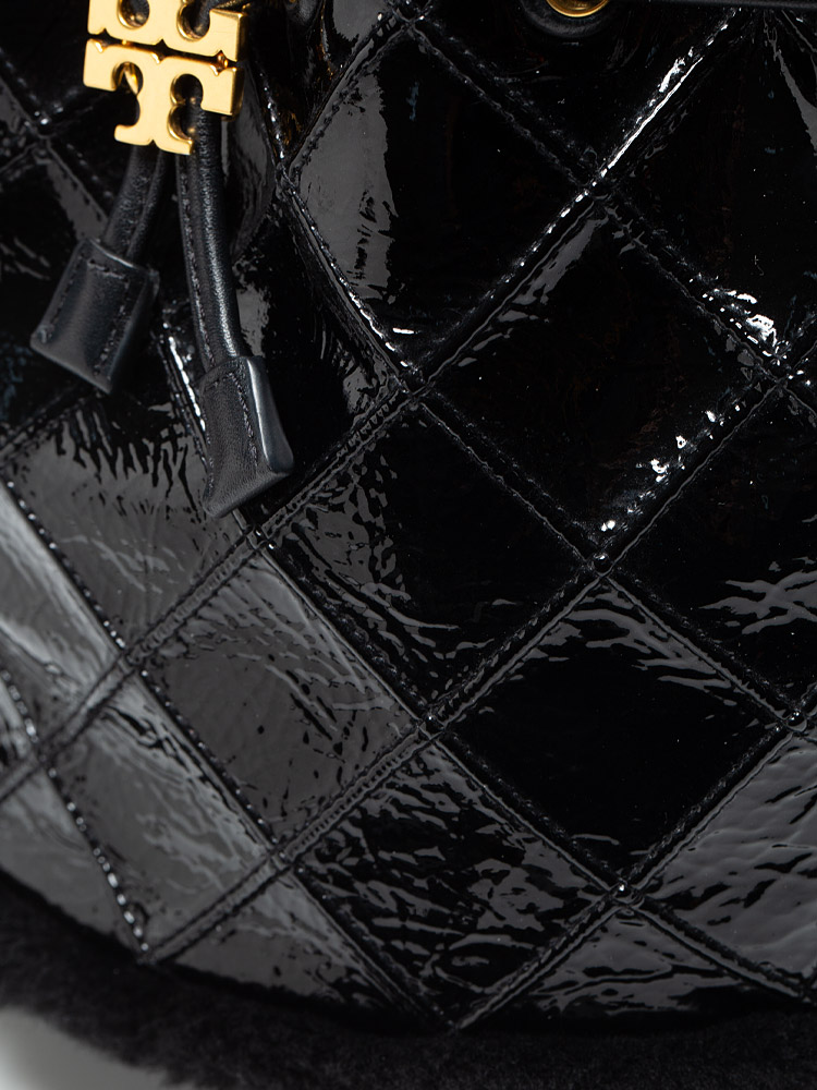 Made of patent leather. The bag features a drawstring closure that opens to fabric lining, adjustable and removable long strap.