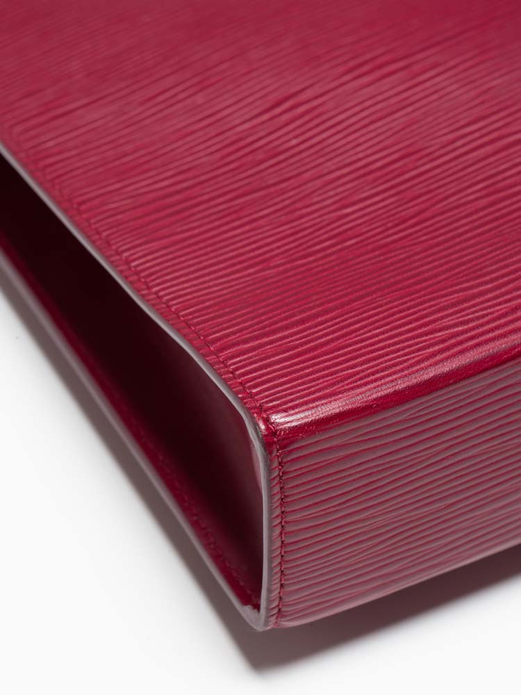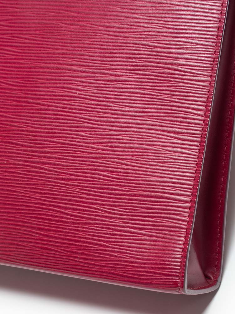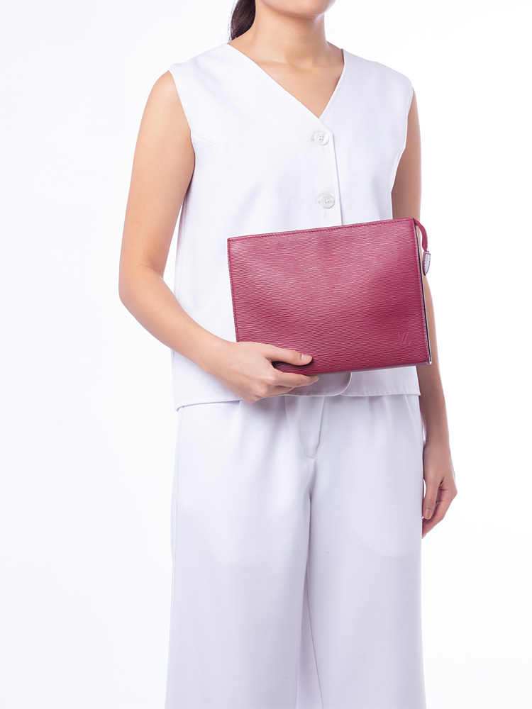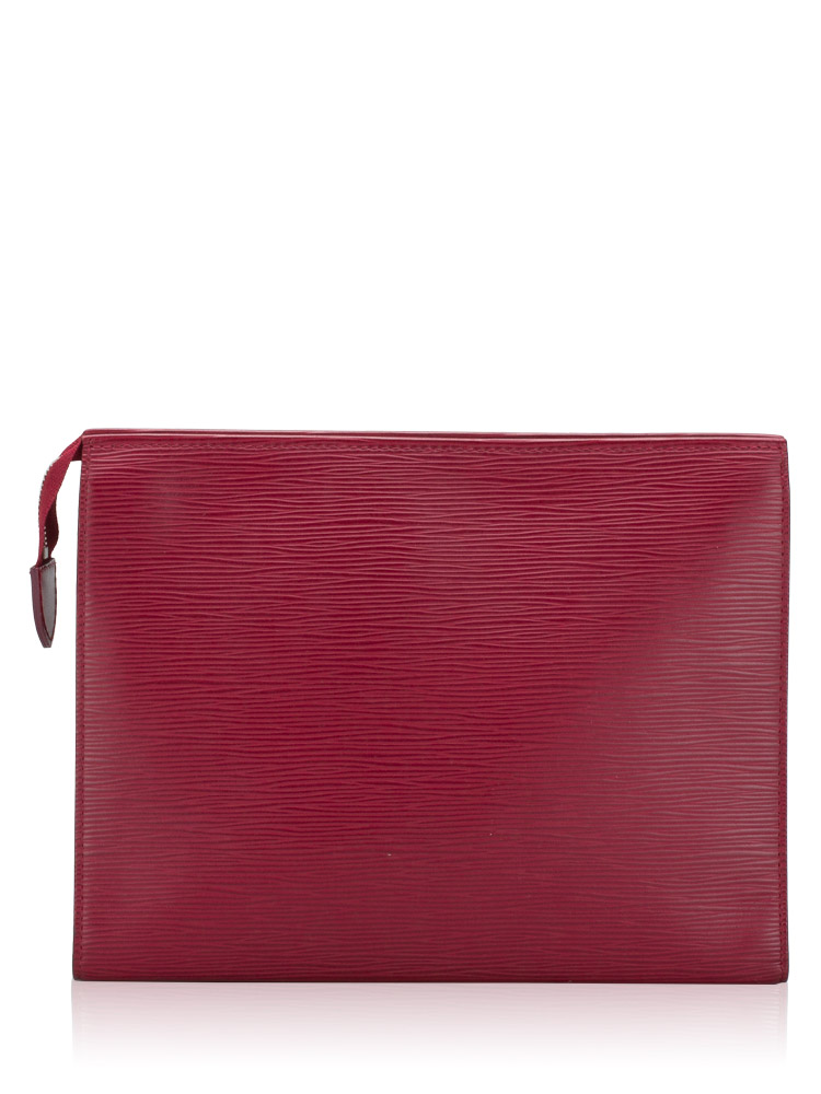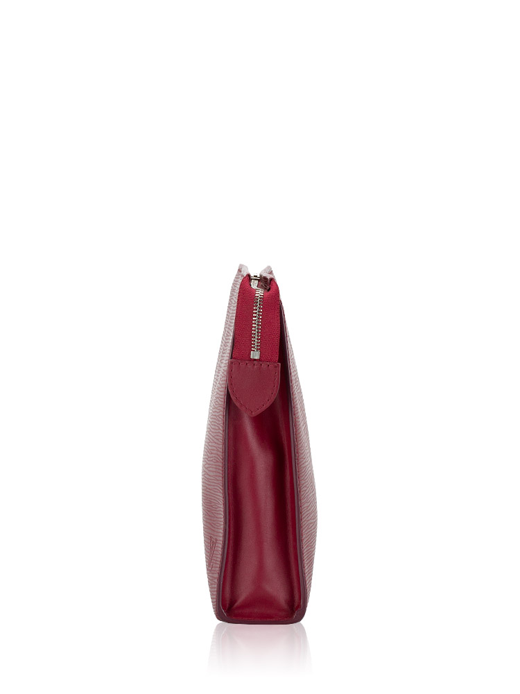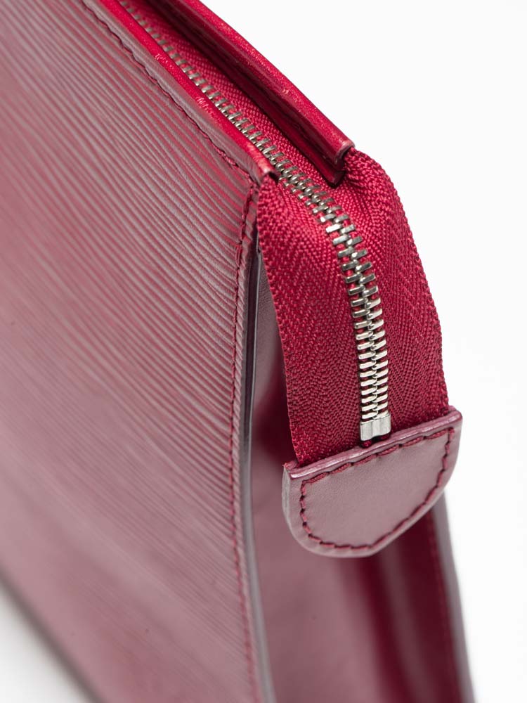 The case is made of textured epi leather. This features a polished silver top zipper which opens to a leather interior with a patch pocket.