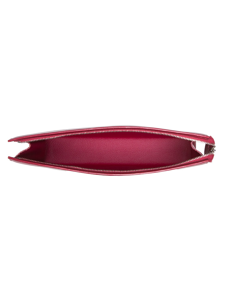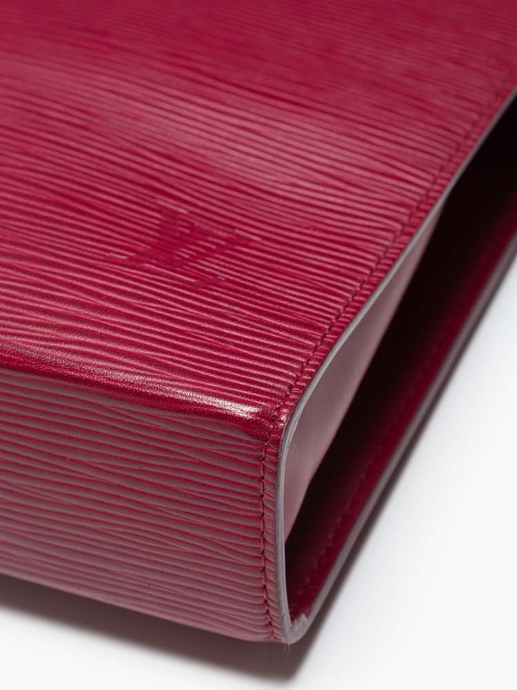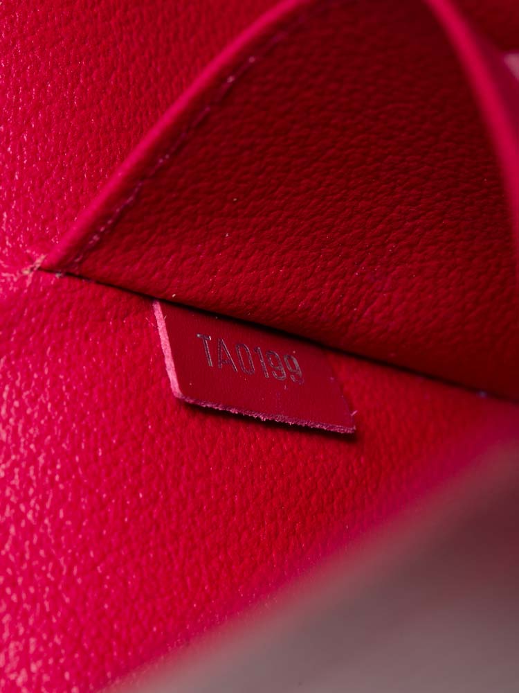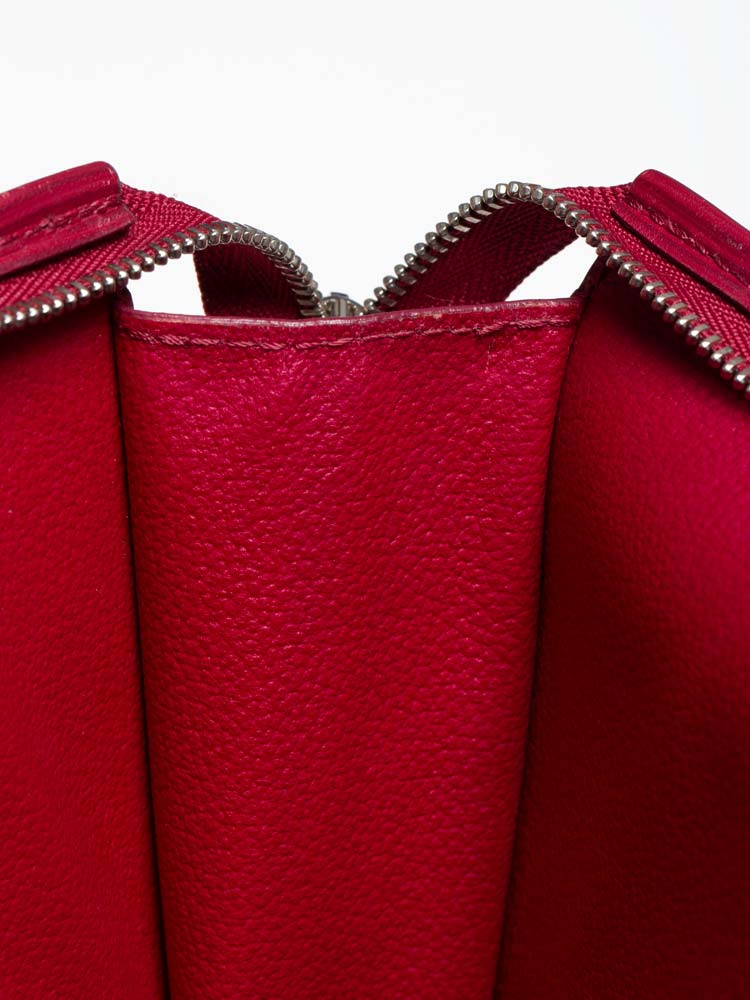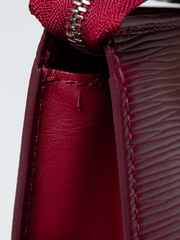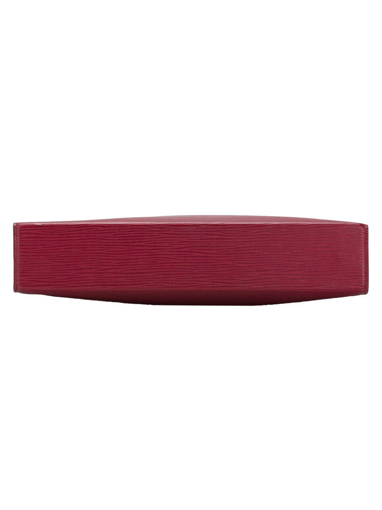 The case is made of textured epi leather. This features a polished silver top zipper which opens to a leather interior with a patch pocket.