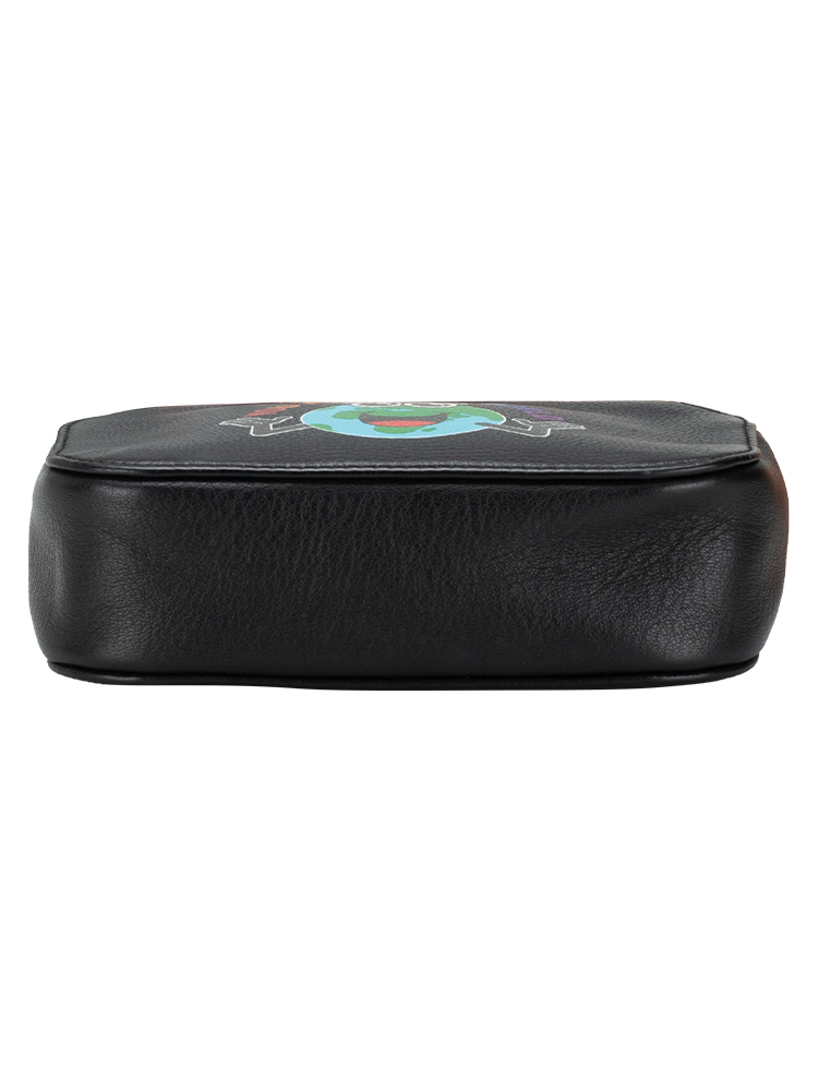 Crafted of textured calfskin leather. The handbag features a rear patch pocket, adjustable leather shoulder strap, and an adorable earth print on the front. it opens to a leather interior.